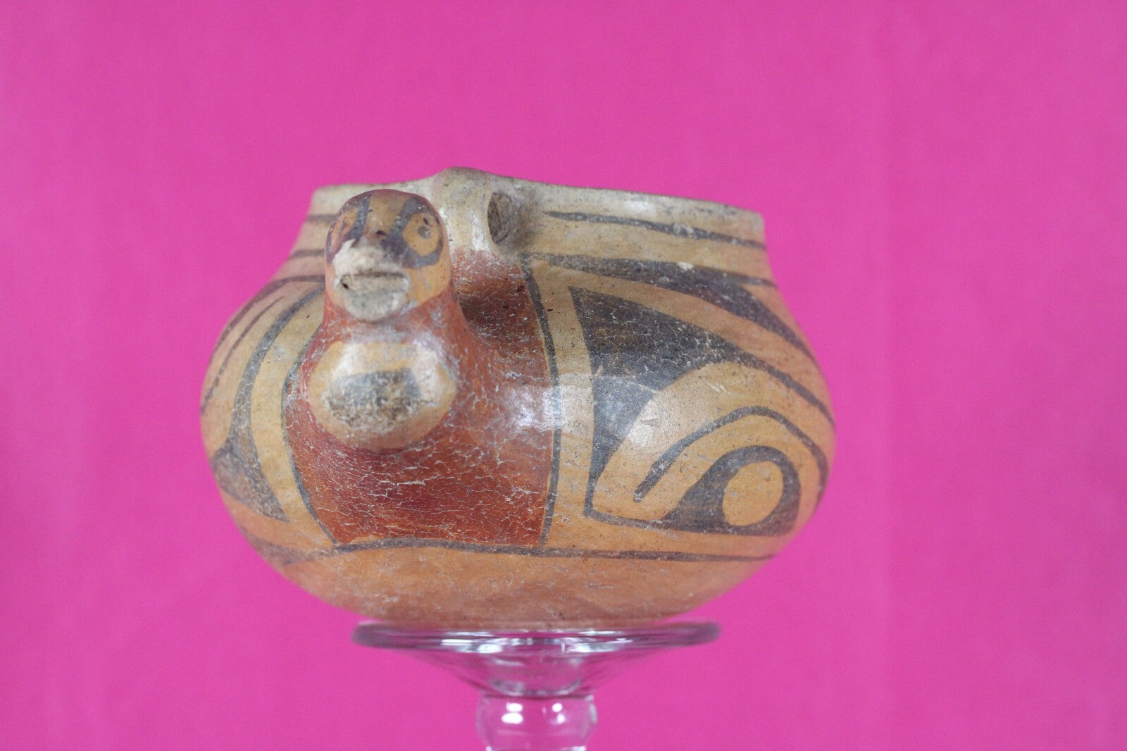 Museum quality. Polychrome decorated pottery avian shape bowl, having a projecting head and tail, wide opening at the top with opposing perforated lug handles. Decorated on both sides with stylized, black painted wings. Overall scattered mineral deposits on the surface. Tiny probe hole in the bottom, some ancient loss to his beak, otherwise intact. A very scarce type.