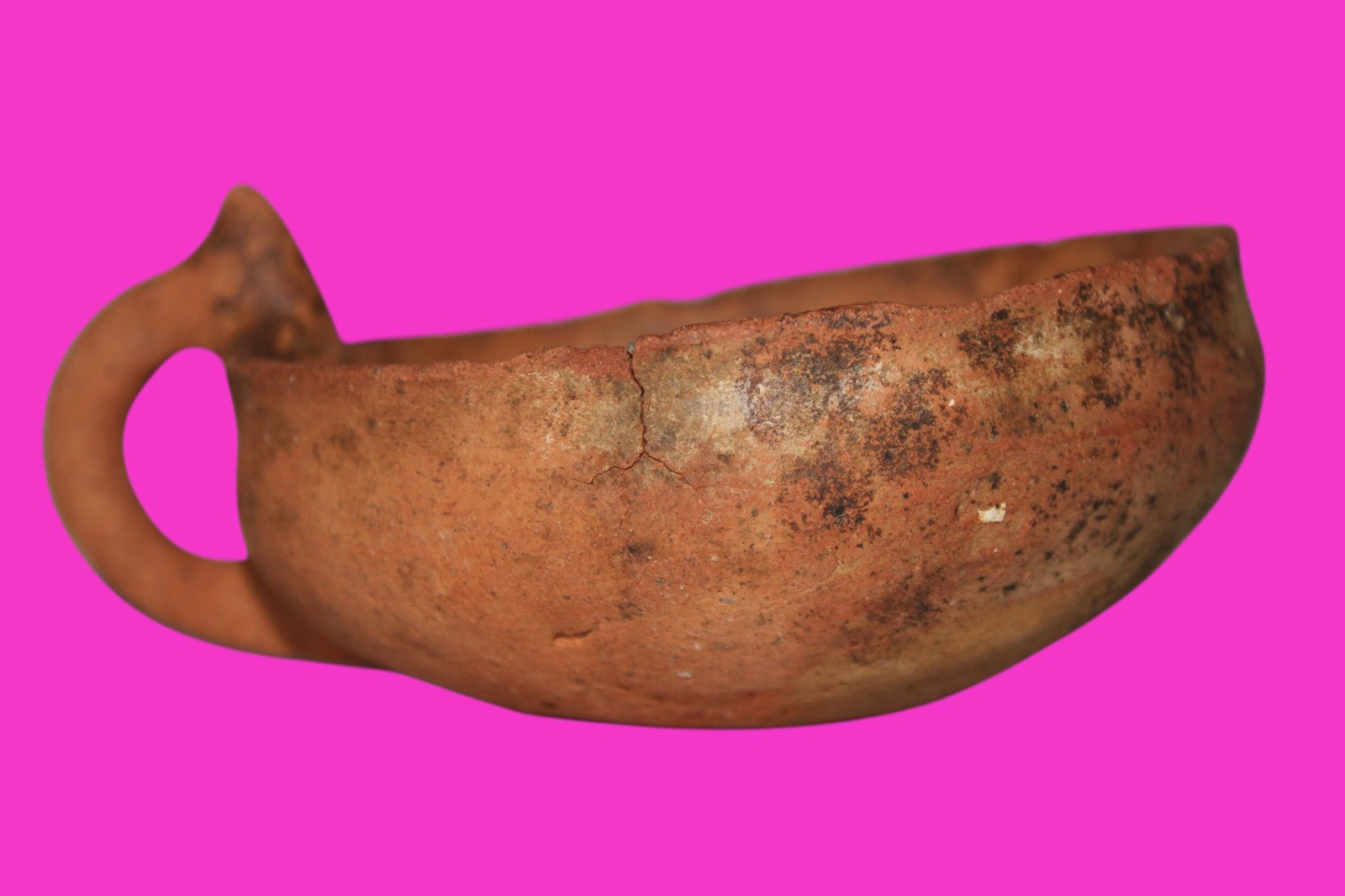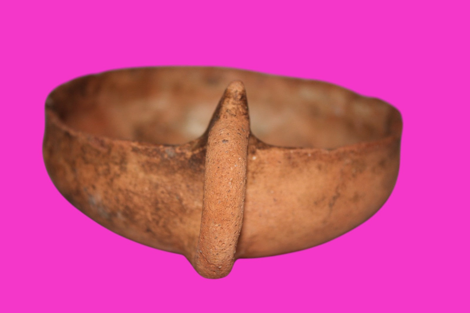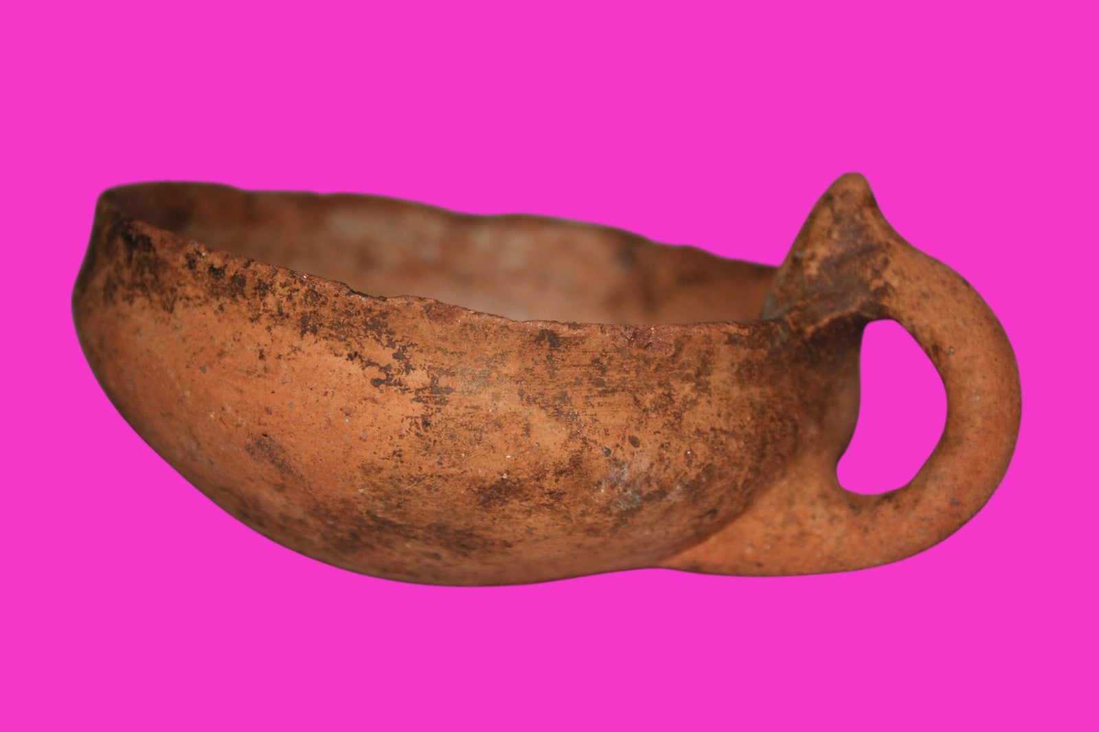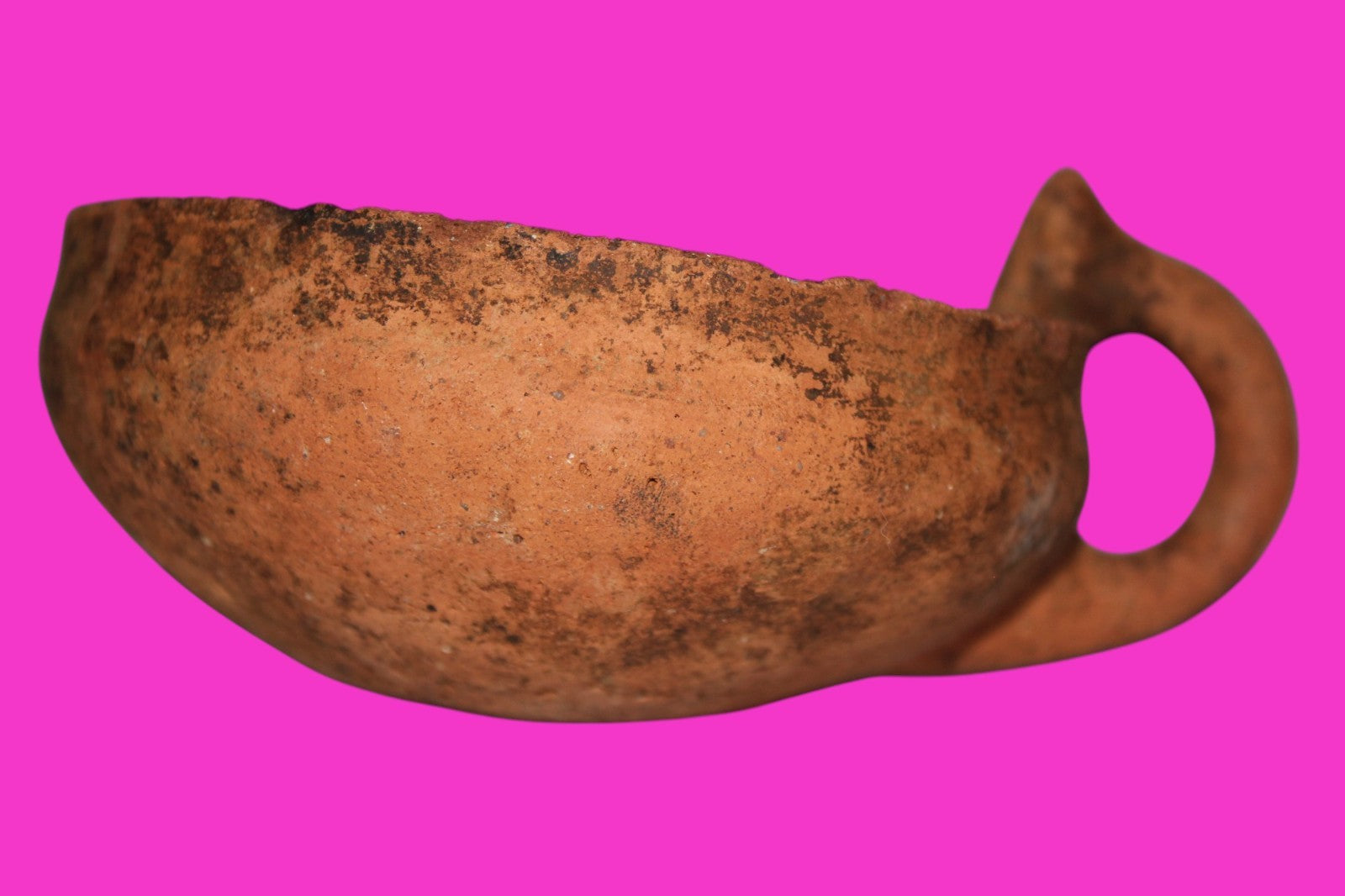Dimensions: 2 inches tall, 4 ¾ inches wide, weighs 142 grams. Provenance: Ex. Private Jerusalem collection, Acquired in the aftermath of the 1967 Six Day War. Acquired by John McIntosh, MSE, MBA, Ancient Artifacts & Treasures, Winter Park, Florida in 2022. Acquired by The Artifact City collection in 2025. Description: Redware horned handle cup. Mineral deposits indicative of approximately 4000 years of underground burial. Small rim chips, stable age cracks, surface loss. No repairs or restorations found. Outstanding condition. Genesis 17:7-8 “I will always keep the promise I have made to you and your descendants, because I am your God and their God. I will give you and them the land in which you are now a foreigner. I will give the whole land of Canaan to your family forever, and I will be their God. “