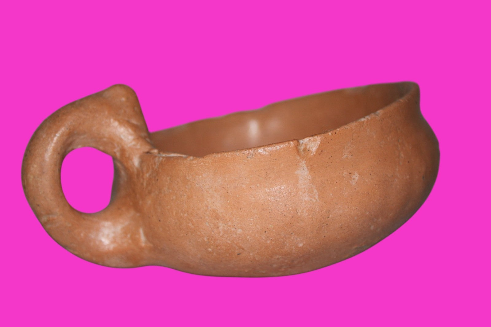 Dimensions: 2 inches tall, 4 ¾ inches wide, weighs 184 grams. Provenance: Ex. Private Jerusalem collection, Acquired in the aftermath of the 1967 Six Day War. Acquired by John McIntosh, MSE, MBA, Ancient Artifacts & Treasures, Winter Park, Florida in 2022. Acquired by The Artifact City collection in 2025. Description: Redware horned handle cup. Mineral deposits indicative of approximately 4000 years of underground burial. Small rim chips, stable age cracks, surface loss. No repairs or restorations found. Outstanding condition. Genesis 17:7-8 “I will always keep the promise I have made to you and your descendants, because I am your God and their God. I will give you and them the land in which you are now a foreigner. I will give the whole land of Canaan to your family forever, and I will be their God. “