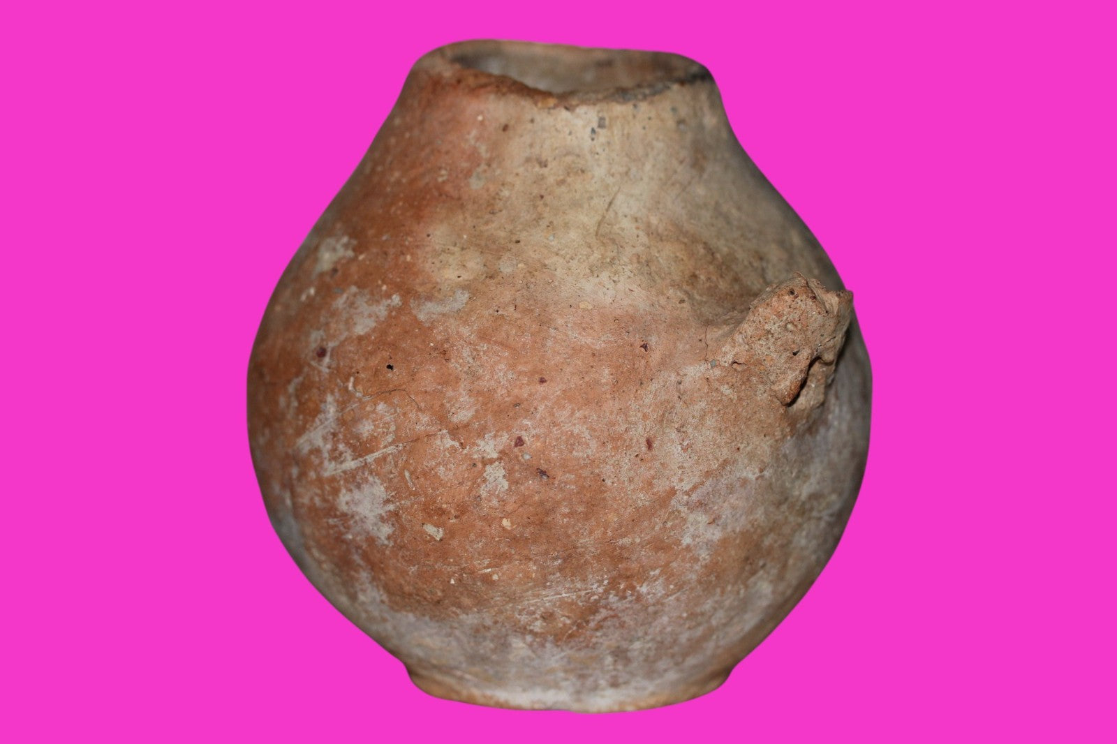 Dimensions: 4 ¼ inches tall, 5 inches wide, weighs 328 grams Provenance: Ex. Private Jerusalem collection, Acquired in the aftermath of the 1967 Six Day War. Acquired by John McIntosh, MSE, MBA, Ancient Artifacts & Treasures, Winter Park, Florida in 2022. Acquired by The Artifact City collection in 2025. Description: Redware bulbous jar with two handles made for stringing. Inconsistent clay grain sizes typical of very early pottery. Extensive mineral deposits indicative of approximately 5500 years of underground burial. Small rim chips and surface loss. A half inch circular area of flaking and a stable age crack where one of the handles joins the main body. No repairs or restorations found. Overall Good condition considering the extreme age. Early Bronze Age: The Early Bronze Age in Cannan was from about 3700 BC to 2500 BC. During this time bronze smelting was developed. It also saw the rise of the first urban societies and fortified settlements.