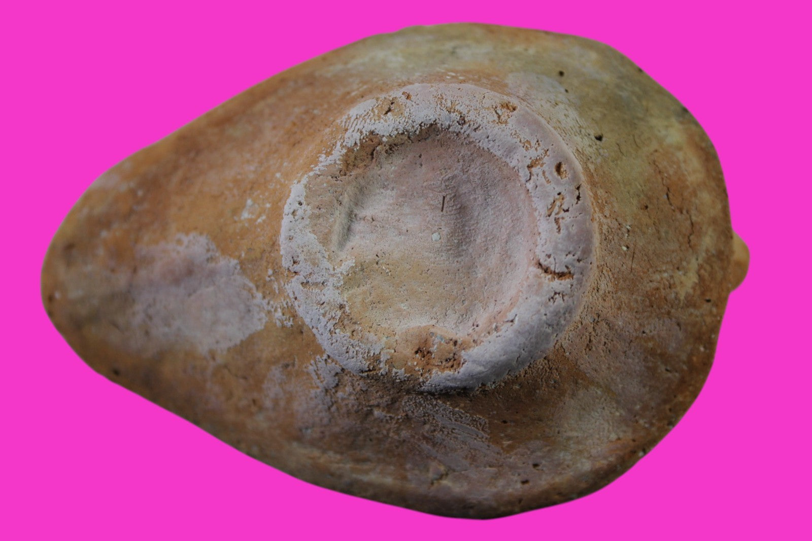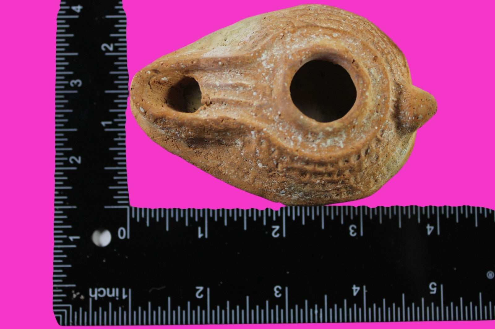 Dimensions: 1 ½ inches tall, 3 ½ inches wide, 4 inches long, weighs 98 gramsProvenance: Ex. Private Jerusalem collection, Acquired in the aftermath of the 1967 Six Day War. Acquired by John McIntosh, MSE, MBA, Ancient Artifacts & Treasures, Winter Park, Florida in 2022. Acquired by The Artifact City collection in 2025.Description: Redware oil lamp made from a two part mold. Oil from animal fat or olives were used with a wick to provide lighting. Oil lamps were mass produced in large quantities throughout the Holy Land and surrounding areas. Their use was significant in both Jewish and early Christian religious ceremonies. They were the equivalent of today’s “light bulbs”.
