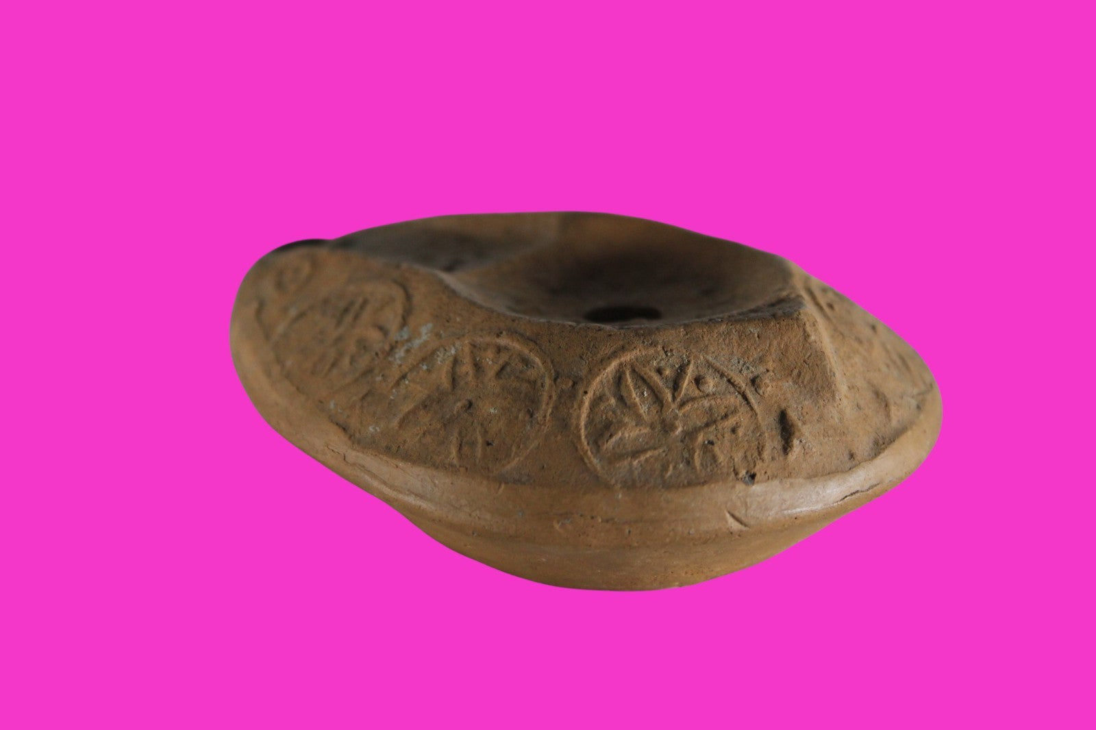 Dimensions: 4 inches long, 2 ¼ inches wide, 1 ¼ inches tall, weighs 65 grams. Provenance: Excavated in the aftermath of the 1967 Six Day War in Judea. Acquired by the Hamadian Antiquities Gallery in The Old City of Jerusalem. Export to the United States approved by the Israeli Antiquities Authority in 2025. Acquired by The Artifact City Collection in September 2025. Description: Terracotta oil lamp made from a two-part mold. Oil from animal fat or olives were used with a wick to provide lighting. Oil lamps were mass produced in large quantities throughout the Holy Land and surrounding areas. Their use was significant in both Jewish and early Christian religious ceremonies. They were the equivalent of today’s “light bulbs”.