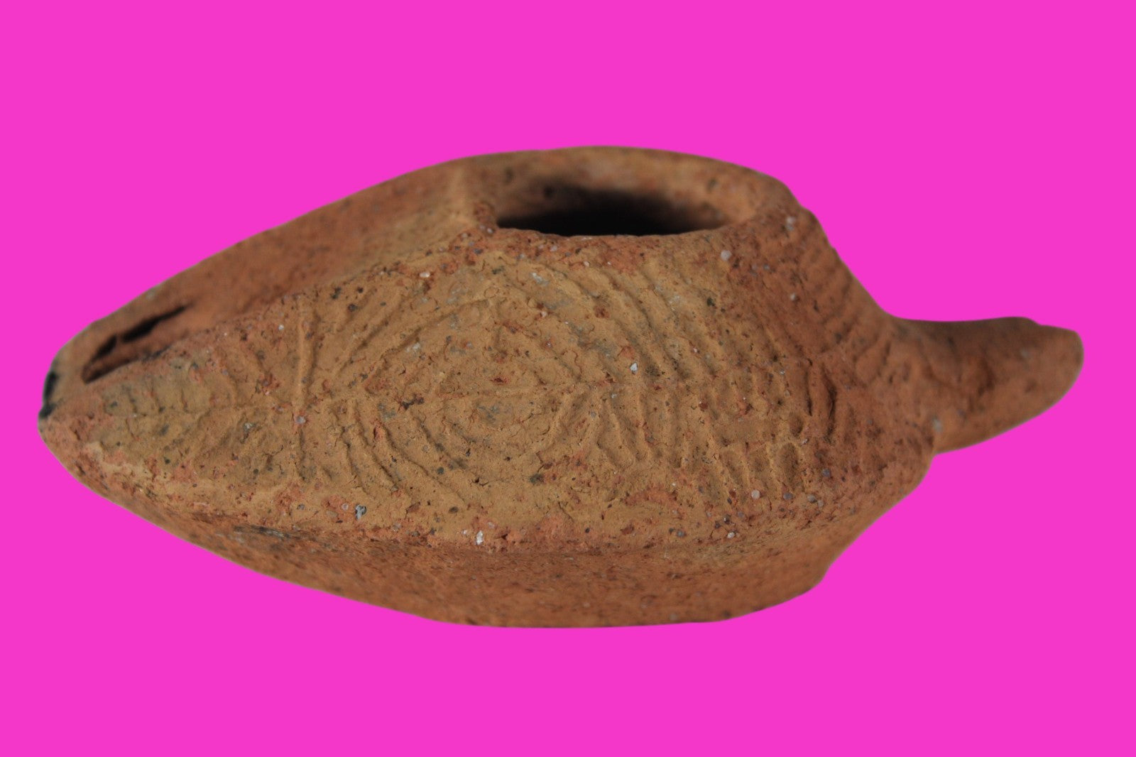 Dimensions: 4 ¼ inches long, 2 ½ inches wide, 1 ½ inches tall, weighs 84 grams. Provenance: Excavated in Judea in the late 1990’s. Ex Private Tel Aviv Collection. Acquired by the Hamadian Antiquities Gallery in The Old City of Jerusalem. Export to the United States approved by the Israeli Antiquities Authority in 2025. Acquired by The Artifact City Collection in September 2025. Description: Terracotta oil lamp made from a two-part mold. Oil from animal fat or olives was used with a wick to provide lighting. Oil lamps were mass produced in large quantities throughout the Holy Land and surrounding areas. Their use was significant in both Jewish and early Christian religious ceremonies. They were the equivalent of today’s “light bulbs”.