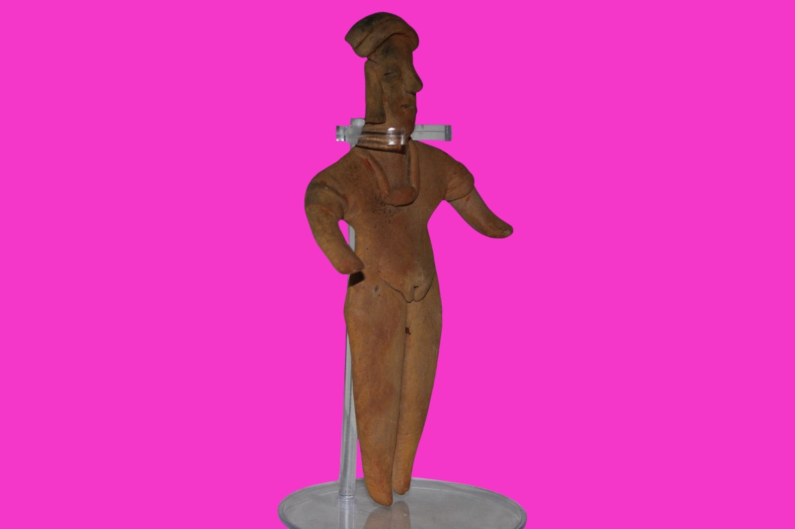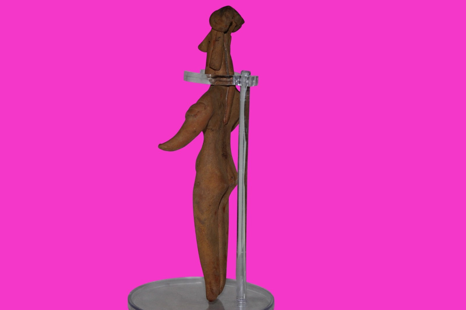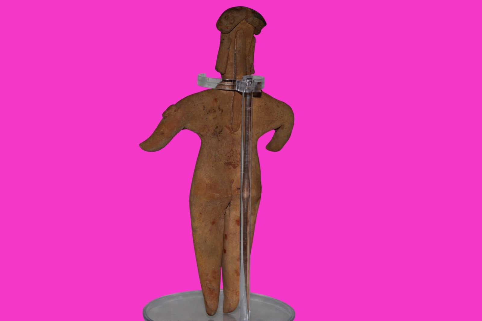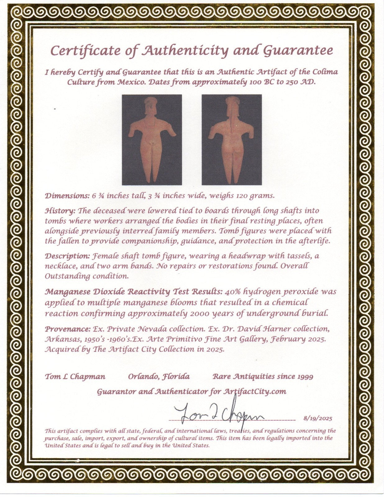 Dimensions: 6 ¾ inches tall, 3 ¾ inches wide, weighs 120 grams. History: The deceased were lowered tied to boards through long shafts into tombs where workers arranged the bodies in their final resting places, often alongside previously interred family members. Tomb figures were placed with the fallen to provide companionship, guidance, and protection in the afterlife. Description: Female shaft tomb figure, wearing a headwrap with tassels, a necklace, and two arm bands. No repairs or restorations found. Overall Outstanding condition. Manganese Dioxide Reactivity Test Results: 40% hydrogen peroxide was applied to multiple manganese blooms that resulted in a chemical reaction confirming approximately 2000 years of underground burial. Provenance: Ex. Private Nevada collection. Ex. Dr. David Harner collection, Arkansas, 1950’s -1960’s.Ex. Arte Primitivo Fine Art Gallery, February 2025. Acquired by The Artifact City Collection in 2025.
