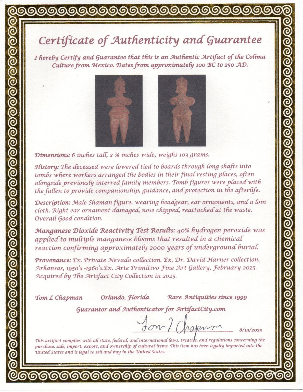 Dimensions: 6 inches tall, 2 ¼ inches wide, weighs 103 grams. History: The deceased were lowered tied to boards through long shafts into tombs where workers arranged the bodies in their final resting places, often alongside previously interred family members. Tomb figures were placed with the fallen to provide companionship, guidance, and protection in the afterlife. Description: Male Shaman figure, wearing headgear, ear ornaments, and a loin cloth. Right ear ornament damaged, nose chipped, reattached at the waste. Overall Good condition. Manganese Dioxide Reactivity Test Results: 40% hydrogen peroxide was applied to multiple manganese blooms that resulted in a chemical reaction confirming approximately 2000 years of underground burial. Provenance: Ex. Private Nevada collection. Ex. Dr. David Harner collection, Arkansas, 1950’s -1960’s.Ex. Arte Primitivo Fine Art Gallery, February 2025. Acquired by The Artifact City Collection in 2025.