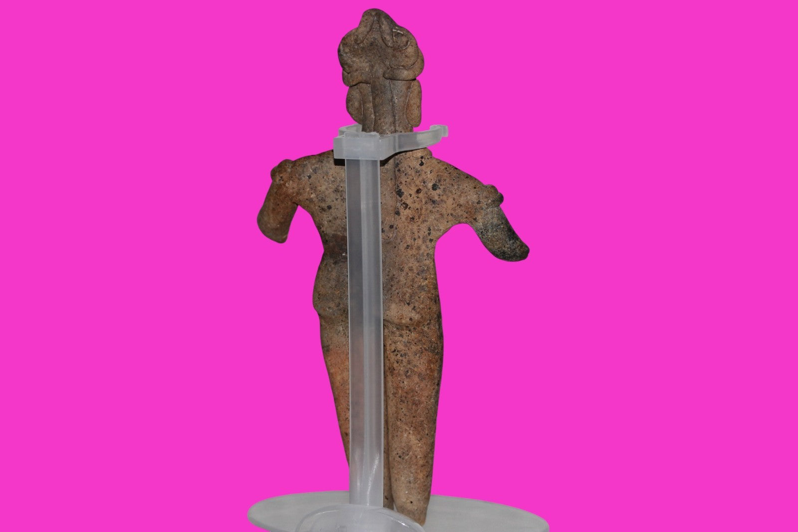 Dimensions: 6 ¼ inches tall, 3 ½ inches wide, weighs 111 grams. History: The deceased were lowered tied to boards through long shafts into tombs where workers arranged them in their final resting places, often alongside previous deceased family members. Tomb figures were placed with the fallen to provide companionship, guidance, and protection in the afterlife. Description: Female figure wearing headgear, a necklace, and two armbands. No repairs or restorations found. Overall Outstanding condition. Provenance: Ex. Private Nevada collection. Ex. Dr. David Harner collection, Arkansas, 1950’s -1960’s.Ex. Arte Primitivo Fine Art Gallery 2025. Acquired by The Artifact City Collection in 2025. Manganese Dioxide Reactivity Test Results: 40% hydrogen peroxide was applied to multiple manganese blooms that resulted in a chemical reaction confirming approximately 2000 years of underground burial.