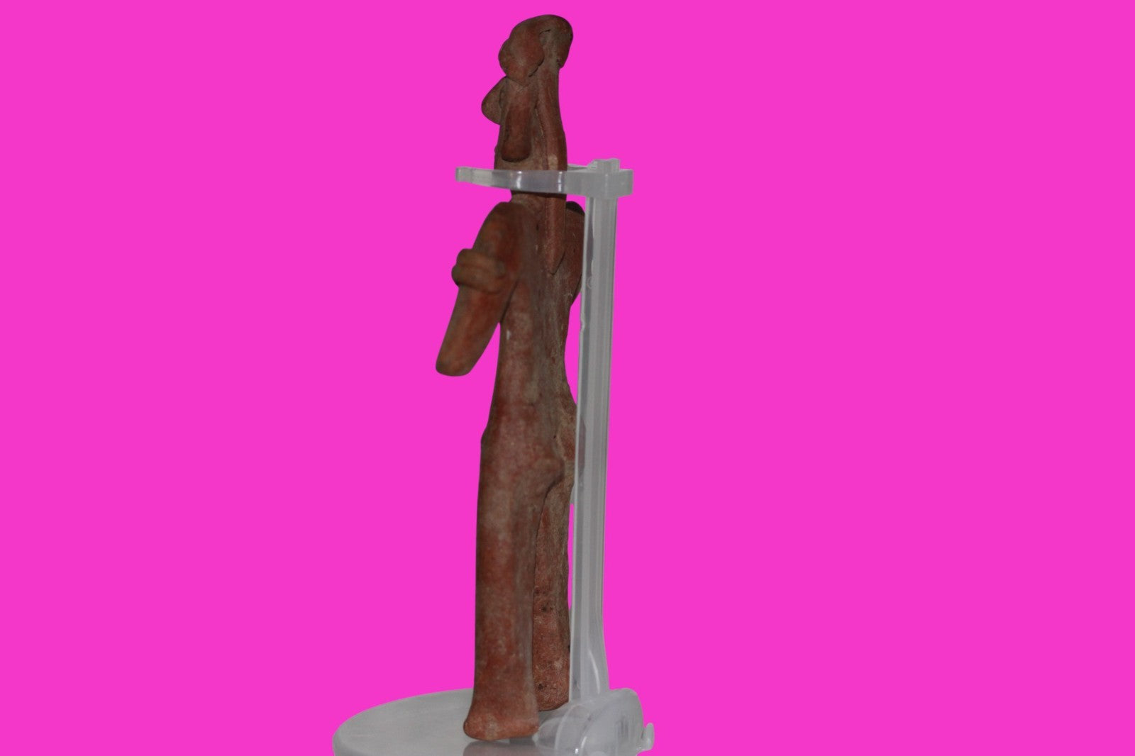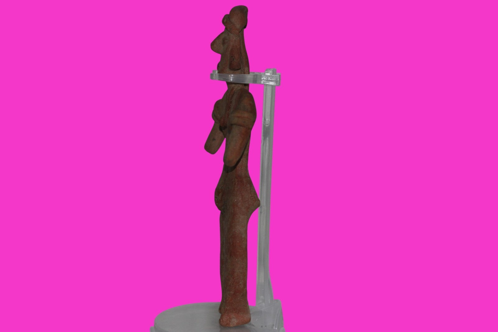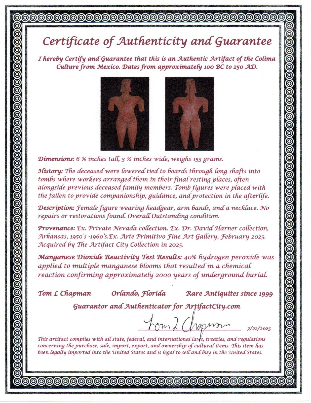 Dimensions: 6 ¾ inches tall, 3 ½ inches wide, weighs 153 grams. History: The deceased were lowered tied to boards through long shafts into tombs where workers arranged them in their final resting places, often alongside previous deceased family members. Tomb figures were placed with the fallen to provide companionship, guidance, and protection in the afterlife. Description: Female figure wearing headgear, arm bands, and a necklace. No repairs or restorations found. Overall Outstanding condition.Provenance: Ex. Private Nevada collection. Ex. Dr. David Harner collection, Arkansas, 1950’s -1960’s.Ex. Arte Primitivo Fine Art Gallery, February 2025. Acquired by The Artifact City Collection in 2025. Manganese Dioxide Reactivity Test Results: 40% hydrogen peroxide was applied to multiple manganese blooms that resulted in a chemical reaction confirming approximately 2000 years of underground burial.