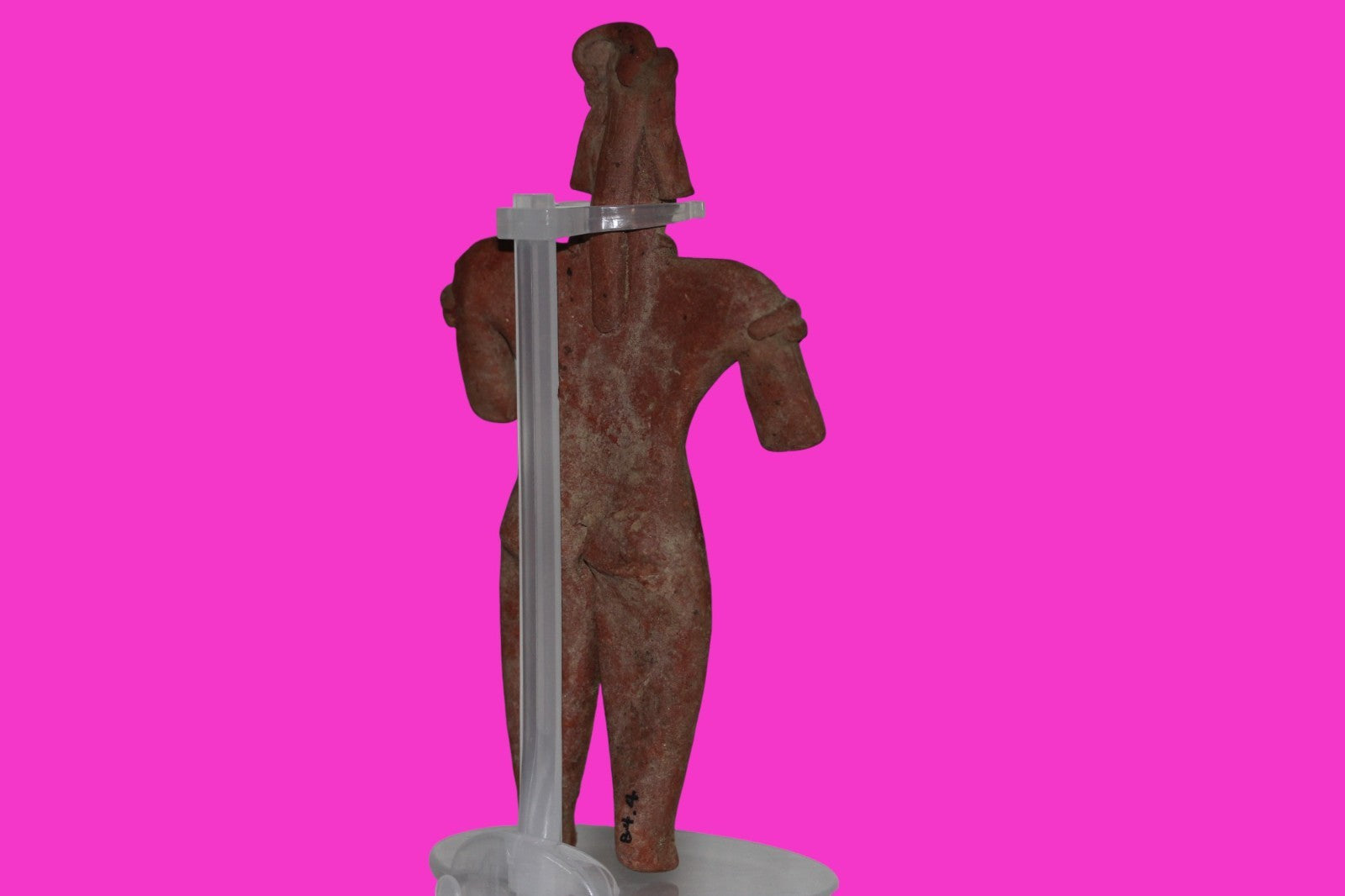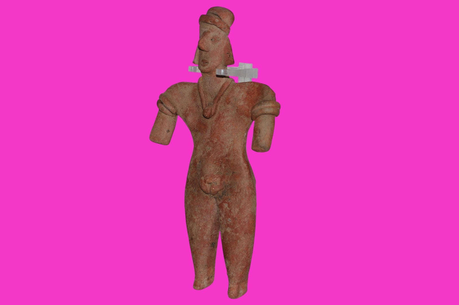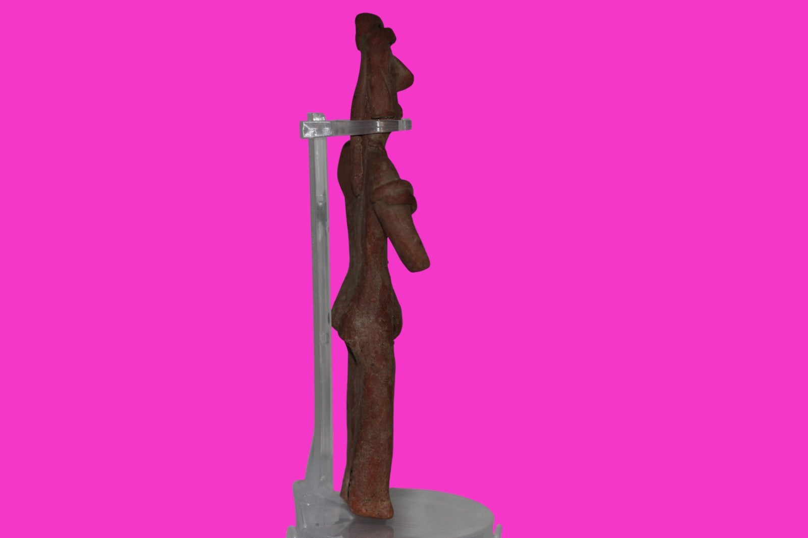 Dimensions: 6 ¾ inches tall, 3 ½ inches wide, weighs 153 grams. History: The deceased were lowered tied to boards through long shafts into tombs where workers arranged them in their final resting places, often alongside previous deceased family members. Tomb figures were placed with the fallen to provide companionship, guidance, and protection in the afterlife. Description: Female figure wearing headgear, arm bands, and a necklace. No repairs or restorations found. Overall Outstanding condition.Provenance: Ex. Private Nevada collection. Ex. Dr. David Harner collection, Arkansas, 1950’s -1960’s.Ex. Arte Primitivo Fine Art Gallery, February 2025. Acquired by The Artifact City Collection in 2025. Manganese Dioxide Reactivity Test Results: 40% hydrogen peroxide was applied to multiple manganese blooms that resulted in a chemical reaction confirming approximately 2000 years of underground burial.