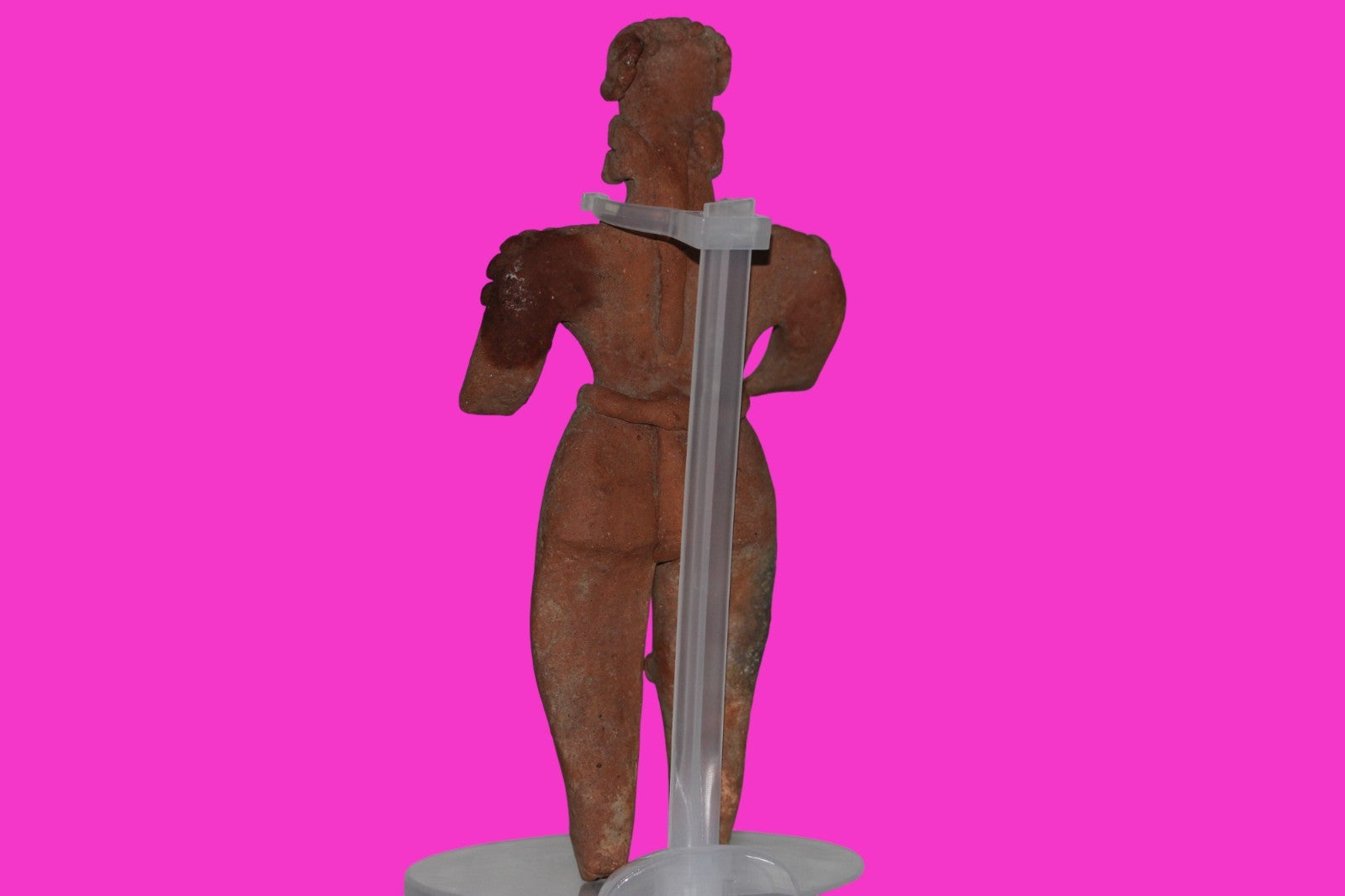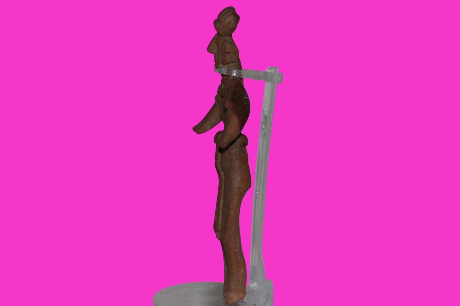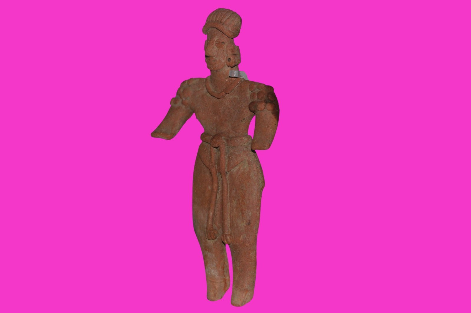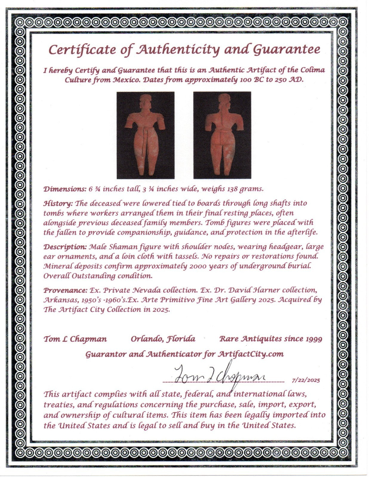Dimensions: 6 ¾ inches tall, 3 ¼ inches wide, weighs 138 grams. History: The deceased were lowered tied to boards through long shafts into tombs where workers arranged them in their final resting places, often alongside previous deceased family members. Tomb figures were placed with the fallen to provide companionship, guidance, and protection in the afterlife. Description: Male Shaman figure with shoulder nodes, wearing headgear, large ear ornaments, and a loin cloth with tassels. No repairs or restorations found. Mineral deposits confirm approximately 2000 years of underground burial. Overall Outstanding condition. Provenance: Ex. Private Nevada collection. Ex. Dr. David Harner collection, Arkansas, 1950’s -1960’s.Ex. Arte Primitivo Fine Art Gallery 2025. Acquired by The Artifact City Collection in 2025.