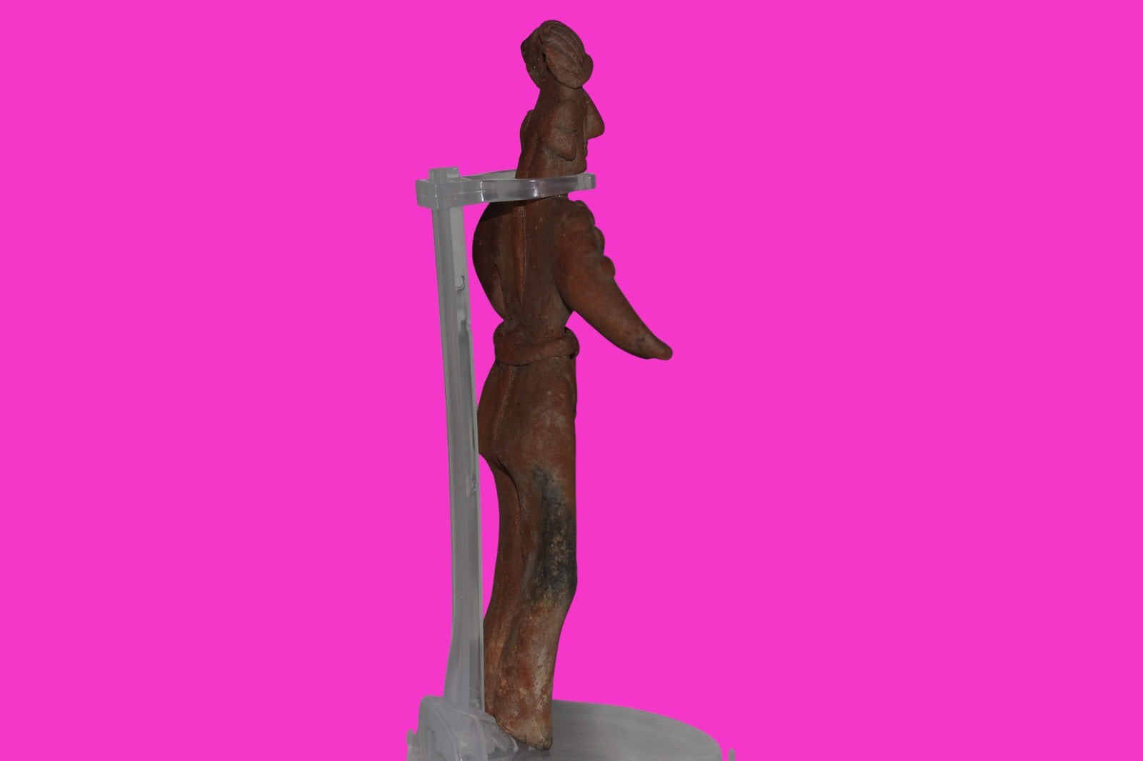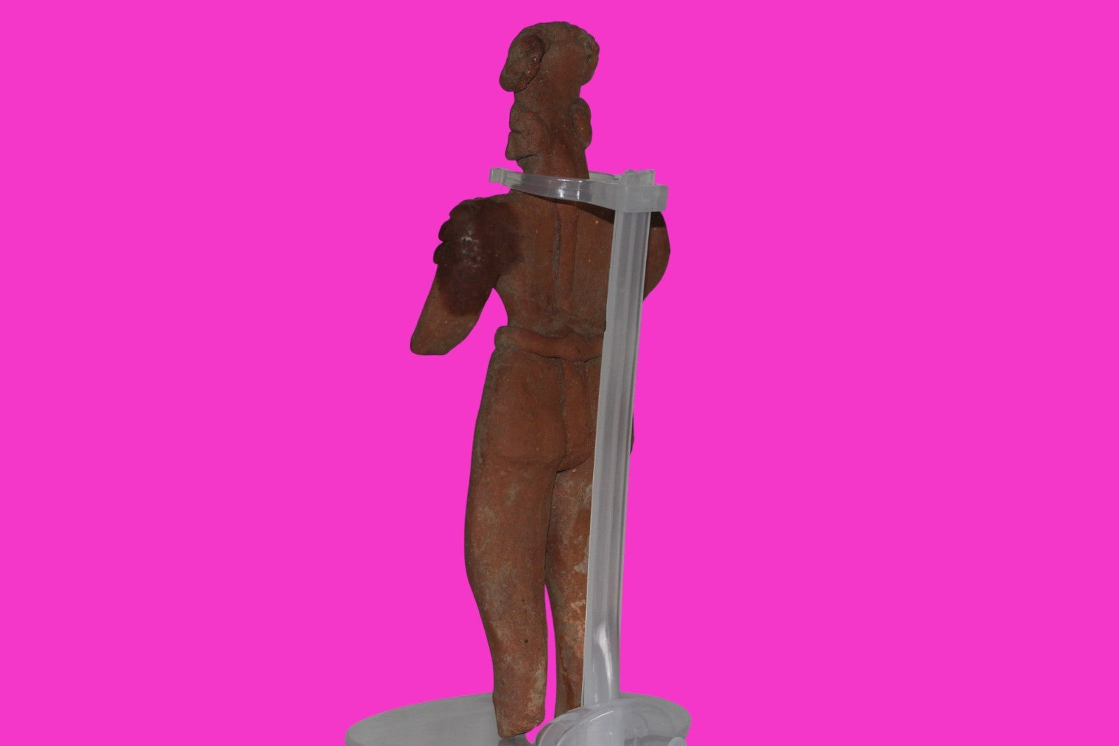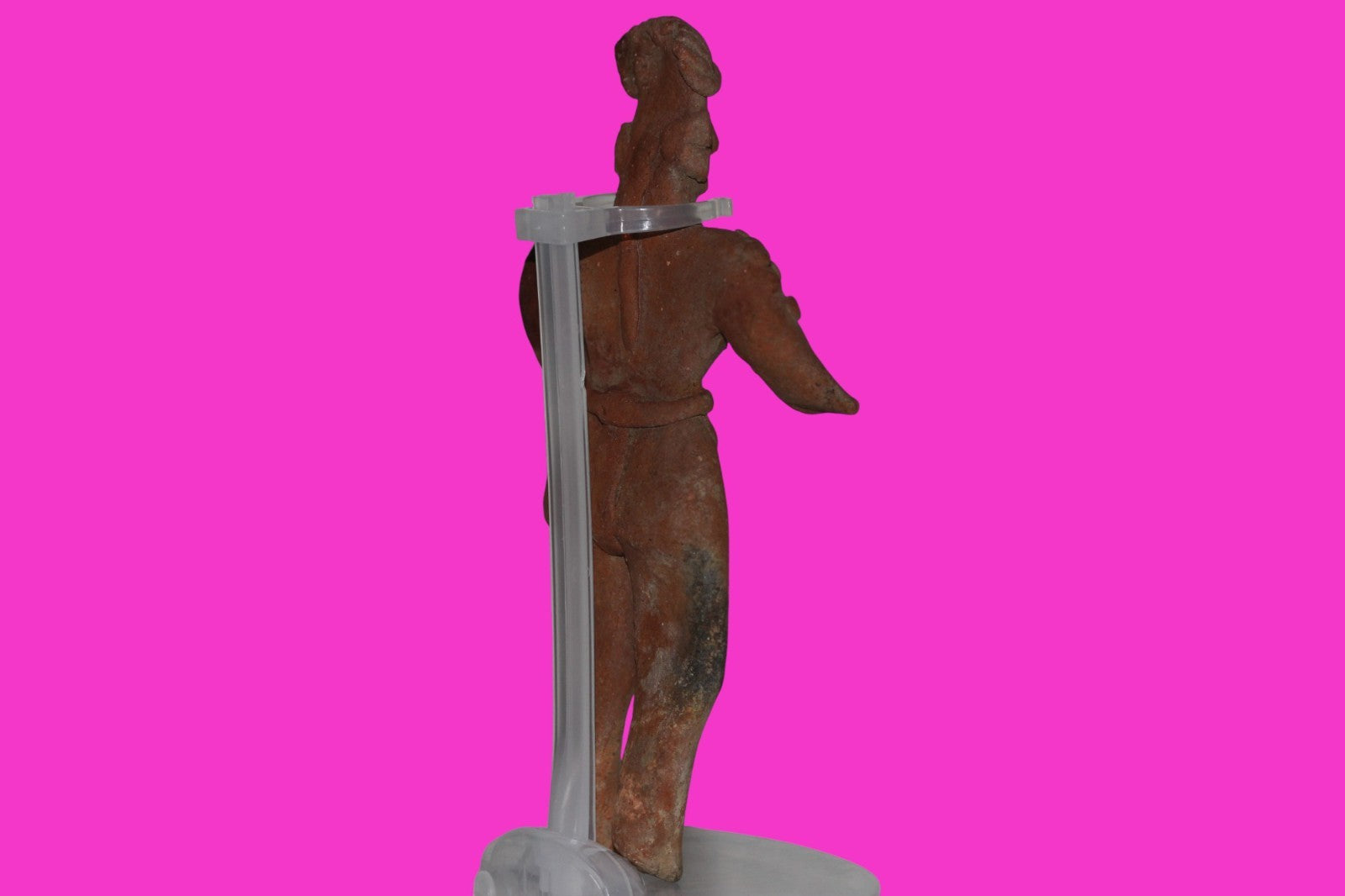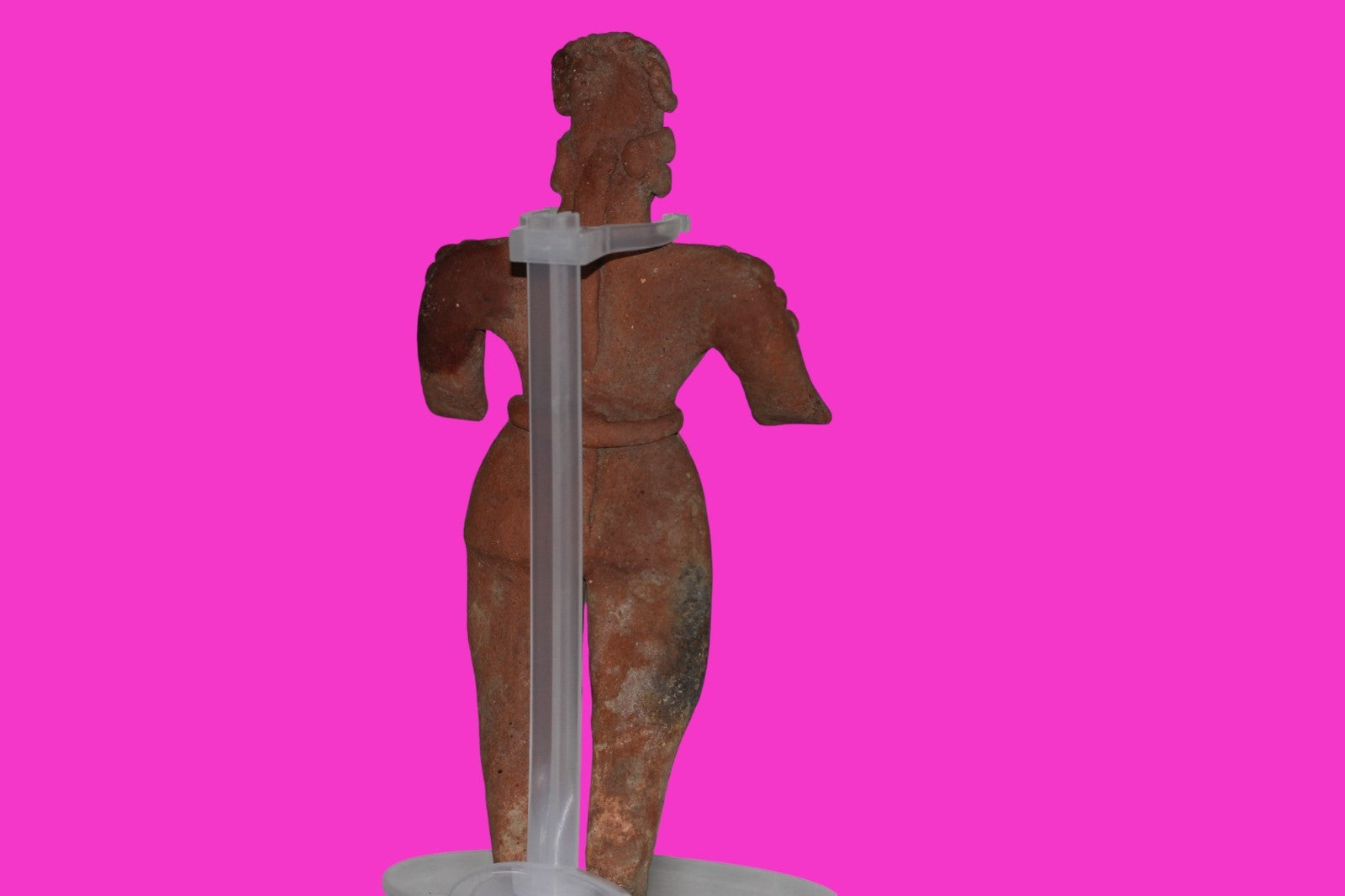 Dimensions: 6 ¾ inches tall, 3 ¼ inches wide, weighs 138 grams. History: The deceased were lowered tied to boards through long shafts into tombs where workers arranged them in their final resting places, often alongside previous deceased family members. Tomb figures were placed with the fallen to provide companionship, guidance, and protection in the afterlife. Description: Male Shaman figure with shoulder nodes, wearing headgear, large ear ornaments, and a loin cloth with tassels. No repairs or restorations found. Mineral deposits confirm approximately 2000 years of underground burial. Overall Outstanding condition. Provenance: Ex. Private Nevada collection. Ex. Dr. David Harner collection, Arkansas, 1950’s -1960’s.Ex. Arte Primitivo Fine Art Gallery 2025. Acquired by The Artifact City Collection in 2025.