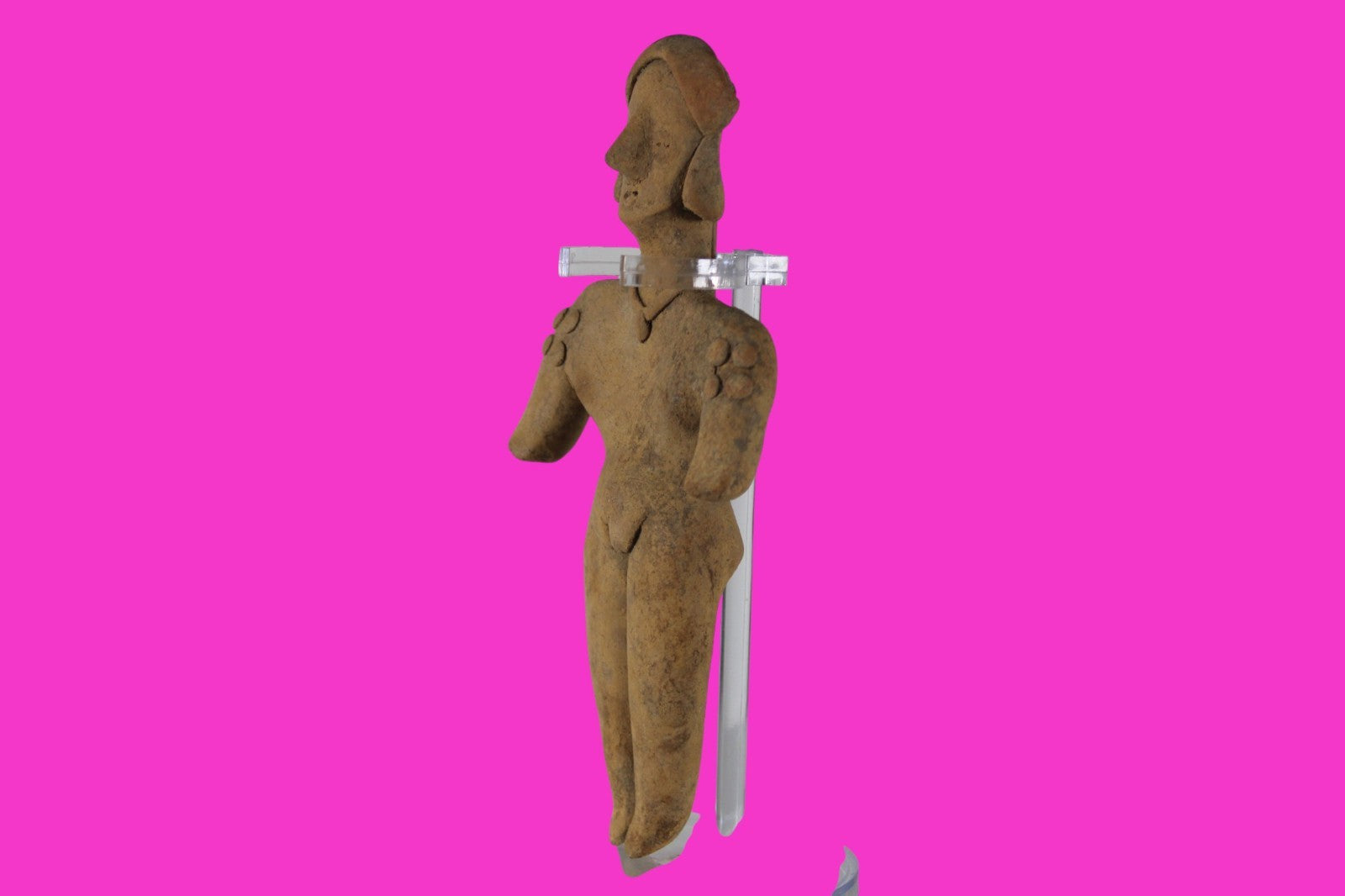 Dimensions: 6 ¼ inches tall, 3 ¼ inches wide, weighs 130 grams. History: The deceased were lowered tied to boards through long shafts into tombs where workers arranged the bodies in their final resting places, often alongside previously interred family members. Tomb figures were placed with the fallen to provide companionship, guidance, and protection in the afterlife. Description: Female Shaman shaft tomb figure wearing a headwrap and a necklace. 8 shoulder nodes. No repairs or restorations found. Overall Outstanding condition. Manganese Dioxide Reactivity Test Results: 40% hydrogen peroxide was applied to multiple manganese blooms that resulted in a chemical reaction confirming approximately 2000 years of underground burial. Provenance: Ex. Private Nevada collection. Ex. Dr. David Harner collection, Arkansas, 1950’s -1960’s.Ex. Arte Primitivo Fine Art Gallery 2025. Acquired by The Artifact City Collection in 2025.
