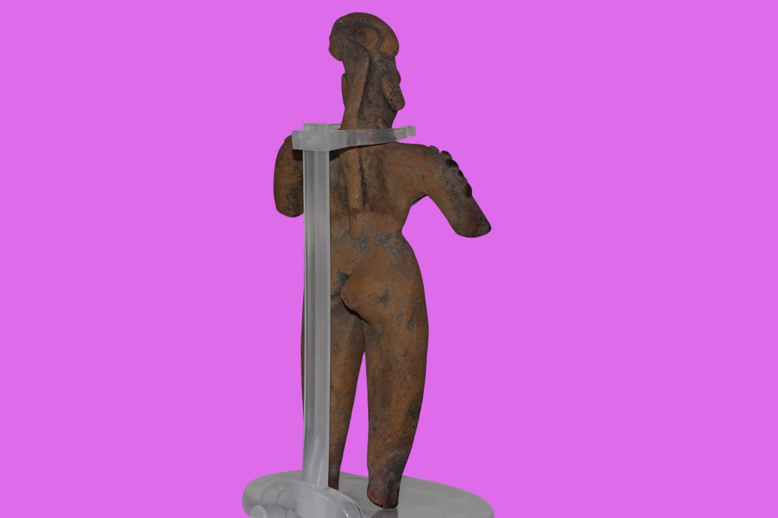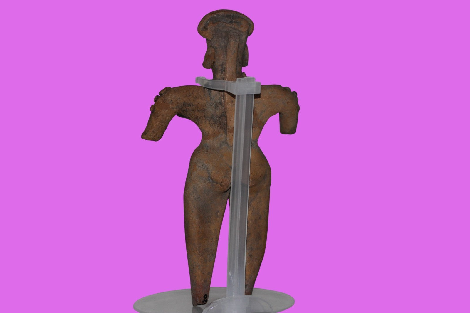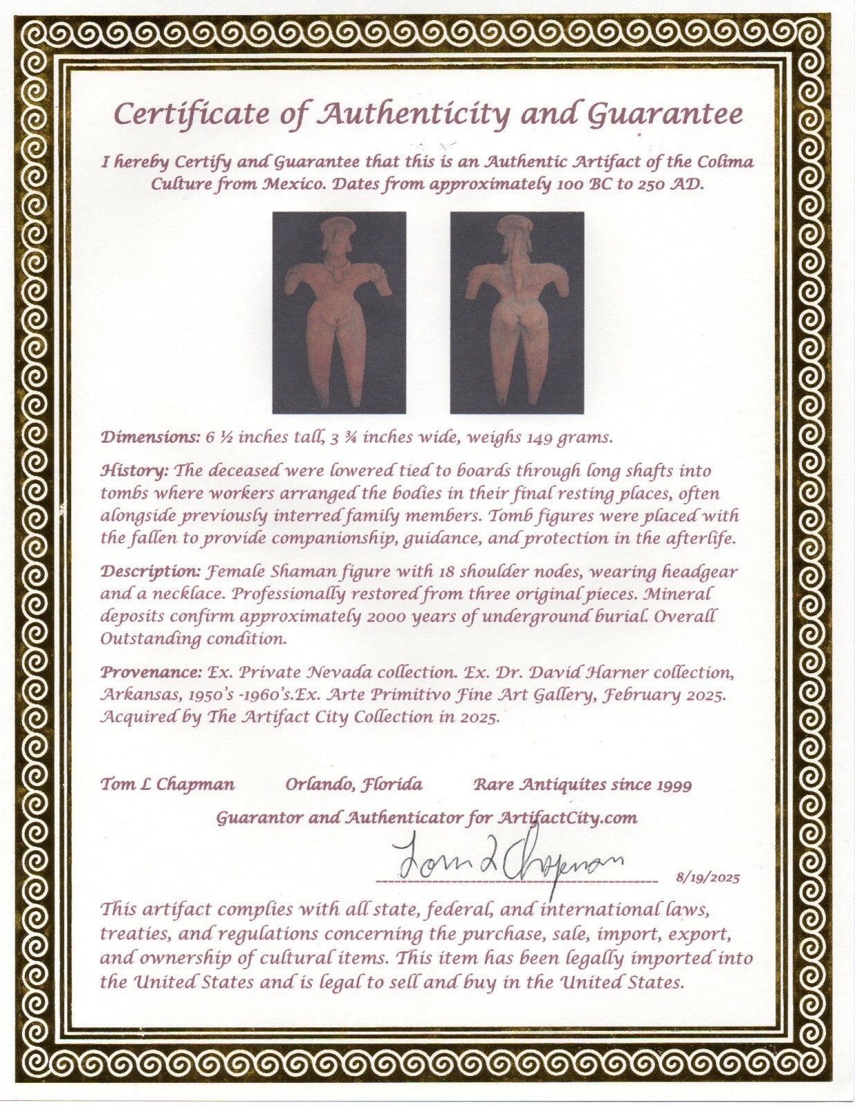Dimensions: 6 ½ inches tall, 3 ¾ inches wide, weighs 149 grams. History: The deceased were lowered tied to boards through long shafts into tombs where workers arranged the bodies in their final resting places, often alongside previously interred family members. Tomb figures were placed with the fallen to provide companionship, guidance, and protection in the afterlife. Description: Female Shaman figure with 18 shoulder nodes, wearing headgear and a necklace. Professionally restored from three original pieces. Mineral deposits confirm approximately 2000 years of underground burial. Overall Outstanding condition. Provenance: Ex. Private Nevada collection. Ex. Dr. David Harner collection, Arkansas, 1950’s -1960’s.Ex. Arte Primitivo Fine Art Gallery, February 2025. Acquired by The Artifact City Collection in 2025.