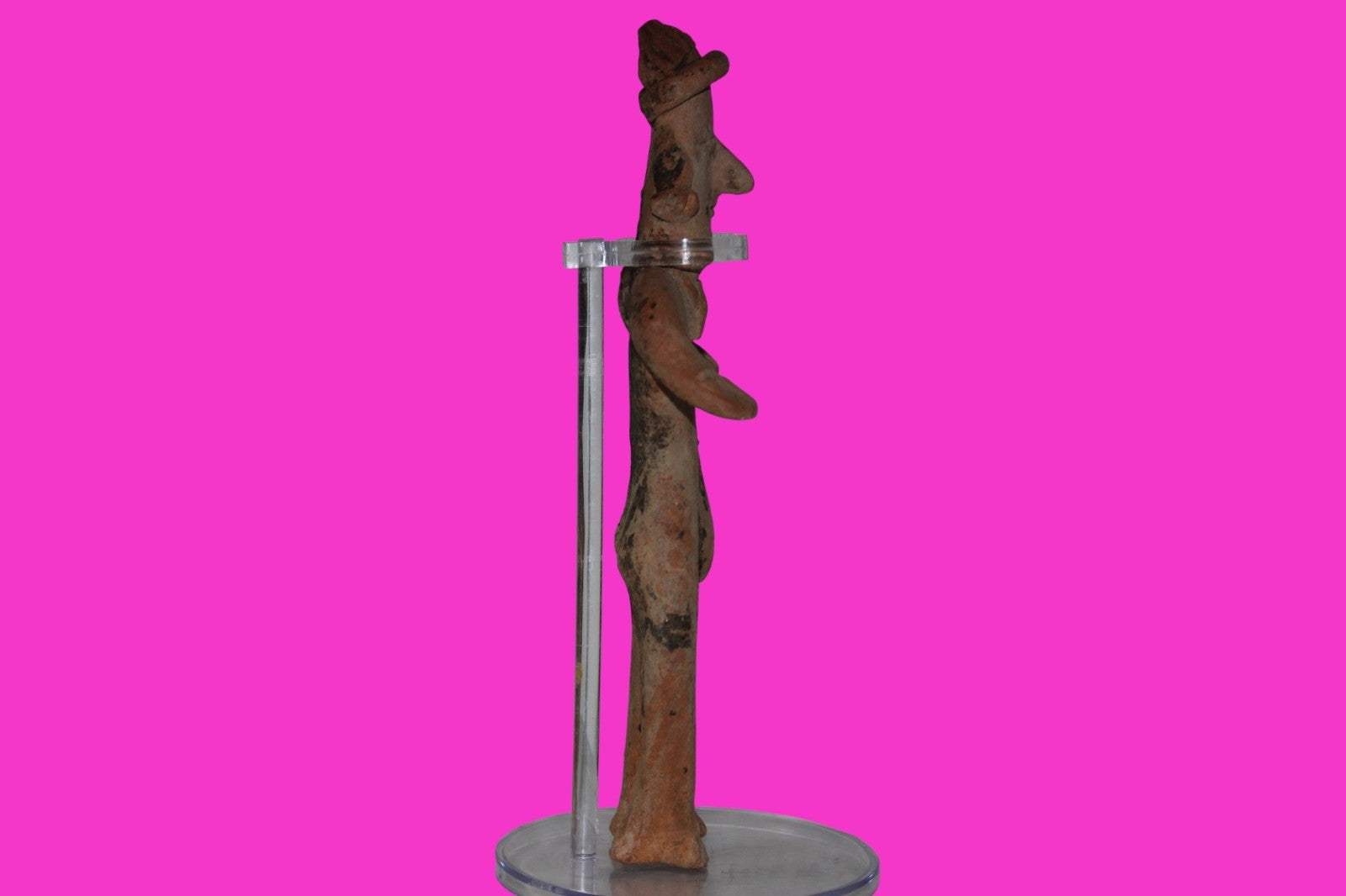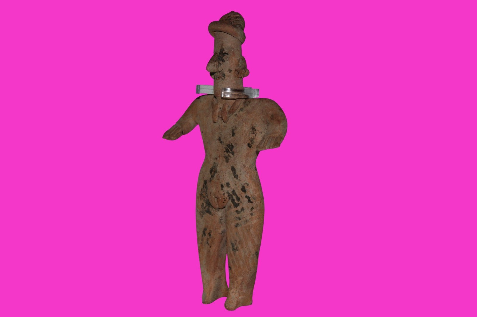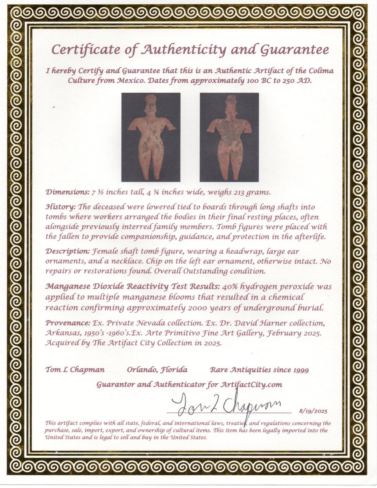Dimensions: 7 ½ inches tall, 4 ¼ inches wide, weighs 213 grams. History: The deceased were lowered tied to boards through long shafts into tombs where workers arranged the bodies in their final resting places, often alongside previously interred family members. Tomb figures were placed with the fallen to provide companionship, guidance, and protection in the afterlife. Description: Female shaft tomb figure, wearing a headwrap, large ear ornaments, and a necklace. Chip on the left ear ornament, otherwise intact. No repairs or restorations found. Overall Outstanding condition. Manganese Dioxide Reactivity Test Results: 40% hydrogen peroxide was applied to multiple manganese blooms that resulted in a chemical reaction confirming approximately 2000 years of underground burial. Provenance: Ex. Private Nevada collection. Ex. Dr. David Harner collection, Arkansas, 1950’s -1960’s.Ex. Arte Primitivo Fine Art Gallery, February 2025. Acquired by The Artifact City Collection in 2025.