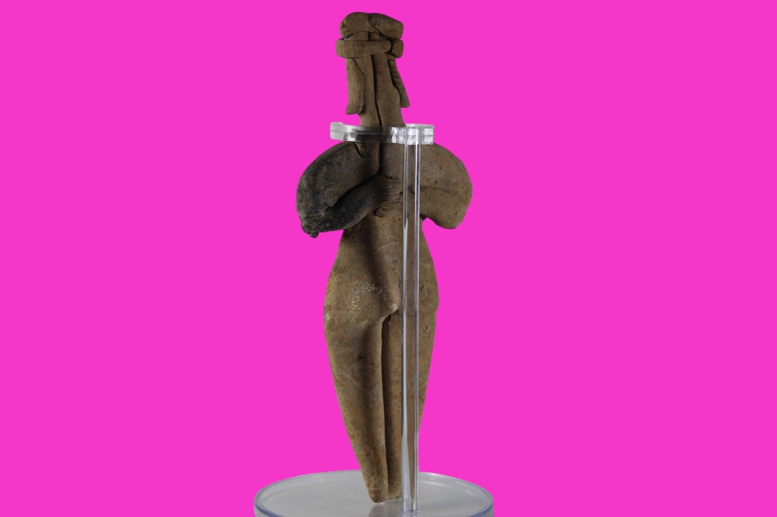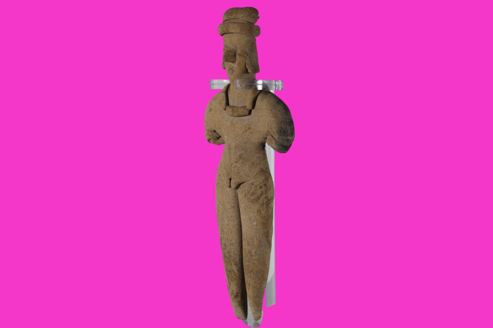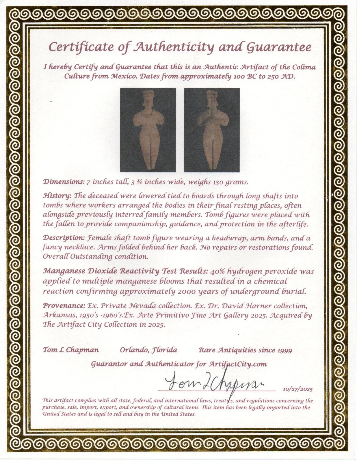 Dimensions: 7 inches tall, 3 ¾ inches wide, weighs 130 grams. History: The deceased were lowered tied to boards through long shafts into tombs where workers arranged the bodies in their final resting places, often alongside previously interred family members. Tomb figures were placed with the fallen to provide companionship, guidance, and protection in the afterlife.Description: Female shaft tomb figure wearing a headwrap, arm bands, and a fancy necklace. Arms folded behind her back. No repairs or restorations found. Overall Outstanding condition. Manganese Dioxide Reactivity Test Results: 40% hydrogen peroxide was applied to multiple manganese blooms that resulted in a chemical reaction confirming approximately 2000 years of underground burial. Provenance: Ex. Private Nevada collection. Ex. Dr. David Harner collection, Arkansas, 1950’s -1960’s.Ex. Arte Primitivo Fine Art Gallery 2025. Acquired by The Artifact City Collection in 2025.