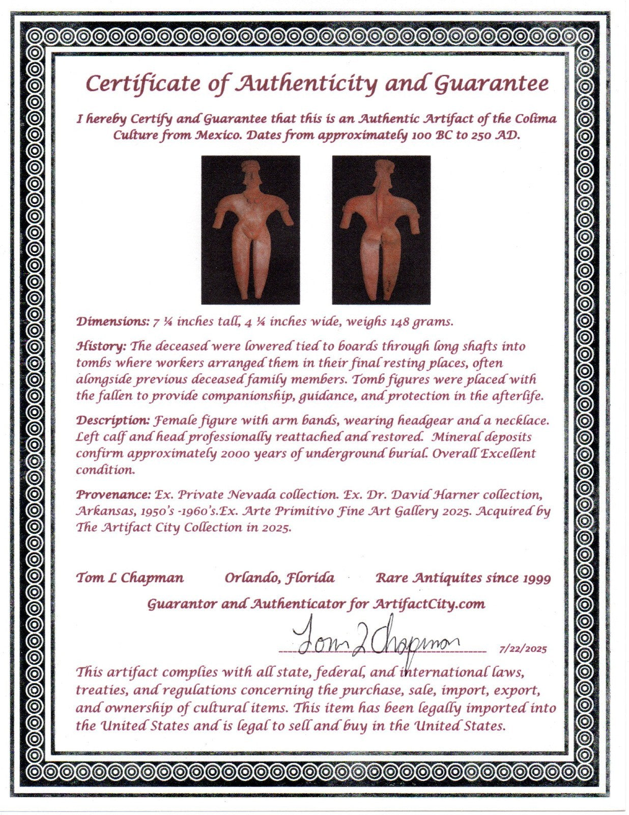 Dimensions: 7 ¼ inches tall, 4 ¼ inches wide, weighs 148 grams. History: The deceased were lowered tied to boards through long shafts into tombs where workers arranged them in their final resting places, often alongside previous deceased family members. Tomb figures were placed with the fallen to provide companionship, guidance, and protection in the afterlife. Description: Female figure with arm bands, wearing headgear and a necklace. Left calf and head professionally reattached and restored. Mineral deposits confirm approximately 2000 years of underground burial. Overall Excellent condition. Provenance: Ex. Private Nevada collection. Ex. Dr. David Harner collection, Arkansas, 1950’s -1960’s.Ex. Arte Primitivo Fine Art Gallery 2025. Acquired by The Artifact City Collection in 2025.