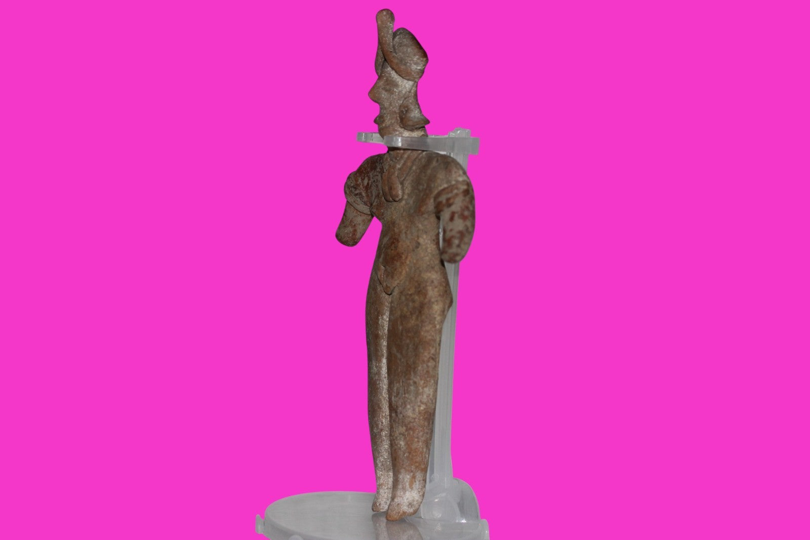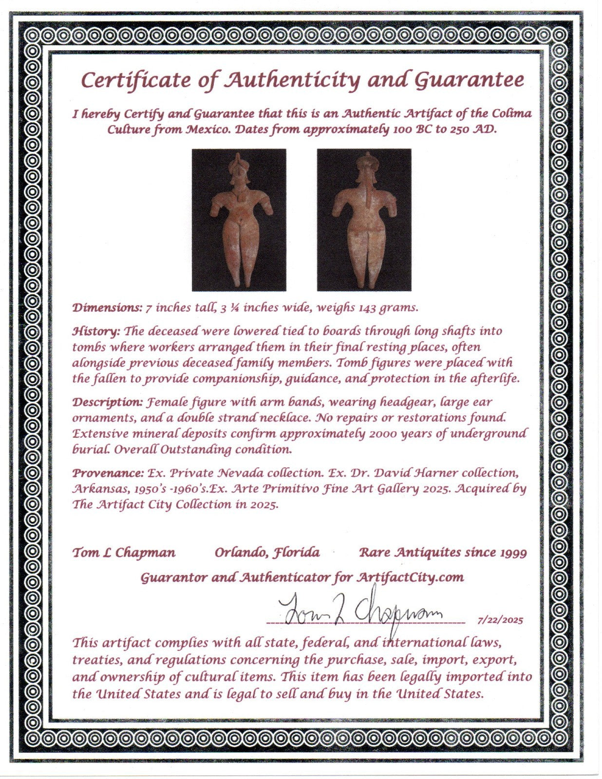 Dimensions: 7 inches tall, 3 ¼ inches wide, weighs 143 grams. History: The deceased were lowered tied to boards through long shafts into tombs where workers arranged them in their final resting places, often alongside previous deceased family members. Tomb figures were placed with the fallen to provide companionship, guidance, and protection in the afterlife. Description: Female figure with arm bands, wearing headgear, large ear ornaments, and a double strand necklace. No repairs or restorations found. Extensive mineral deposits confirm approximately 2000 years of underground burial. Overall Outstanding condition. Provenance: Ex. Private Nevada collection. Ex. Dr. David Harner collection, Arkansas, 1950’s -1960’s.Ex. Arte Primitivo Fine Art Gallery 2025. Acquired by The Artifact City Collection in 2025.