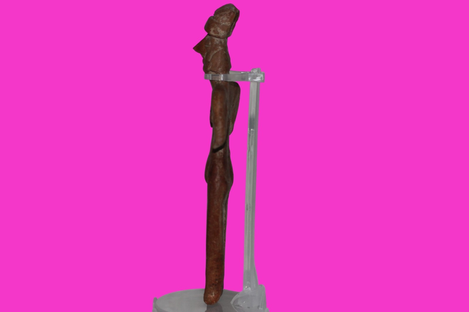 Dimensions: 7 ¾ inches tall, 3 ¾ inches wide, weighs 182 grams. History: The deceased were lowered tied to boards through long shafts into tombs where workers arranged them in their final resting places, often alongside previous deceased family members. Tomb figures were placed with the fallen to provide companionship, guidance, and protection in the afterlife. Description: Female figure with her long hair draped over her shoulder, wearing elaborate headgear. End of nose chipped. Mineral deposits confirm approximately 2000 years of underground burial. Overall Excellent condition. Provenance: Ex. Private Nevada collection. Ex. Dr. David Harner collection, Arkansas, 1950’s -1960’s.Ex. Arte Primitivo Fine Art Gallery 2025. Acquired by The Artifact City Collection in 2025.
