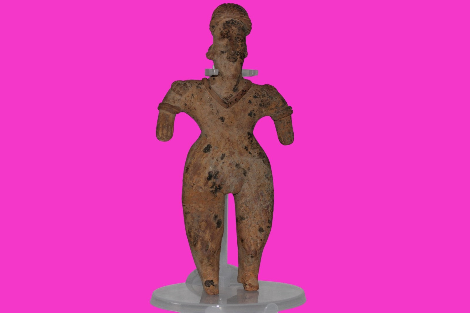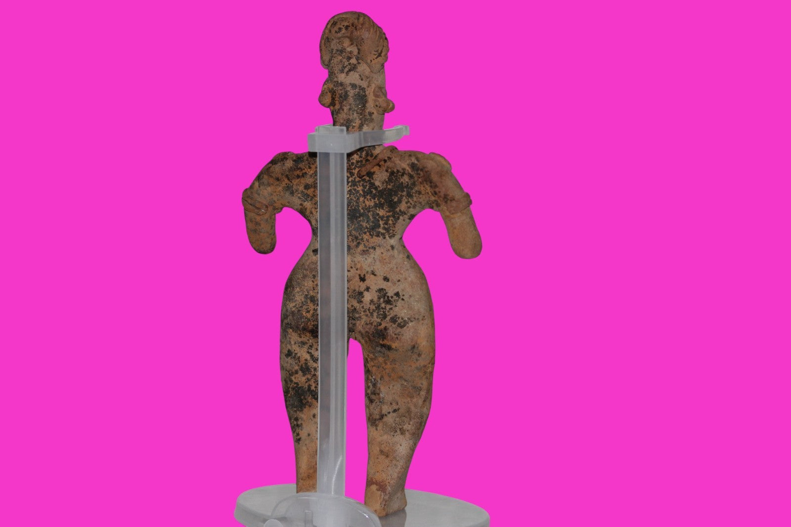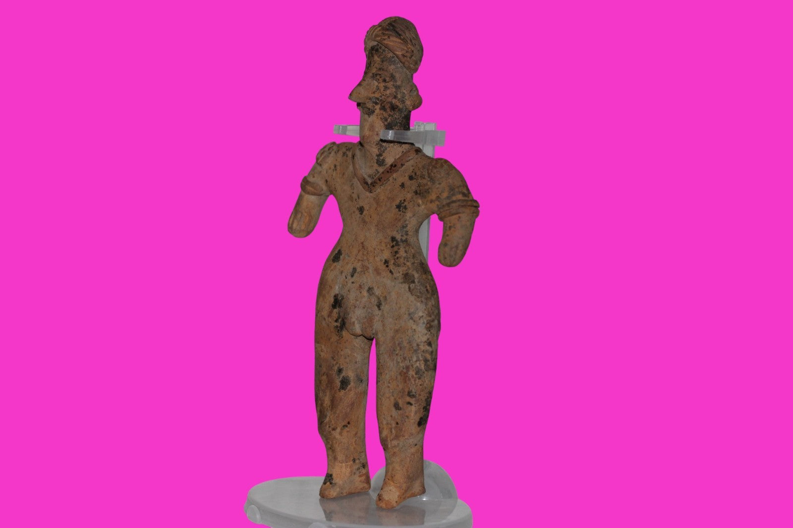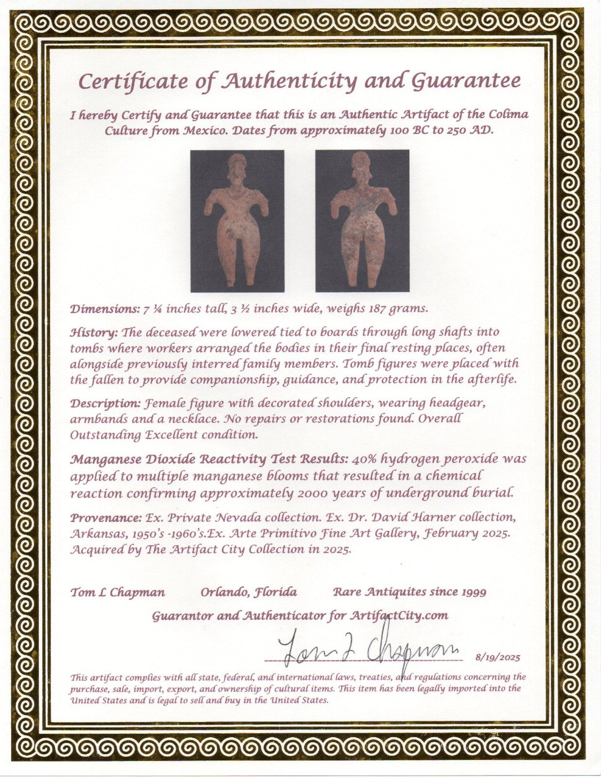 Dimensions: 7 ¼ inches tall, 3 ½ inches wide, weighs 187 grams. History: The deceased were lowered tied to boards through long shafts into tombs where workers arranged the bodies in their final resting places, often alongside previously interred family members. Tomb figures were placed with the fallen to provide companionship, guidance, and protection in the afterlife. Description: Female figure with decorated shoulders, wearing headgear, armbands and a necklace. No repairs or restorations found. Overall Outstanding Excellent condition. Manganese Dioxide Reactivity Test Results: 40% hydrogen peroxide was applied to multiple manganese blooms that resulted in a chemical reaction confirming approximately 2000 years of underground burial. Provenance: Ex. Private Nevada collection. Ex. Dr. David Harner collection, Arkansas, 1950’s -1960’s.Ex. Arte Primitivo Fine Art Gallery, February 2025. Acquired by The Artifact City Collection in 2025.