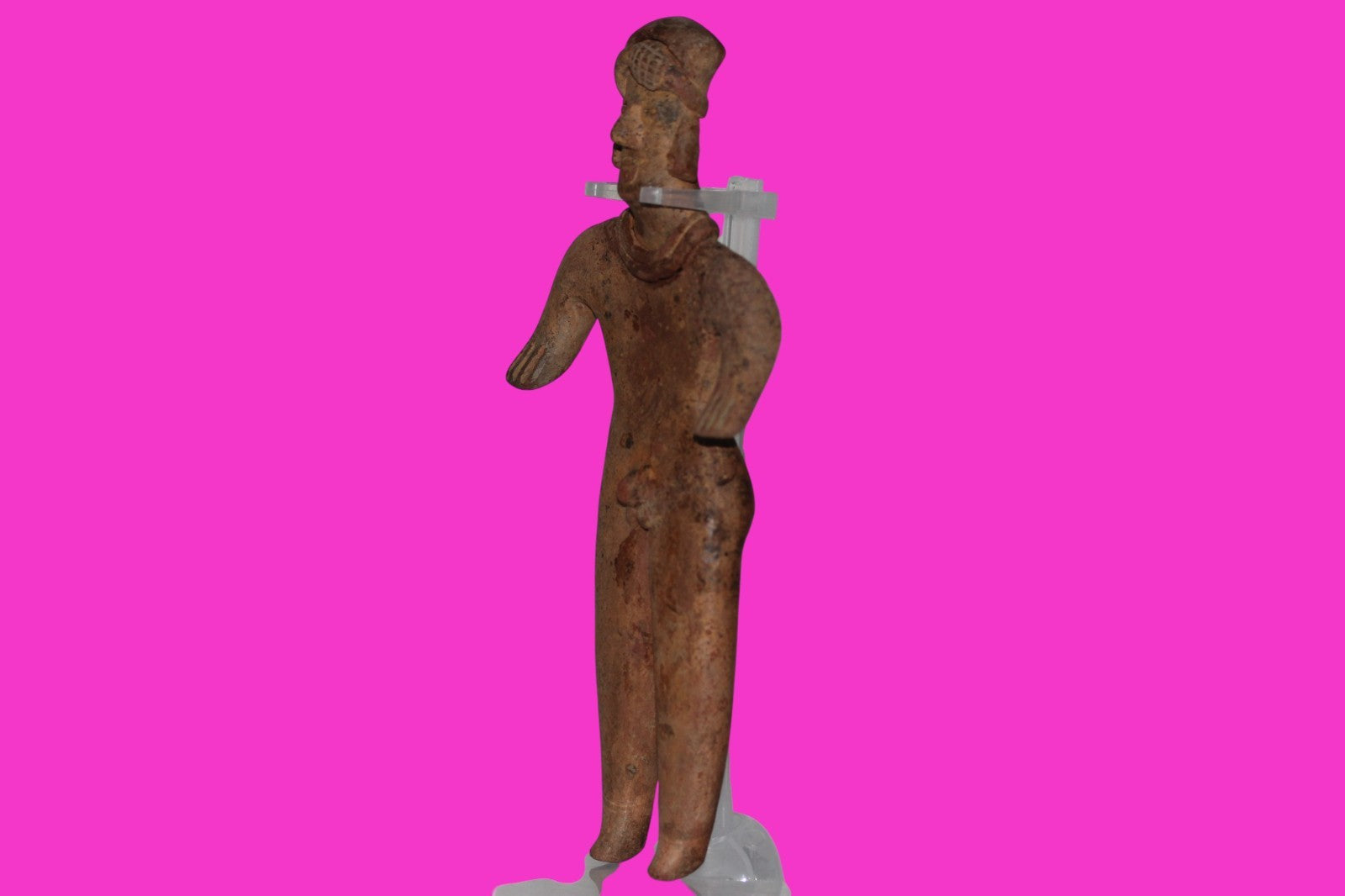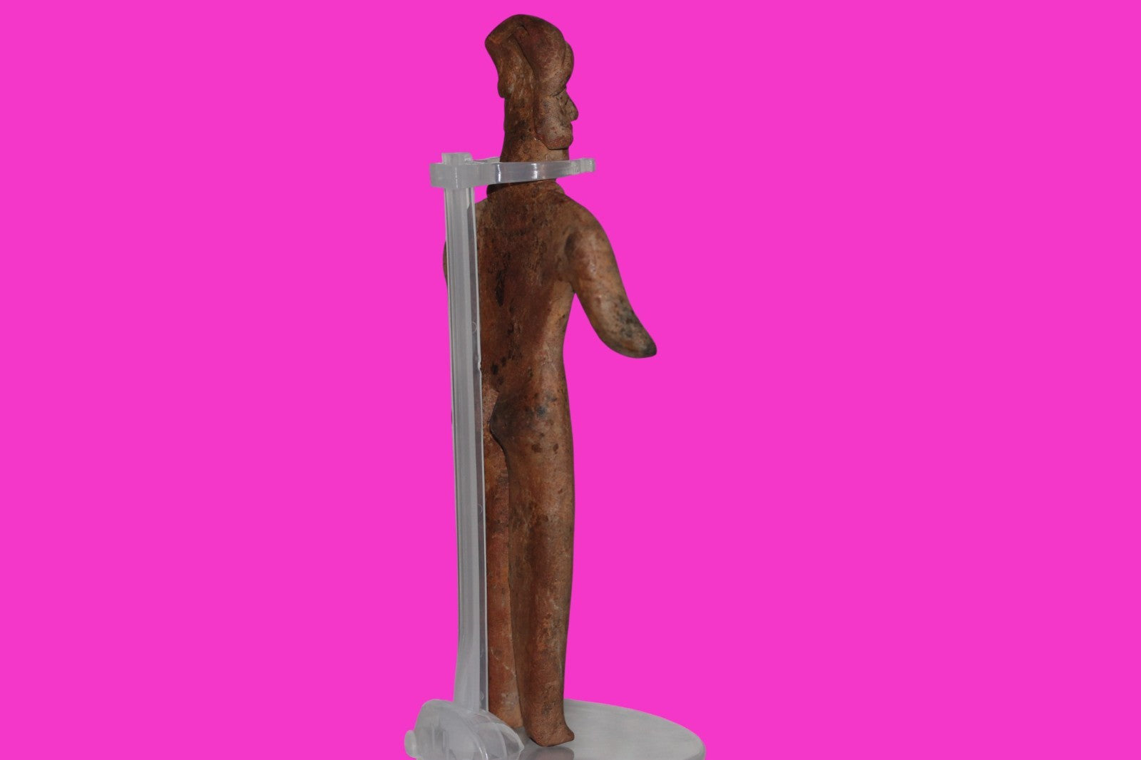 Dimensions: 7 ½ inches tall, 3 ½ inches wide, weighs 172 grams. History: The deceased were lowered tied to boards through long shafts into tombs where workers arranged the bodies in their final resting places, often alongside previously interred family members. Tomb figures were placed with the fallen to provide companionship, guidance, and protection in the afterlife. Description: Male figure wearing headgear, a elaborate headband, and a fancy necklace. No repairs or restorations found. Mineral deposits confirm approximately 2000 years of underground burial. Overall Outstanding condition. Provenance: Ex. Private Nevada collection. Ex. Dr. David Harner collection, Arkansas, 1950’s -1960’s.Ex. Arte Primitivo Fine Art Gallery, February 2025. Acquired by The Artifact City Collection in 2025.