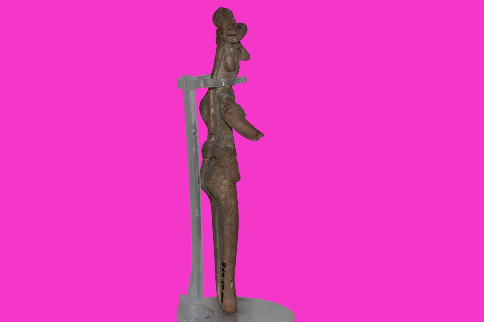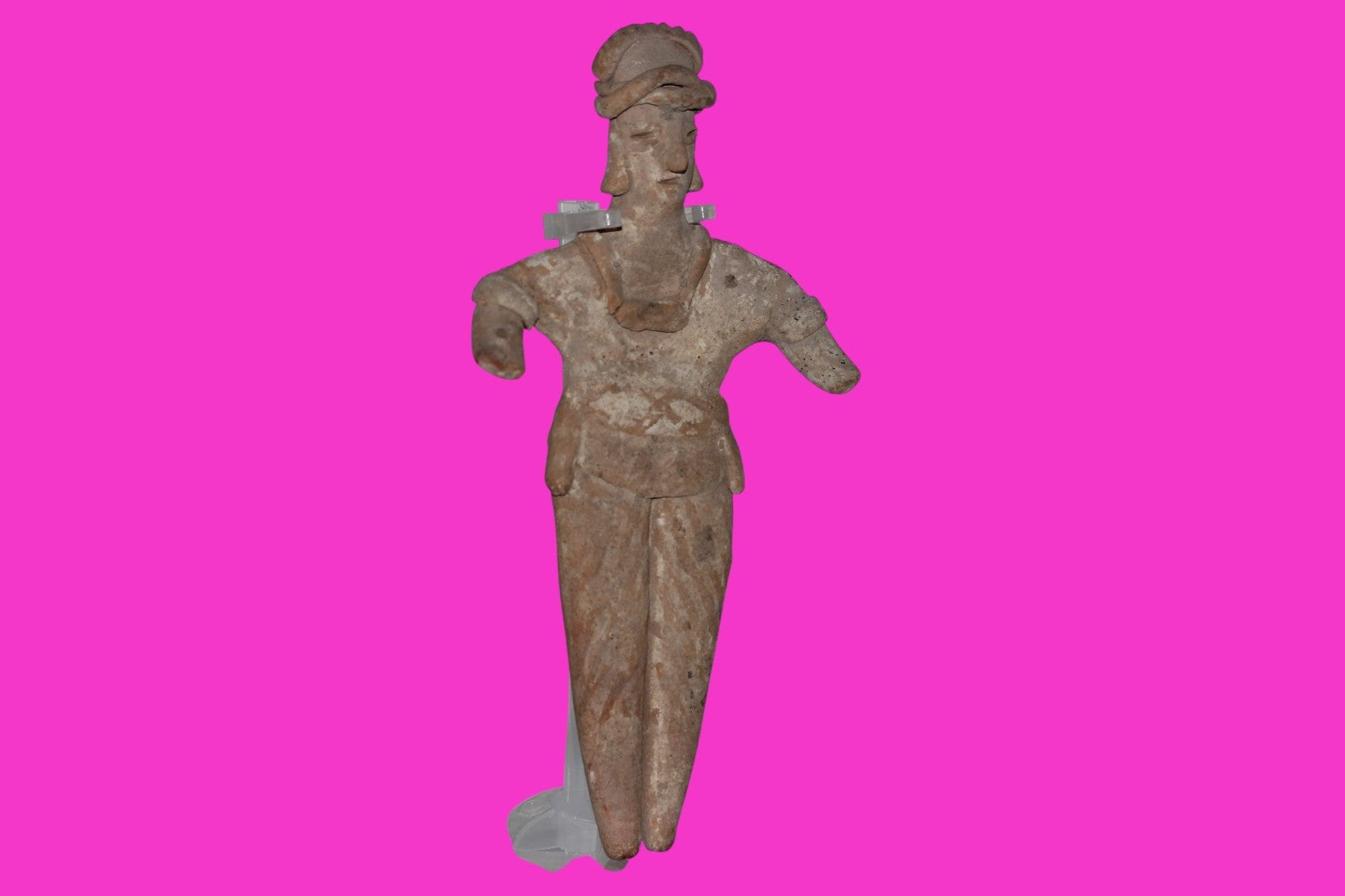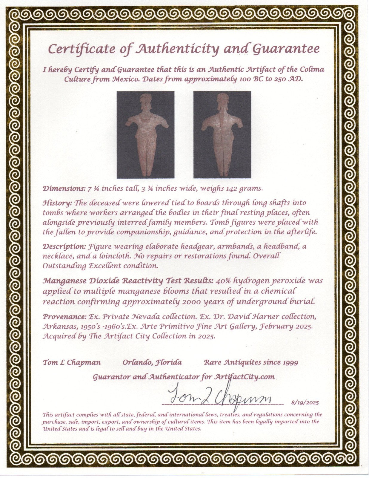 Dimensions: 7 ¼ inches tall, 3 ¾ inches wide, weighs 142 grams. History: The deceased were lowered tied to boards through long shafts into tombs where workers arranged the bodies in their final resting places, often alongside previously interred family members. Tomb figures were placed with the fallen to provide companionship, guidance, and protection in the afterlife. Description: Figure wearing elaborate headgear, armbands, a headband, a necklace, and a loincloth. No repairs or restorations found. Overall Outstanding Excellent condition. Manganese Dioxide Reactivity Test Results: 40% hydrogen peroxide was applied to multiple manganese blooms that resulted in a chemical reaction confirming approximately 2000 years of underground burial. Provenance: Ex. Private Nevada collection. Ex. Dr. David Harner collection, Arkansas, 1950’s -1960’s.Ex. Arte Primitivo Fine Art Gallery, February 2025. Acquired by The Artifact City Collection in 2025.