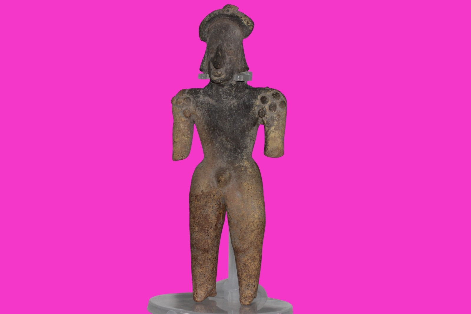 Dimensions: 7 ½ inches tall, 3 inches wide, weighs 221 grams. History: The deceased were lowered tied to boards through long shafts into tombs where workers arranged them in their final resting places, often alongside previous deceased family members. Tomb figures were placed with the fallen to provide companionship, guidance, and protection in the afterlife. Description: Male Shaman figure with shoulder nodes and wearing a headwrap. Left buttock reattached. Mineral deposits confirm approximately 2000 years of underground burial. Overall excellent condition. Provenance: Ex. Private Nevada collection. Ex. Dr. David Harner collection, Arkansas, 1950’s -1960’s.Ex. Arte Primitivo Fine Art Gallery 2025. Acquired by The Artifact City Collection in 2025.