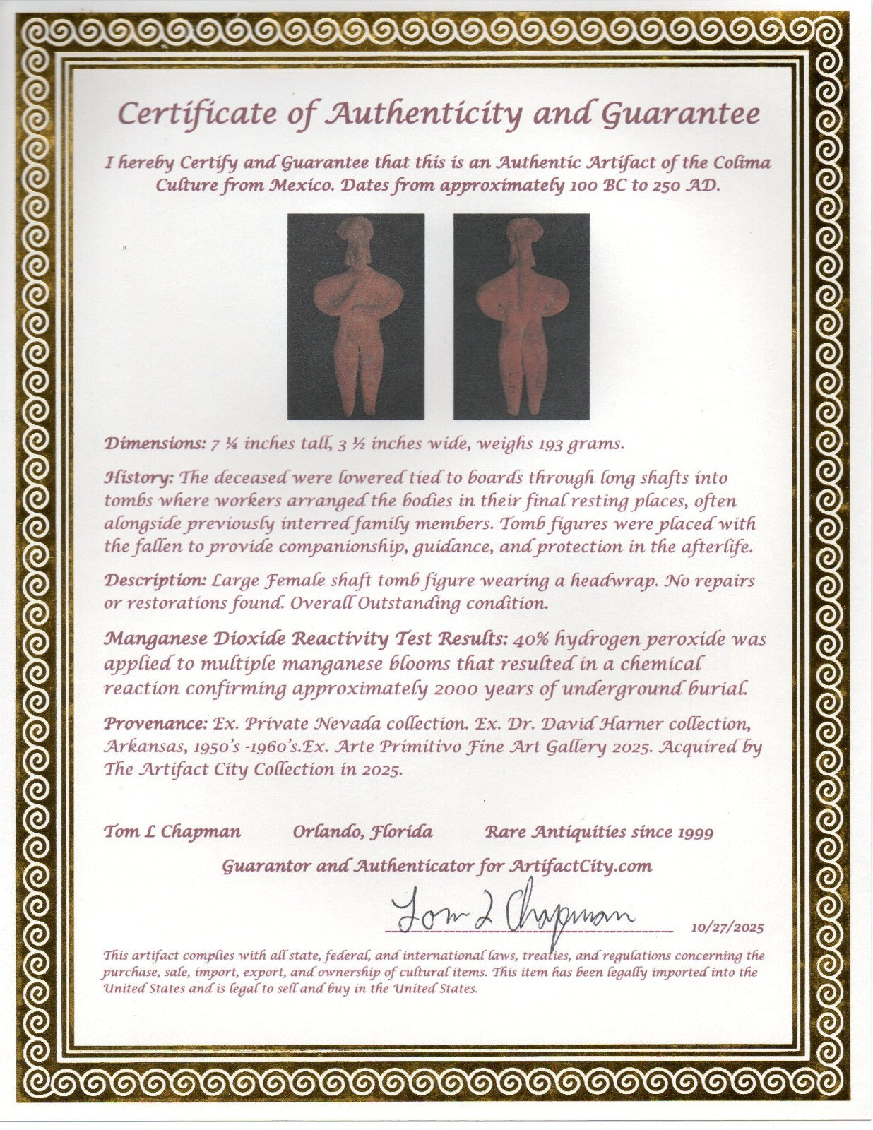 Dimensions: 7 ¼ inches tall, 3 ½ inches wide, weighs 193 grams. History: The deceased were lowered tied to boards through long shafts into tombs where workers arranged the bodies in their final resting places, often alongside previously interred family members. Tomb figures were placed with the fallen to provide companionship, guidance, and protection in the afterlife. Description: Large Female shaft tomb figure wearing a headwrap. No repairs or restorations found. Overall Outstanding condition. Manganese Dioxide Reactivity Test Results: 40% hydrogen peroxide was applied to multiple manganese blooms that resulted in a chemical reaction confirming approximately 2000 years of underground burial. Provenance: Ex. Private Nevada collection. Ex. Dr. David Harner collection, Arkansas, 1950’s -1960’s.Ex. Arte Primitivo Fine Art Gallery 2025. Acquired by The Artifact City Collection in 2025.