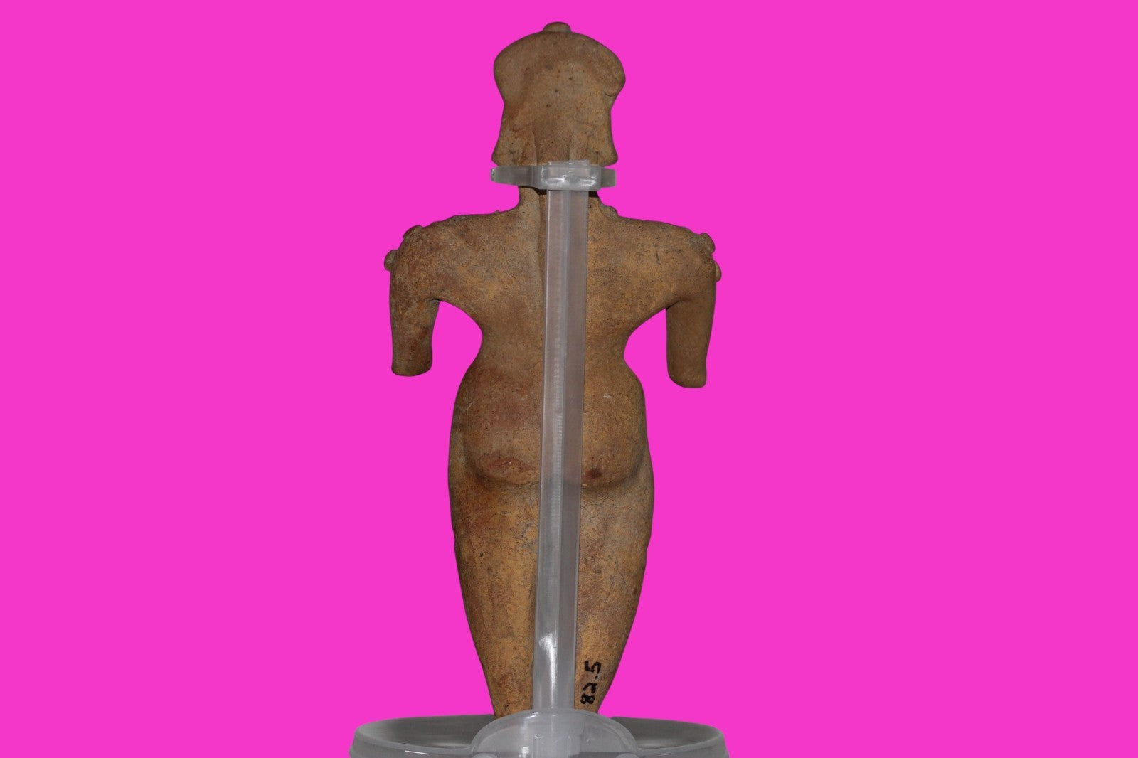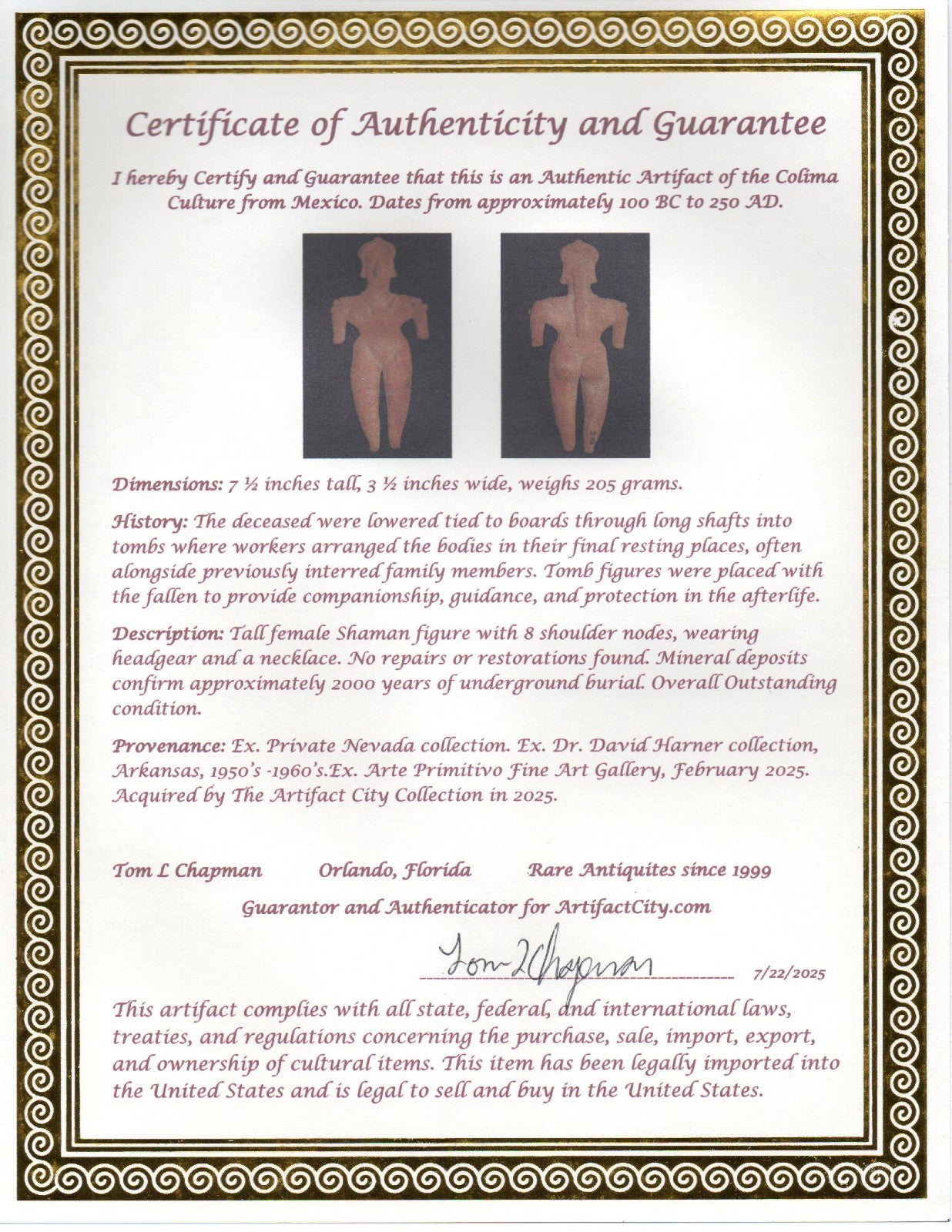 Dimensions: 7 ½ inches tall, 3 ½ inches wide, weighs 205 grams. History: The deceased were lowered tied to boards through long shafts into tombs where workers arranged the bodies in their final resting places, often alongside previously interred family members. Tomb figures were placed with the fallen to provide companionship, guidance, and protection in the afterlife. Description: Tall female Shaman figure with 8 shoulder nodes, wearing headgear and a necklace. No repairs or restorations found. Mineral deposits confirm approximately 2000 years of underground burial. Overall Outstanding condition. Provenance: Ex. Private Nevada collection. Ex. Dr. David Harner collection, Arkansas, 1950’s -1960’s.Ex. Arte Primitivo Fine Art Gallery, February 2025. Acquired by The Artifact City Collection in 2025.