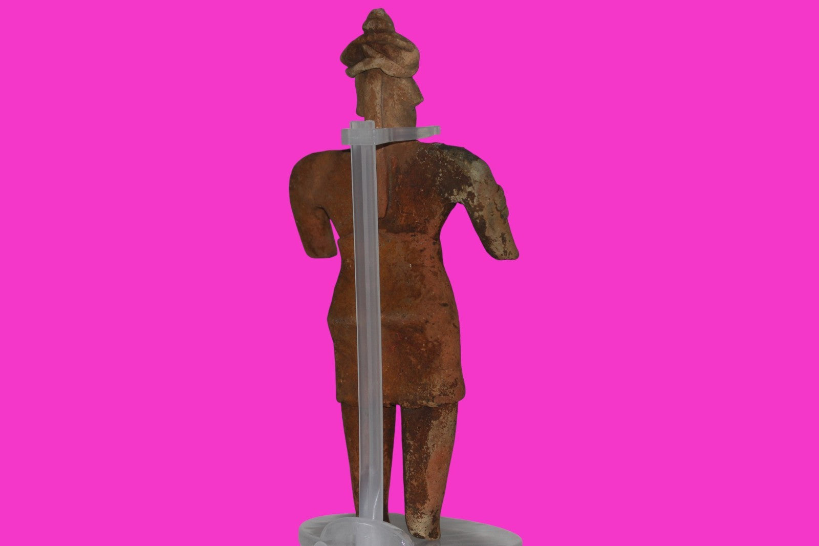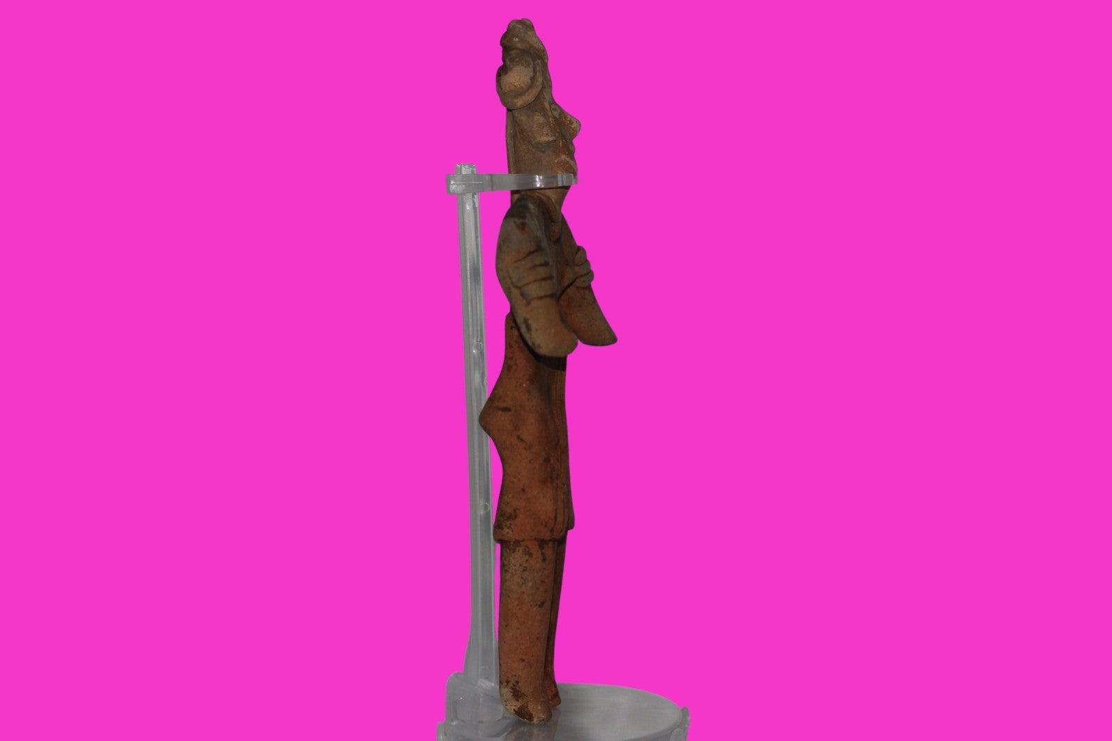 Dimensions: 8 ¼ inches tall, 4 inches wide, weighs 216 grams. History: The deceased were lowered tied to boards through long shafts into tombs where workers arranged the bodies in their final resting places, often alongside previously interred family members. Tomb figures were placed with the fallen to provide companionship, guidance, and protection in the afterlife. Description: Female figure wearing a headwrap, necklace, 6 arm bands, and a skirt. Professionally reattached head and left arm. Some surface loss to the tassel of the headwrap and right shoulder. Mineral deposits confirm approximately 2000 years of underground burial. Overall Excellent condition. Provenance: Ex. Private Nevada collection. Ex. Dr. David Harner collection, Arkansas, 1950’s -1960’s.Ex. Arte Primitivo Fine Art Gallery, February 2025. Acquired by The Artifact City Collection in 2025.