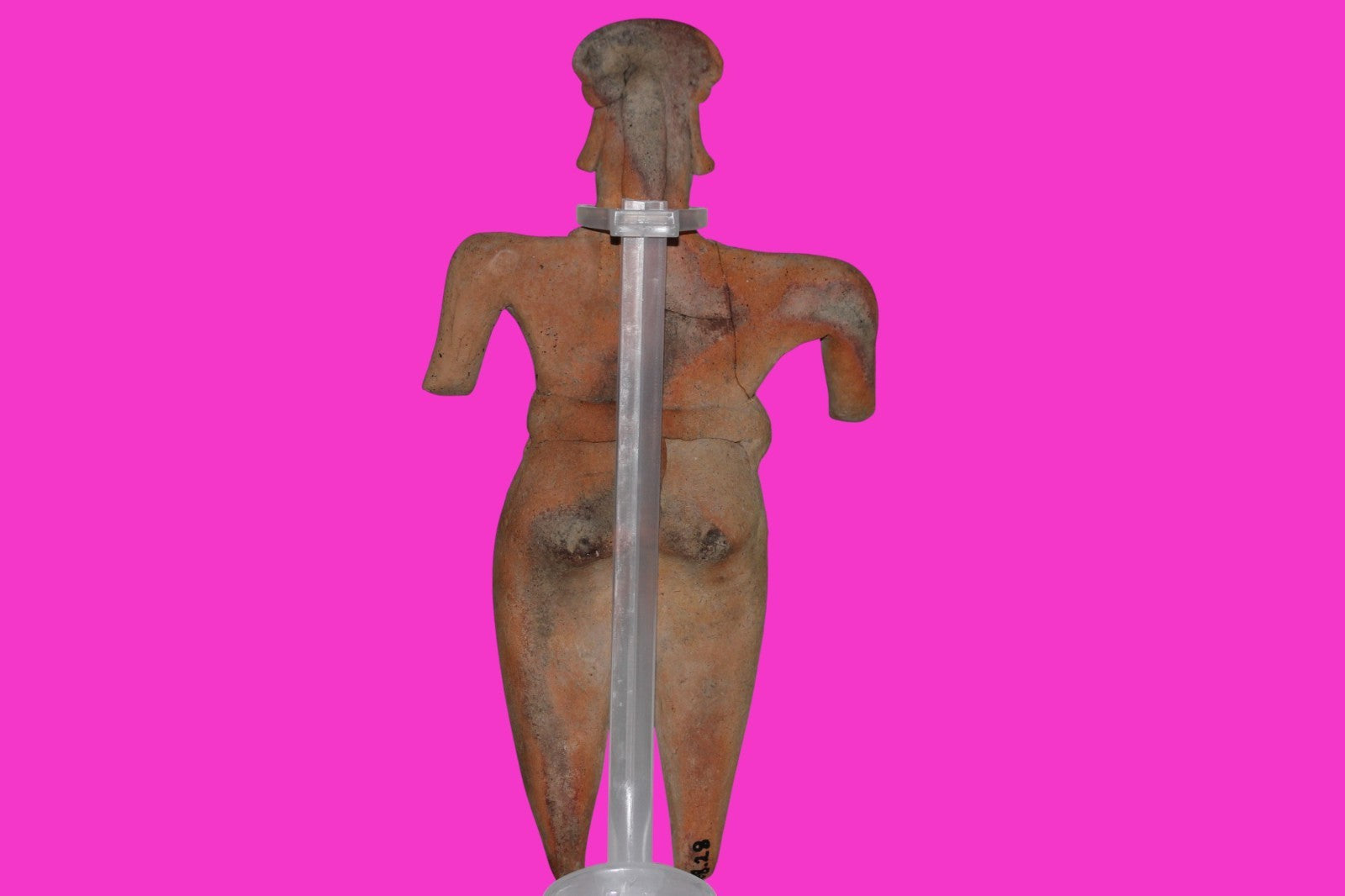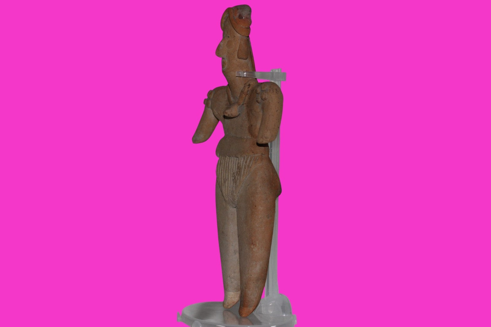 Dimensions: 8 ¼ inches tall, 4 ½ inches wide, weighs 294 grams. History: The deceased were lowered tied to boards through long shafts into tombs where workers arranged them in their final resting places, often alongside previous deceased family members. Tomb figures were placed with the fallen to provide companionship, guidance, and protection in the afterlife. Description: Tall male Shaman figure with shoulder nodes, wearing a headwrap, necklace, and a loincloth. Both arms and top of torso professionally reattached and restored. Mineral deposits confirm approximately 2000 years of underground burial. Overall excellent condition. Provenance: Ex. Private Nevada collection. Ex. Dr. David Harner collection, Arkansas, 1950’s -1960’s.Ex. Arte Primitivo Fine Art Gallery 2025. Acquired by The Artifact City Collection in 2025.
