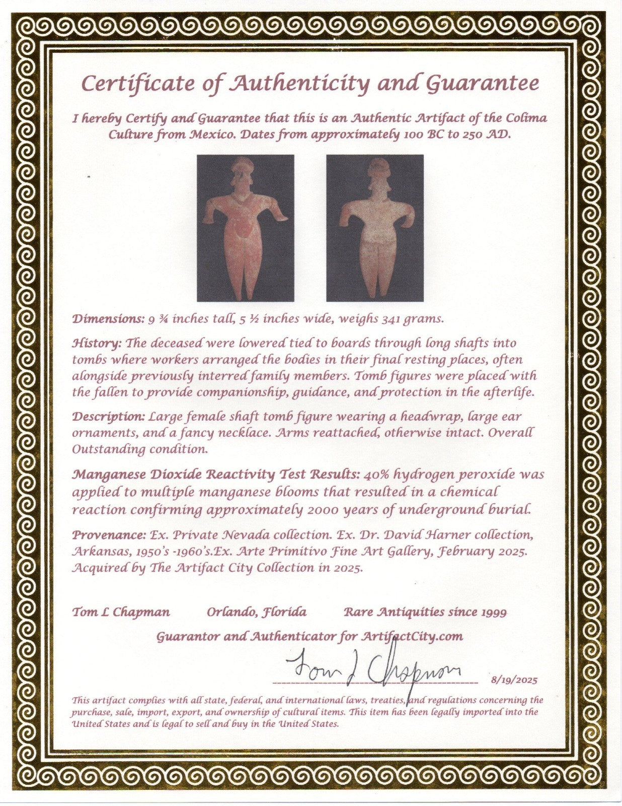 Dimensions: 9 ¾ inches tall, 5 ½ inches wide, weighs 341 grams. History: The deceased were lowered tied to boards through long shafts into tombs where workers arranged the bodies in their final resting places, often alongside previously interred family members. Tomb figures were placed with the fallen to provide companionship, guidance, and protection in the afterlife. Description: Large female shaft tomb figure wearing a headwrap, large ear ornaments, and a fancy necklace. Arms reattached, otherwise intact. Overall Outstanding condition. Manganese Dioxide Reactivity Test Results: 40% hydrogen peroxide was applied to multiple manganese blooms that resulted in a chemical reaction confirming approximately 2000 years of underground burial. Provenance: Ex. Private Nevada collection. Ex. Dr. David Harner collection, Arkansas, 1950’s -1960’s.Ex. Arte Primitivo Fine Art Gallery, February 2025. Acquired by The Artifact City Collection in 2025.