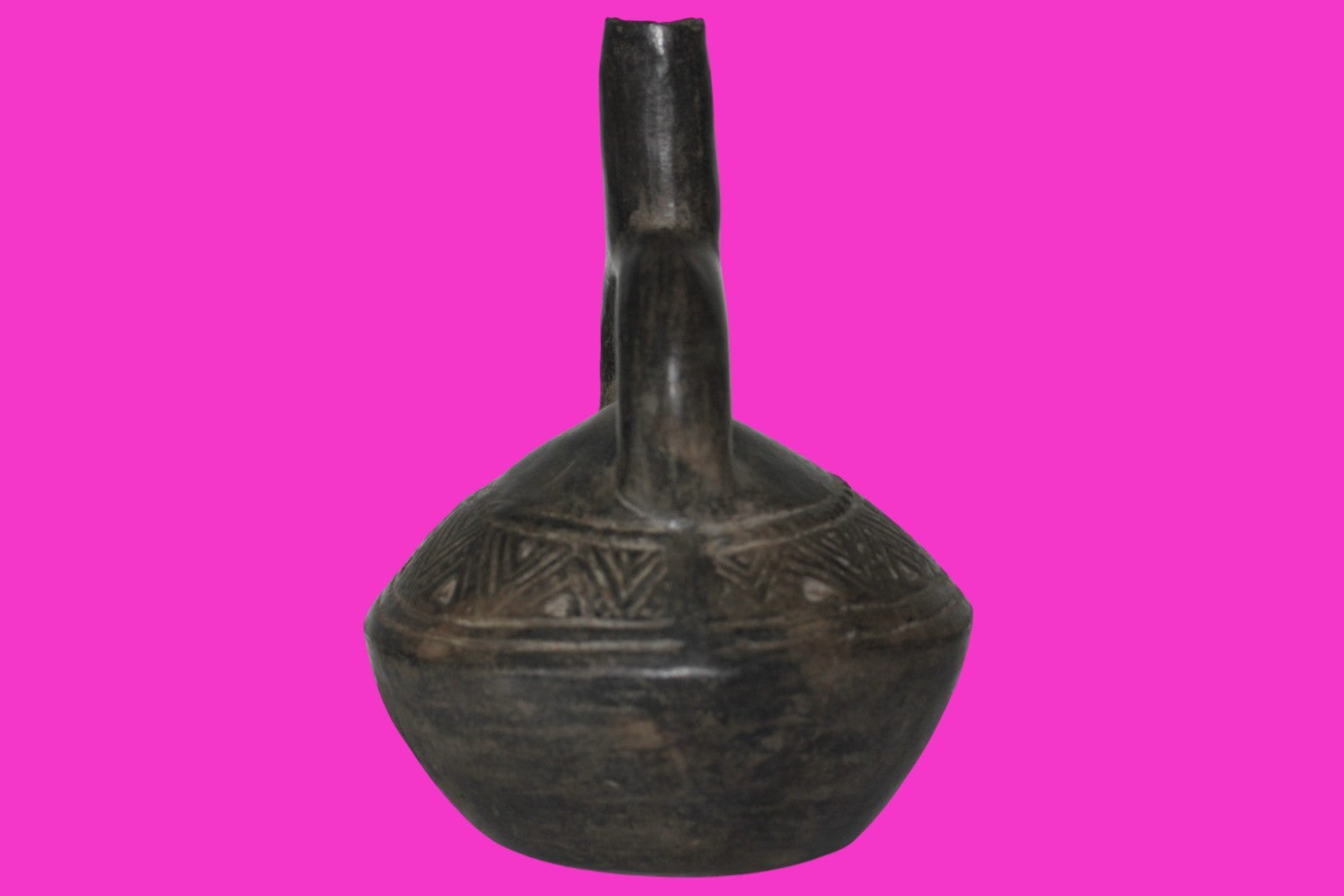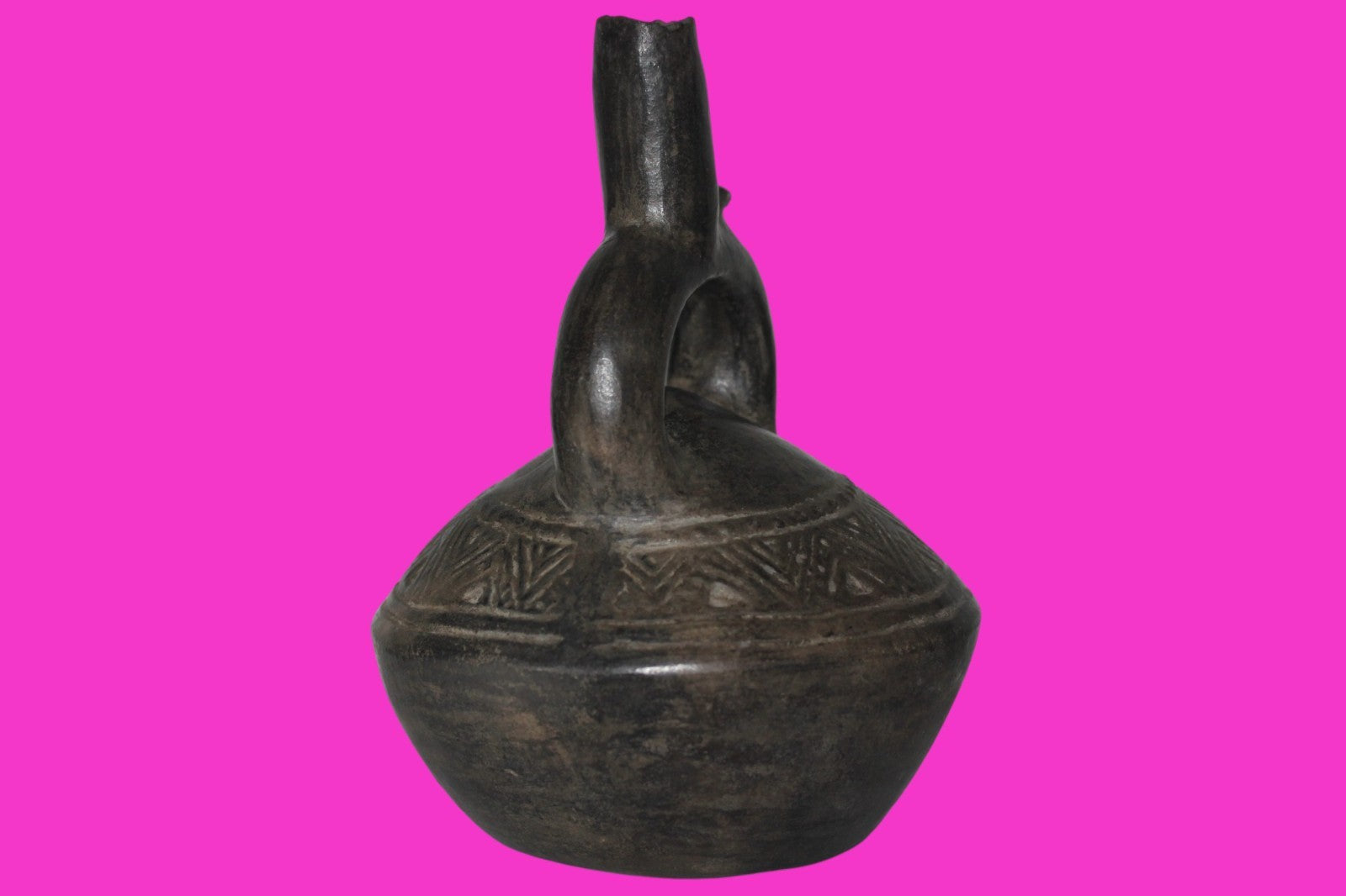 Dimensions: 8 ½ inches tall, 6 ¼ inches wide, weighs 479 grams. Description: Large blackware single spout stirrup vessel decorated with multiple raised chevrons and dots above incised fields. A small animal most likely a bird is perched on the handle up against the spout. No repairs or restorations found. Small chips on the spout, otherwise intact. Abrasions, wear consistent with age. Overall outstanding condition. Provenance: Ex. Private Tampa, FL collection, acquired in the 1960’s. Acquired by John McIntosh, MSE, MBA of Ancient Artifacts & Treasures, Winter Park, FL in 2019. Acquired by The Artifact City Collection in 2025.