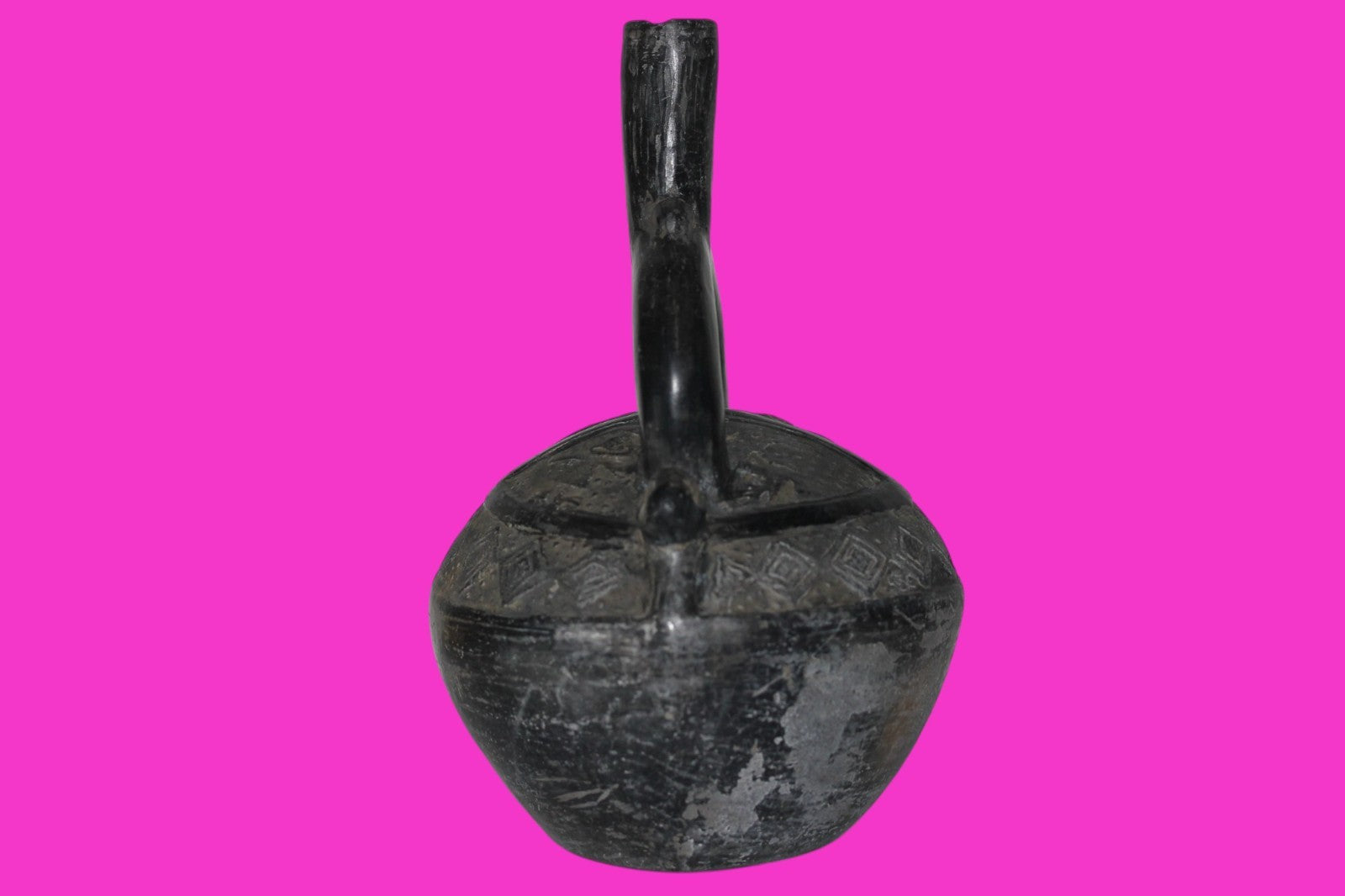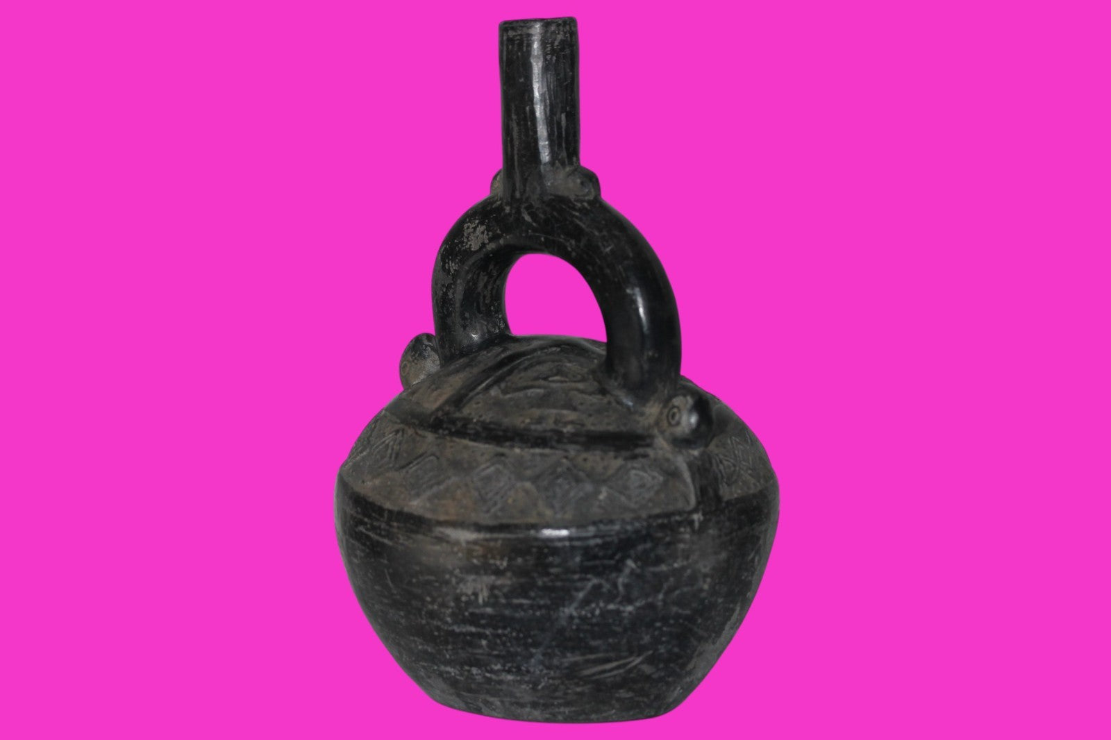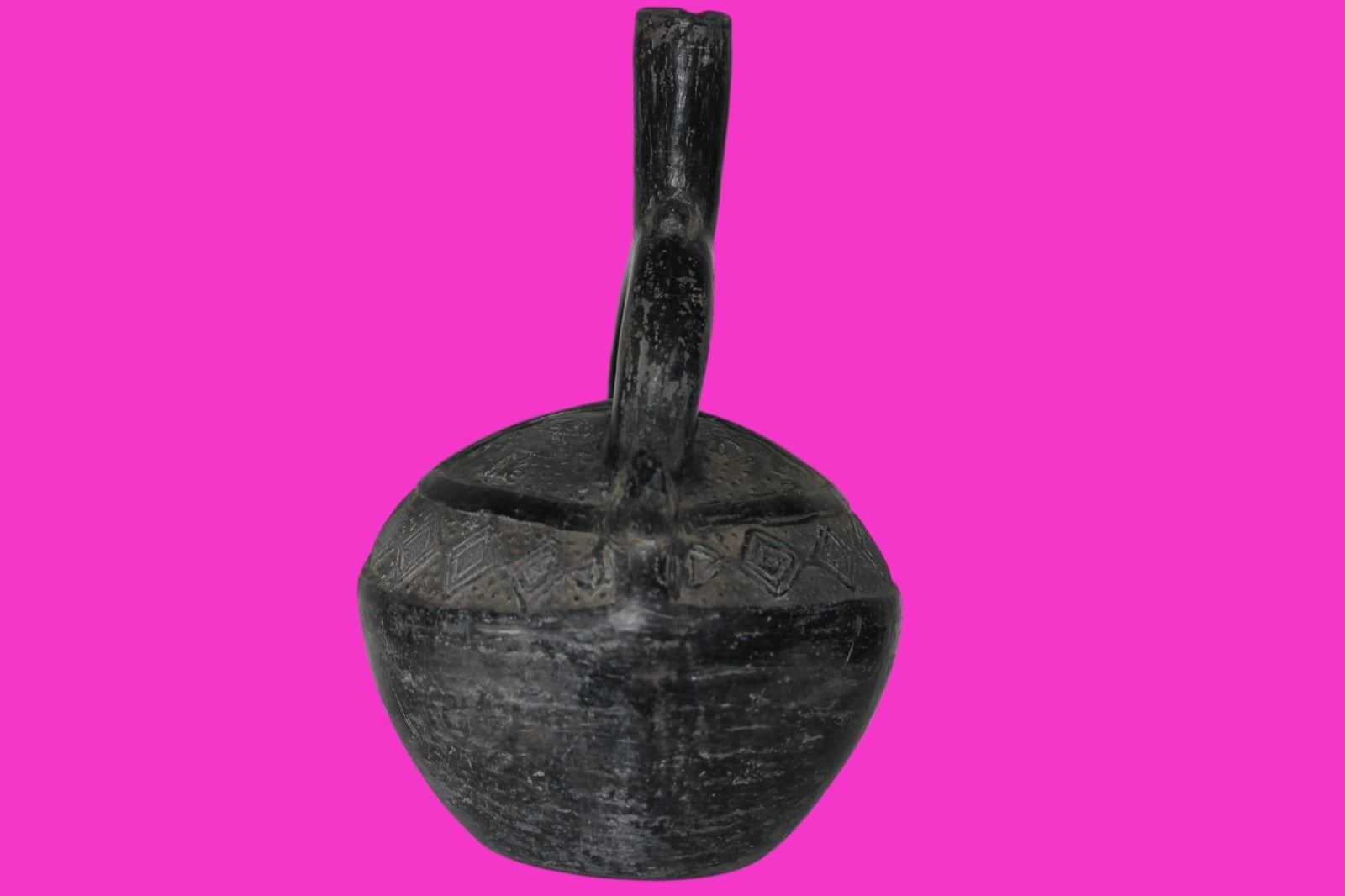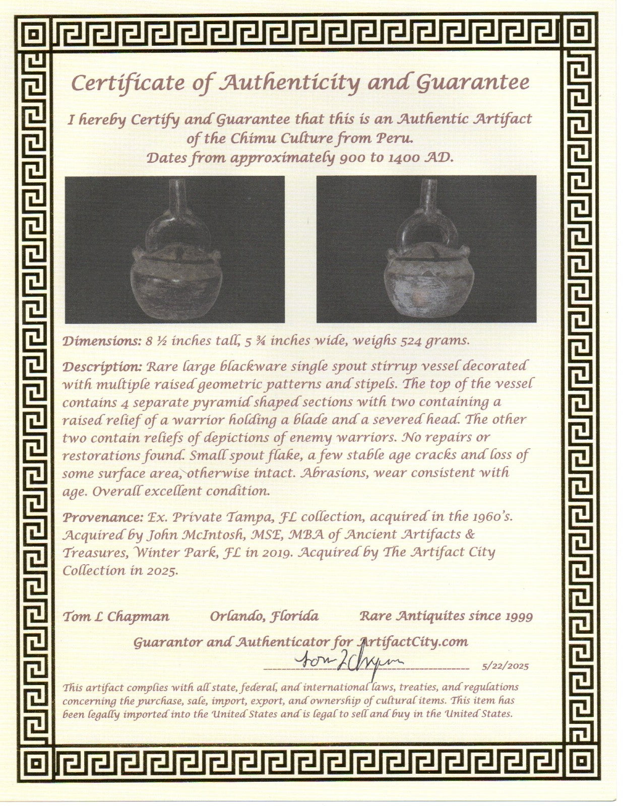 Dimensions: 8 ½ inches tall, 5 ¾ inches wide, weighs 524 grams. Description: Rare large blackware single spout stirrup vessel decorated with multiple raised geometric patterns and stipels. The top of the vessel contains 4 separate pyramid shaped sections with two containing a raised relief of a warrior holding a blade and a severed head. The other two contain reliefs of depictions of enemy warriors. No repairs or restorations found. Small spout flake, a few stable age cracks and loss of some surface area, otherwise intact. Abrasions, wear consistent with age. Overall excellent condition. Provenance: Ex. Private Tampa, FL collection, acquired in the 1960’s. Acquired by John McIntosh, MSE, MBA of Ancient Artifacts & Treasures, Winter Park, FL in 2019. Acquired by The Artifact City Collection in 2025.