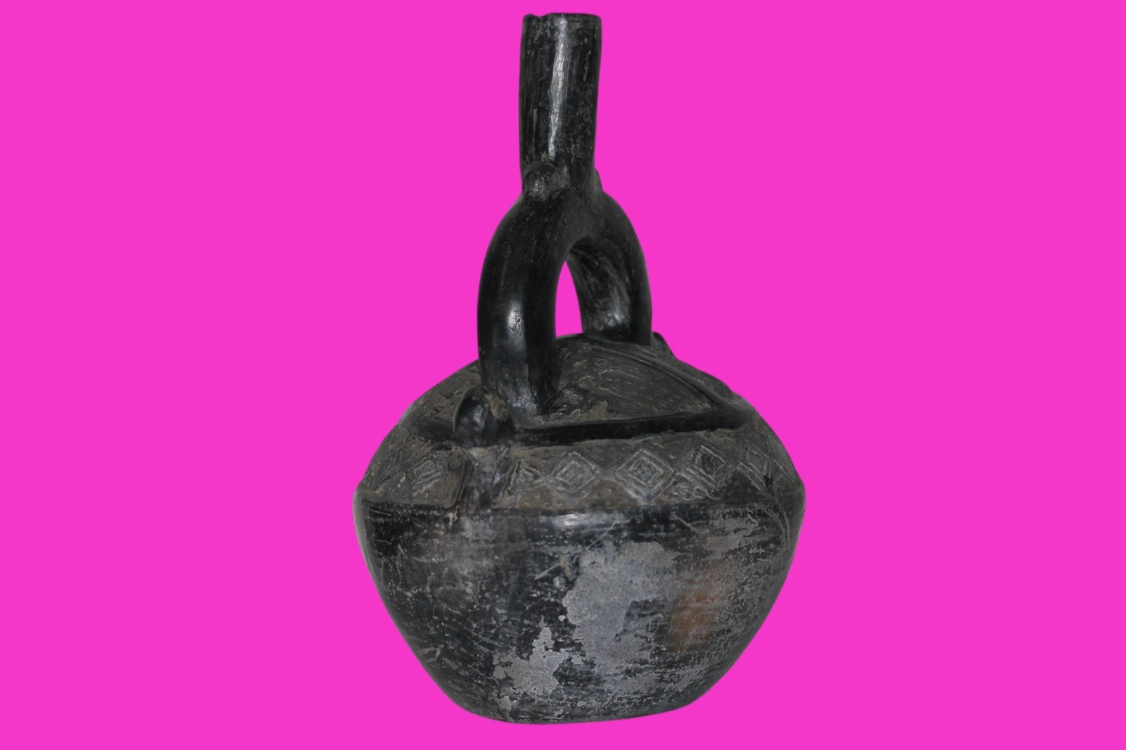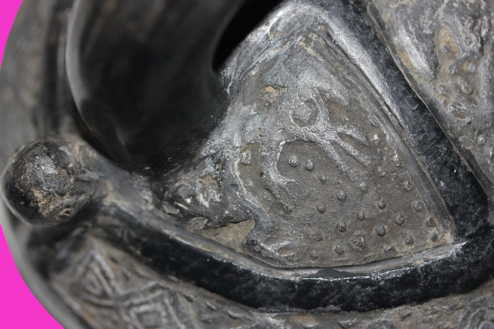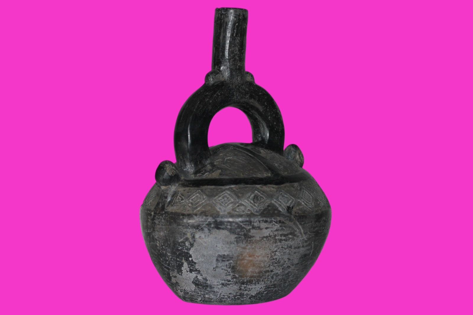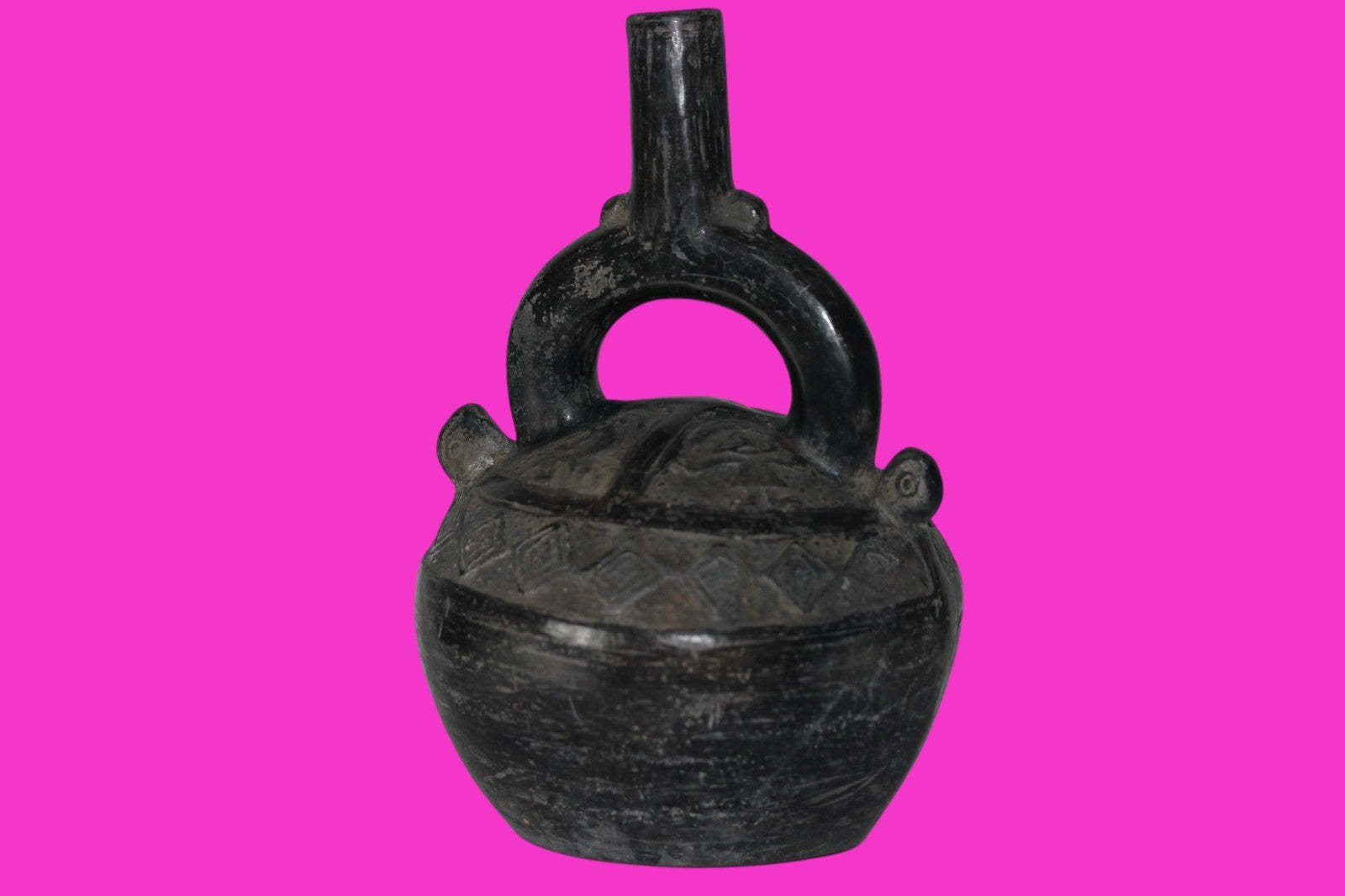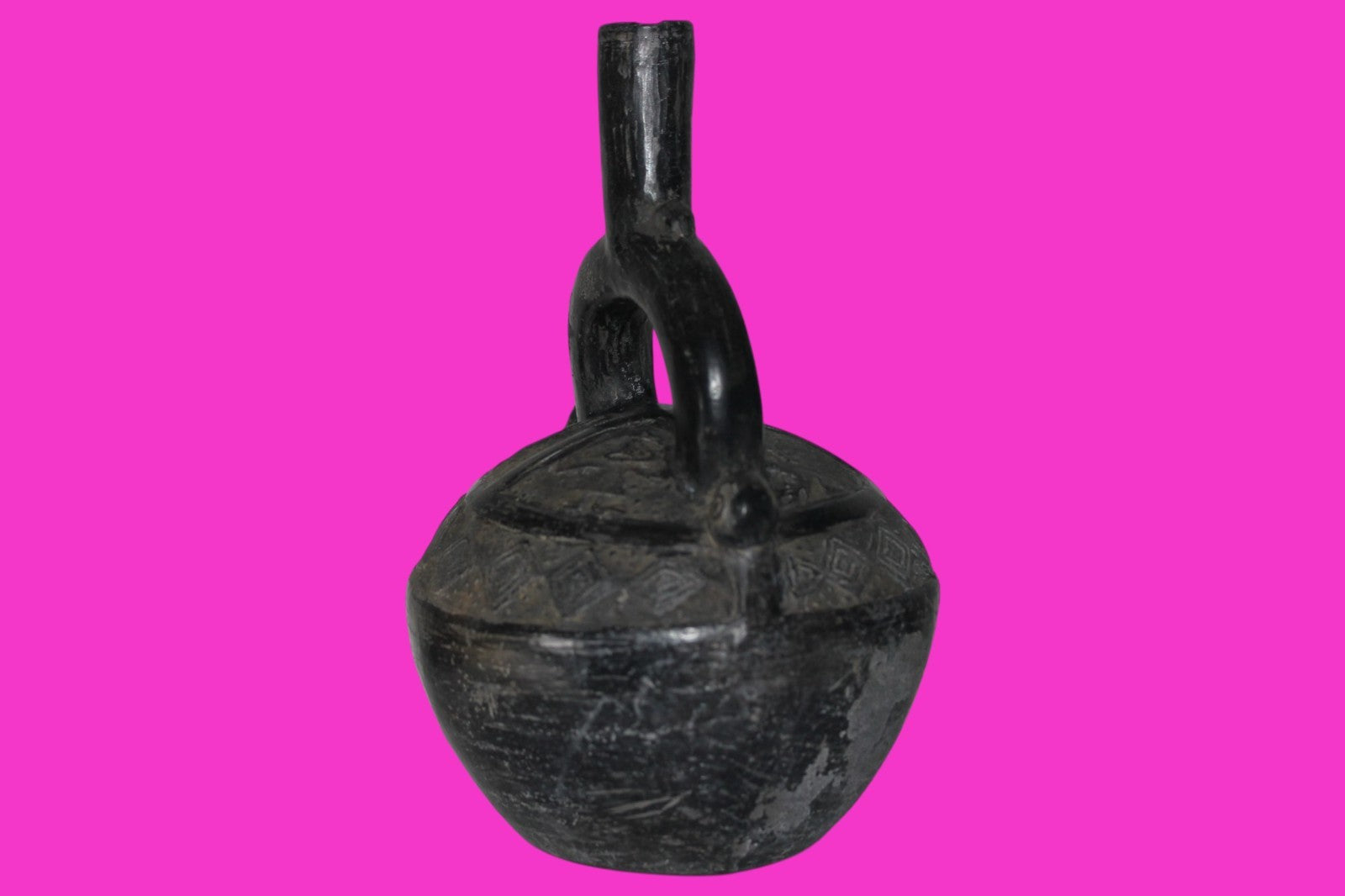 Dimensions: 8 ½ inches tall, 5 ¾ inches wide, weighs 524 grams. Description: Rare large blackware single spout stirrup vessel decorated with multiple raised geometric patterns and stipels. The top of the vessel contains 4 separate pyramid shaped sections with two containing a raised relief of a warrior holding a blade and a severed head. The other two contain reliefs of depictions of enemy warriors. No repairs or restorations found. Small spout flake, a few stable age cracks and loss of some surface area, otherwise intact. Abrasions, wear consistent with age. Overall excellent condition. Provenance: Ex. Private Tampa, FL collection, acquired in the 1960’s. Acquired by John McIntosh, MSE, MBA of Ancient Artifacts & Treasures, Winter Park, FL in 2019. Acquired by The Artifact City Collection in 2025.