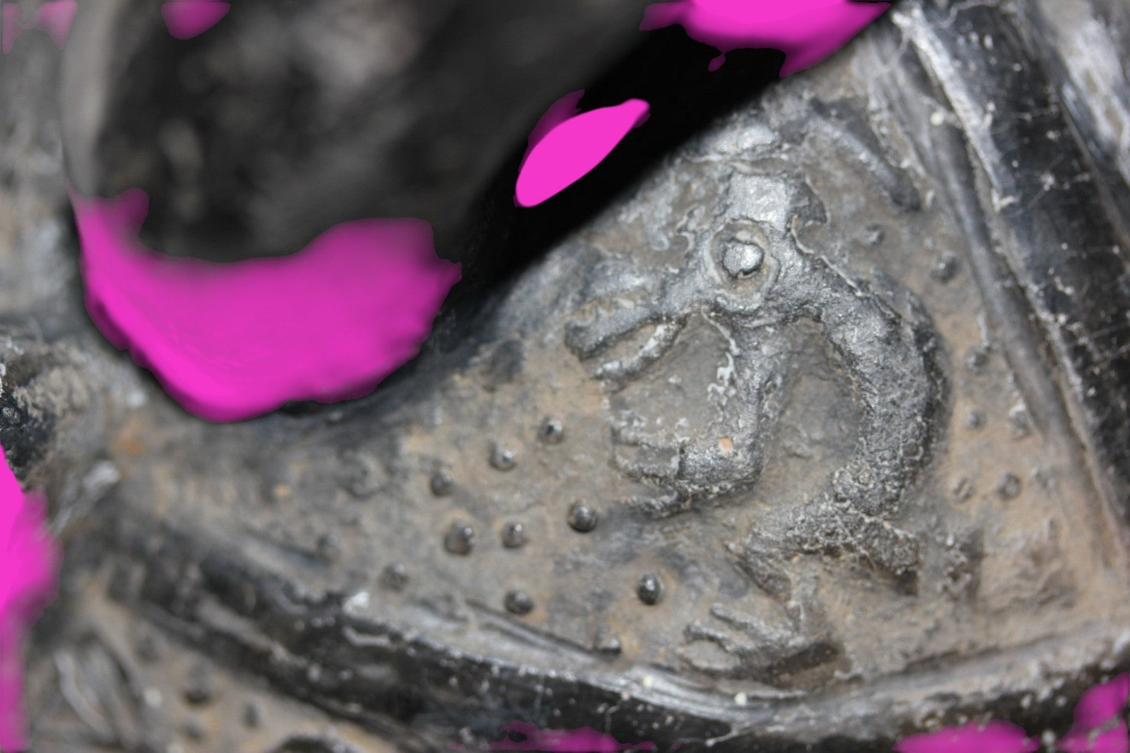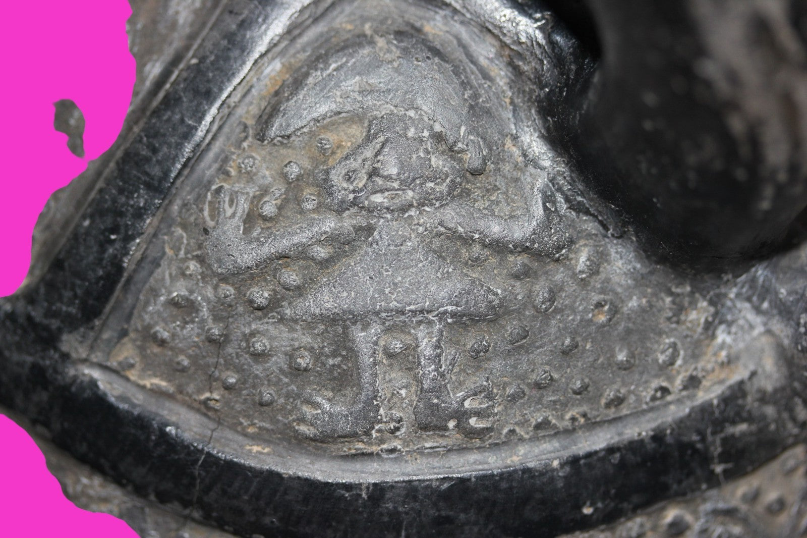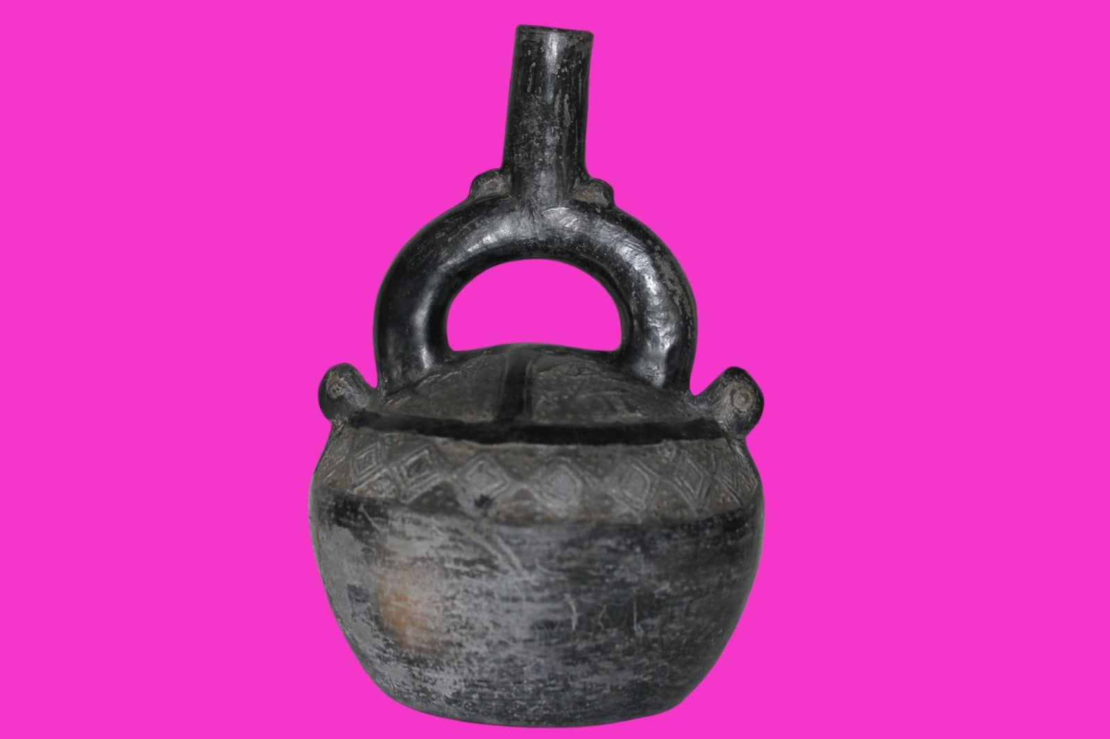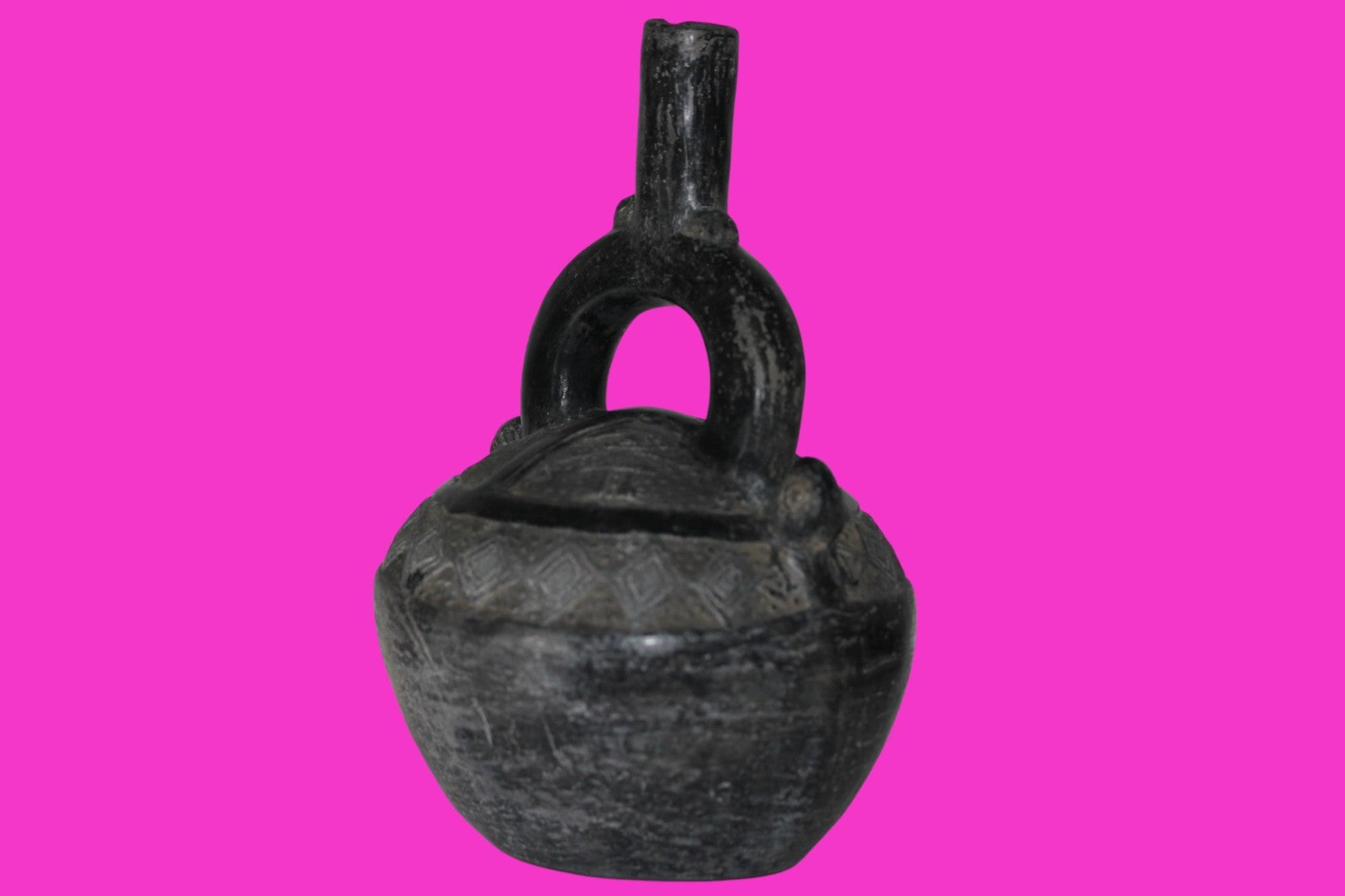Dimensions: 8 ½ inches tall, 5 ¾ inches wide, weighs 524 grams. Description: Rare large blackware single spout stirrup vessel decorated with multiple raised geometric patterns and stipels. The top of the vessel contains 4 separate pyramid shaped sections with two containing a raised relief of a warrior holding a blade and a severed head. The other two contain reliefs of depictions of enemy warriors. No repairs or restorations found. Small spout flake, a few stable age cracks and loss of some surface area, otherwise intact. Abrasions, wear consistent with age. Overall excellent condition. Provenance: Ex. Private Tampa, FL collection, acquired in the 1960’s. Acquired by John McIntosh, MSE, MBA of Ancient Artifacts & Treasures, Winter Park, FL in 2019. Acquired by The Artifact City Collection in 2025.