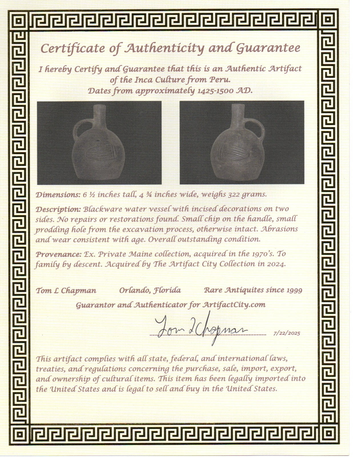 Dimensions: 6 ½ inches tall, 4 ¾ inches wide, weighs 322 grams. Description: Blackware water vessel with incised decorations on two sides. No repairs or restorations found. Small chip on the handle, small prodding hole from the excavation process, otherwise intact. Abrasions and wear consistent with age. Overall outstanding condition. Provenance: Ex. Private Maine collection, acquired in the 1970’s. To family by descent. Acquired by The Artifact City Collection in 2024.