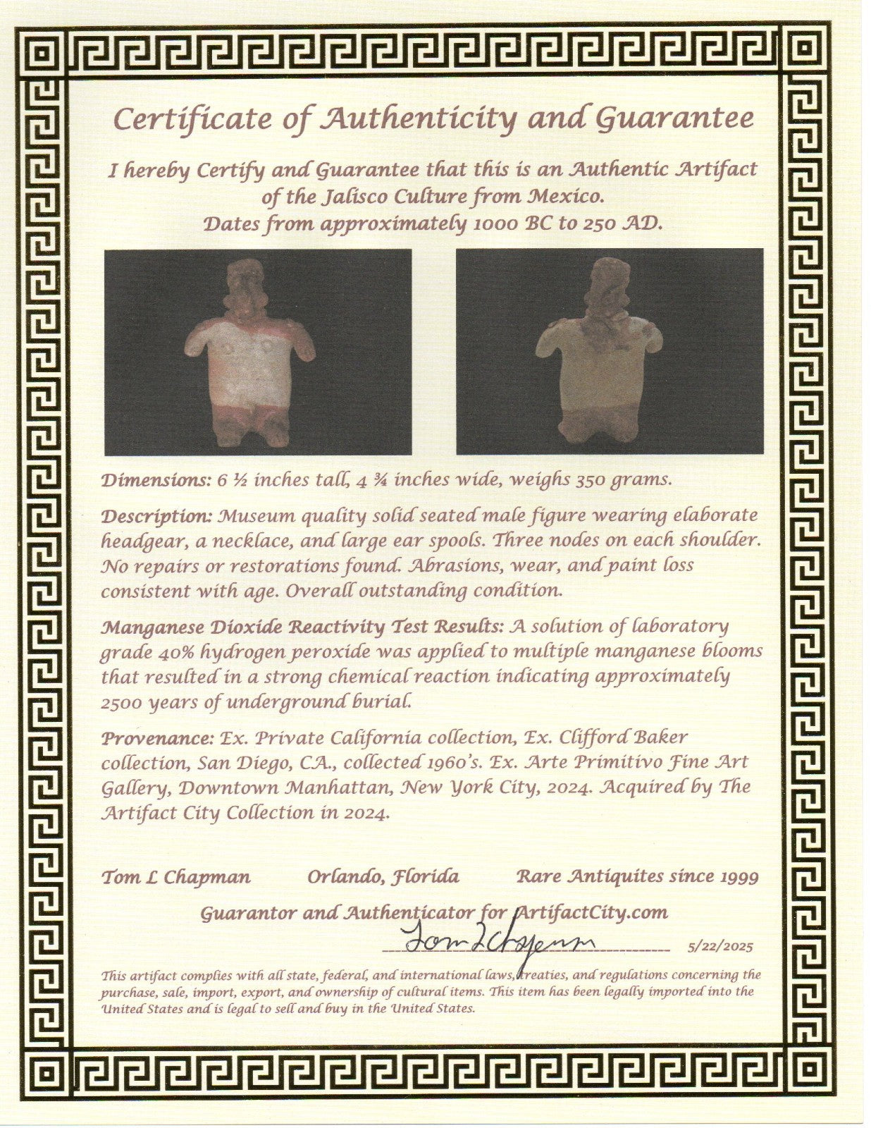 Dimensions: 6 ½ inches tall, 4 ¾ inches wide, weighs 350 grams. Description: Museum quality solid seated male figure wearing elaborate headgear, a necklace, and large ear spools. Three nodes on each shoulder. No repairs or restorations found. Abrasions, wear, and paint loss consistent with age. Overall outstanding condition. Manganese Dioxide Reactivity Test Results: A solution of laboratory grade 40% hydrogen peroxide was applied to multiple manganese blooms that resulted in a strong chemical reaction indicating approximately 2500 years of underground burial. Provenance: Ex. Private California collection, Ex. Clifford Baker collection, San Diego, CA., collected 1960’s. Ex. Arte Primitivo Fine Art Gallery, Downtown Manhattan, New York City, 2024. Acquired by The Artifact City Collection in 2024.