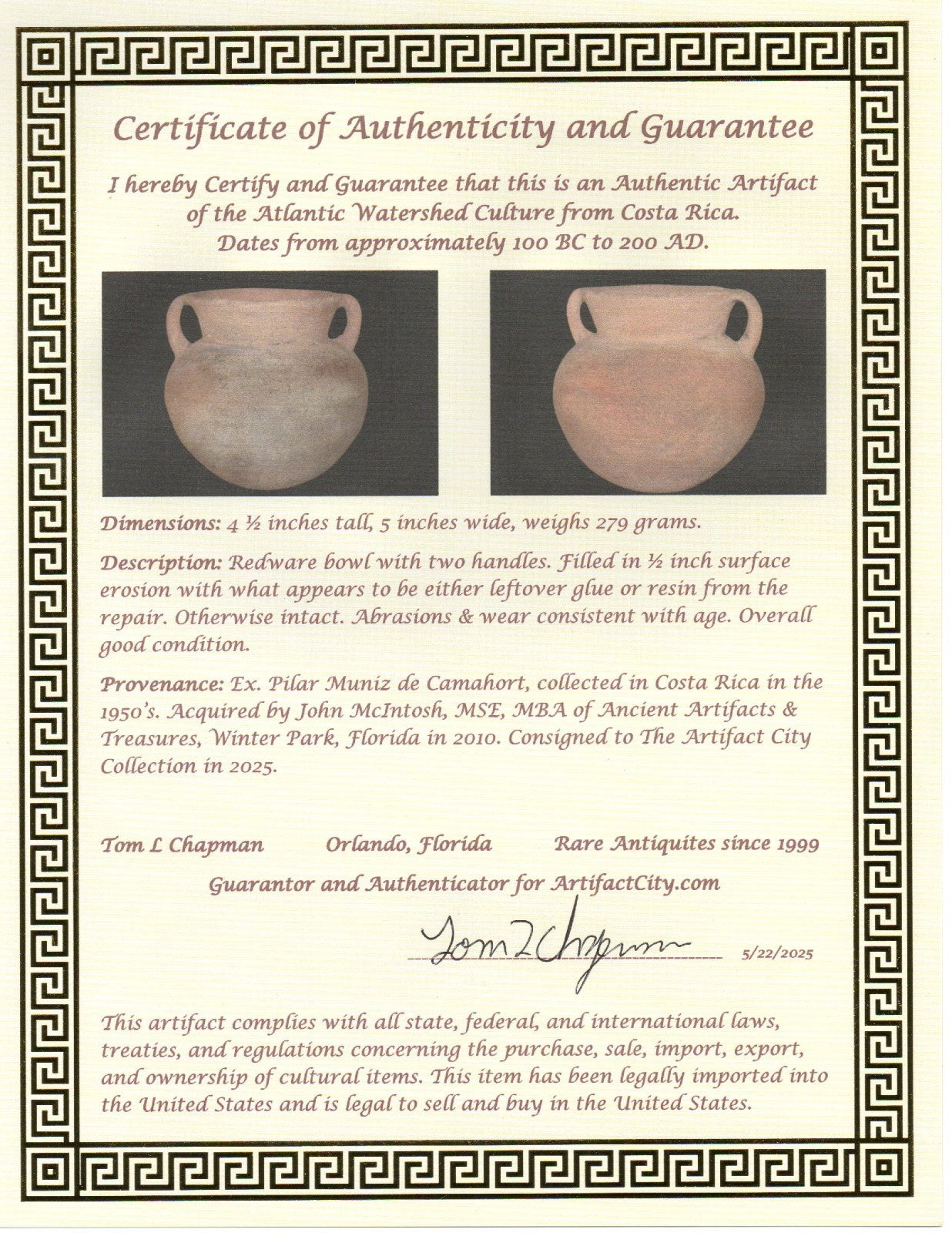 Dimensions: 4 ½ inches tall, 5 inches wide, weighs 279 grams. Description: Redware bowl with two handles. Filled in 1/2 inch surface erosion and what appears to be either leftover glue or resin from the repair. Otherwise intact. Abrasions & wear consistent with age. Overall good condition. Provenance: Ex. Pilar Muniz de Camahort, collected in Costa Rica in the 1950’s. Acquired by John McIntosh, MSE, MBA of Ancient Artifacts & Treasures, Winter Park, Florida in 2010. Consigned to The Artifact City Collection in 2025.