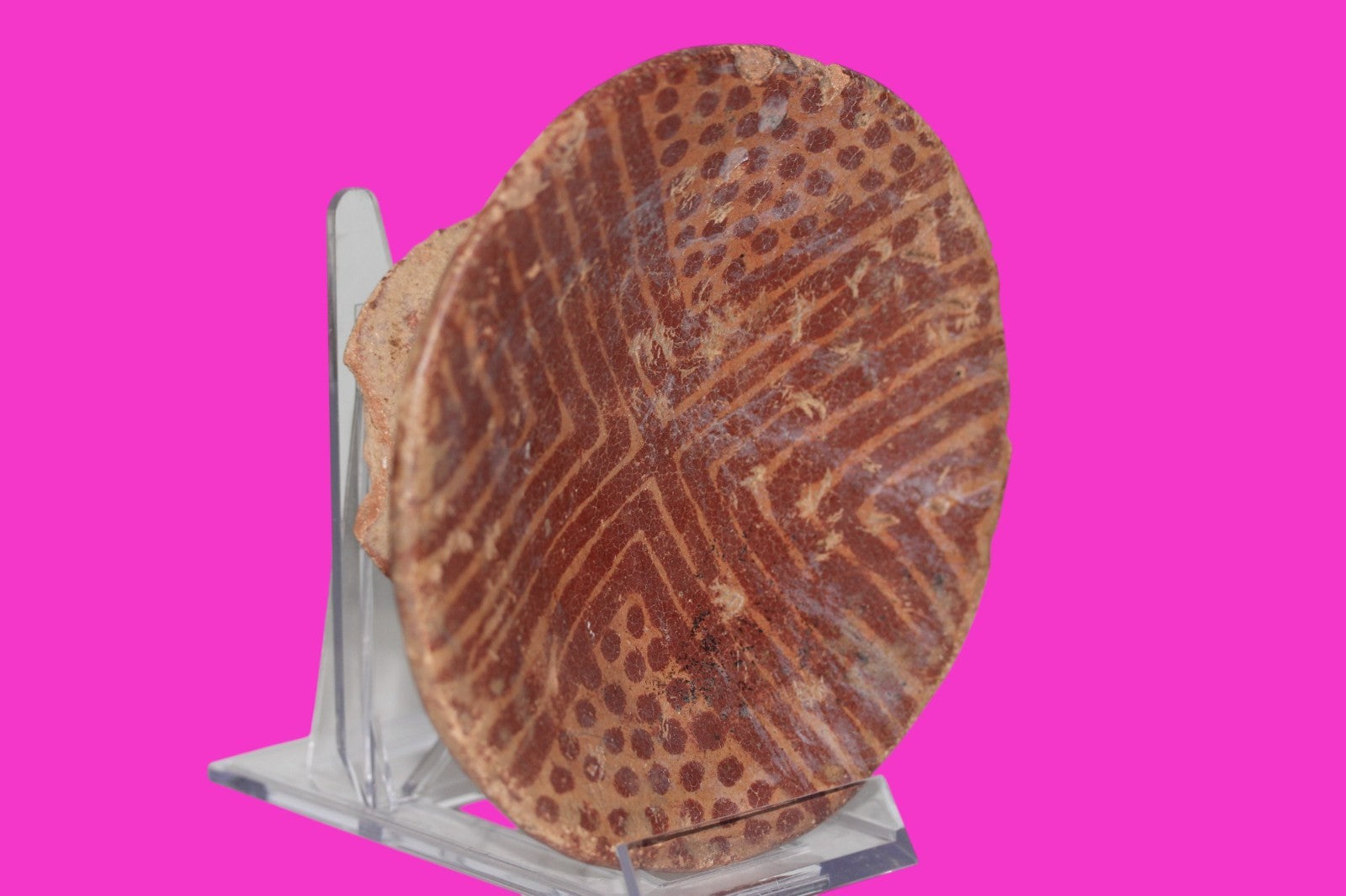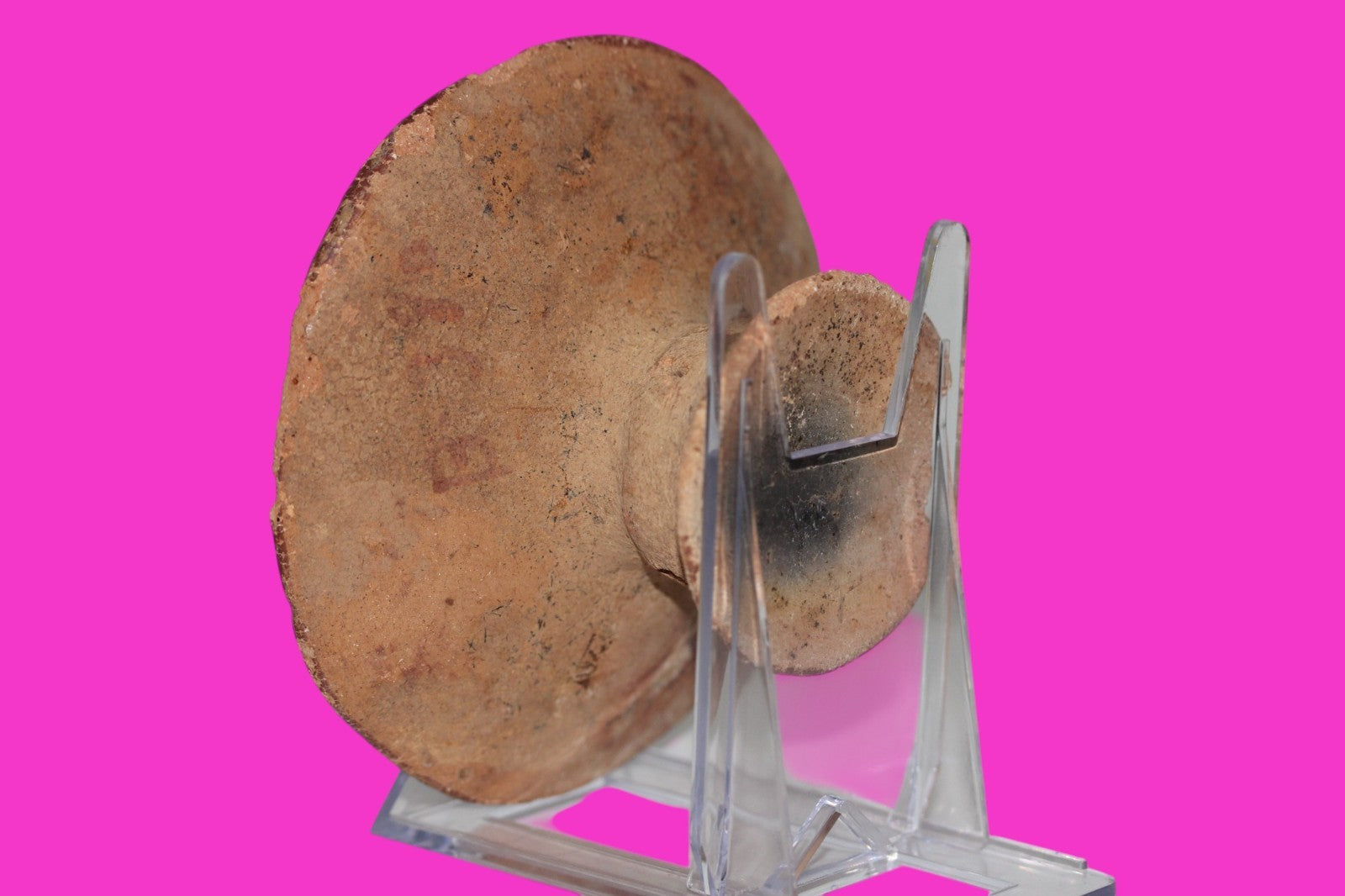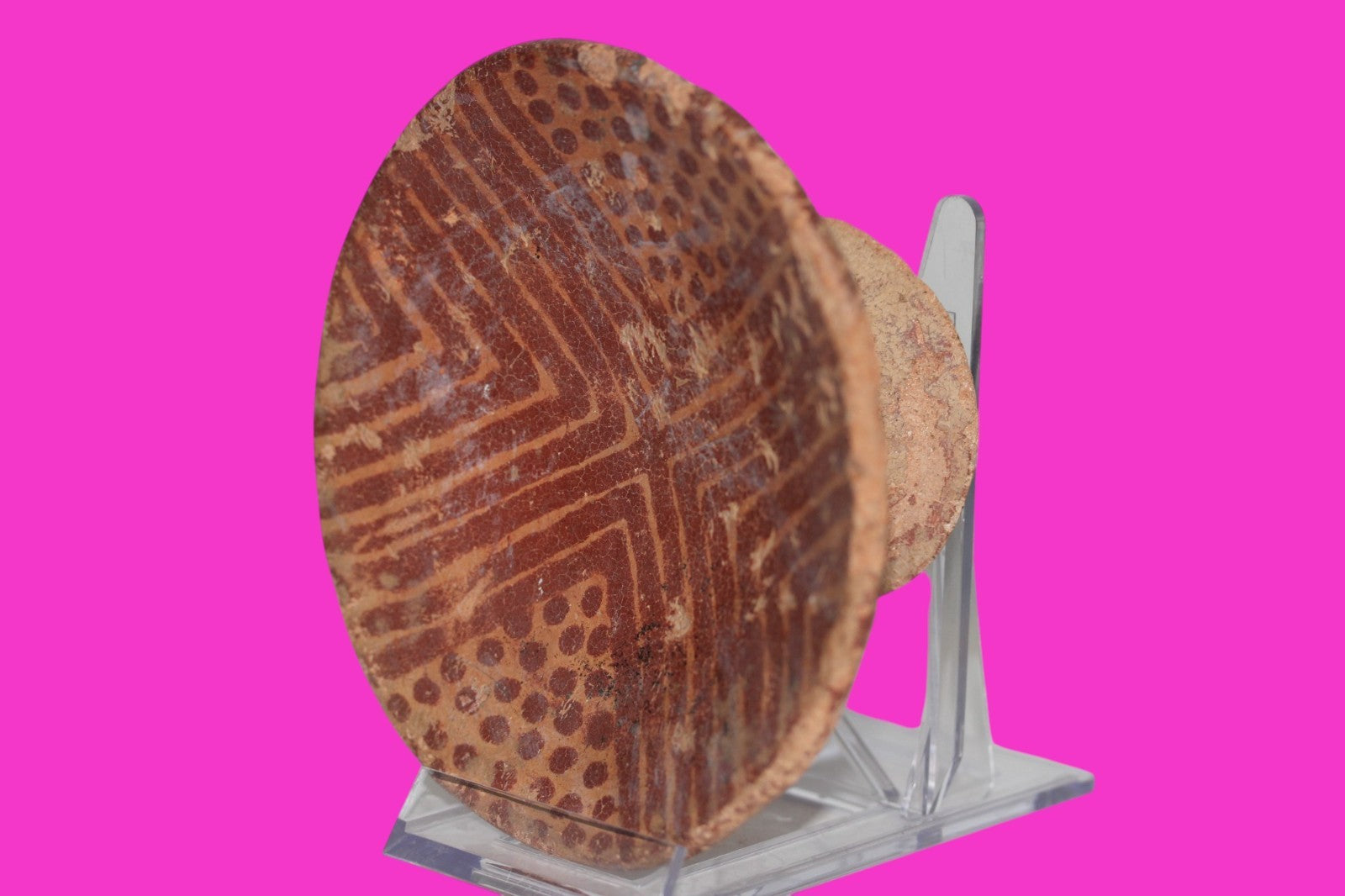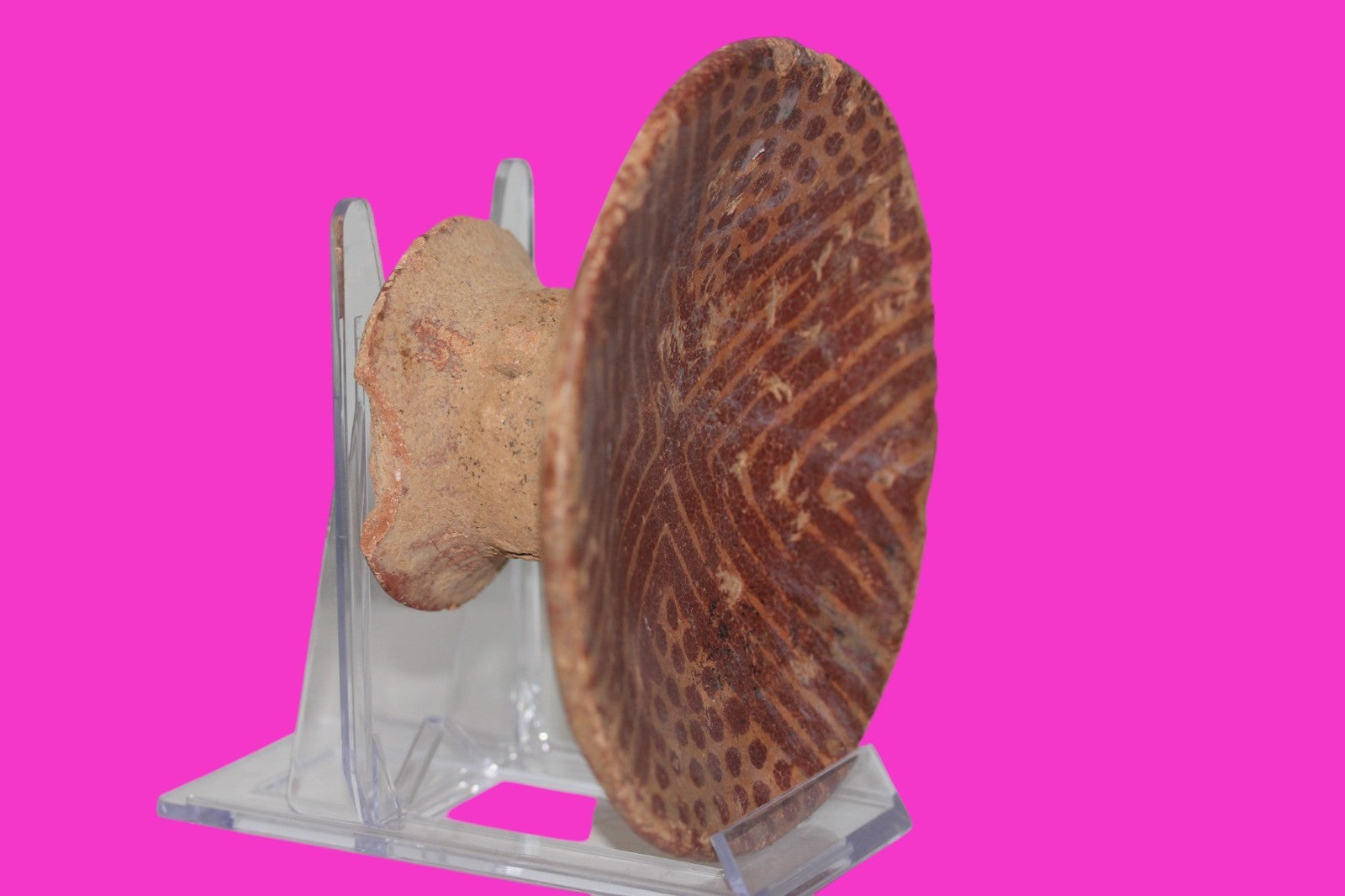 Dimensions: 2 inches tall, 5 ¼ inches wide, weighs 223 grams. Description: Small pedestal bowl decorated in red paint with geometric lines and dots. 1 ½ piece of the base chipped off. Multiple ancient flakes of the rim. Otherwise intact. No repairs or restorations found. Abrasions and wear consistent with age. Overall good condition. Manganese Dioxide Reactivity Test Results: A solution of laboratory grade 40% hydrogen peroxide was applied to multiple manganese blooms that resulted in a strong chemical reaction indicating approximately 1000 years of underground burial. Provenance: Ex. Private Chicago collection, acquired in the 1970’s. Acquired by John McIntosh of Ancient Artifacts & Treasures, Winter Park, Florida in 2022. Assigned to The Artifact City collection in 2025.