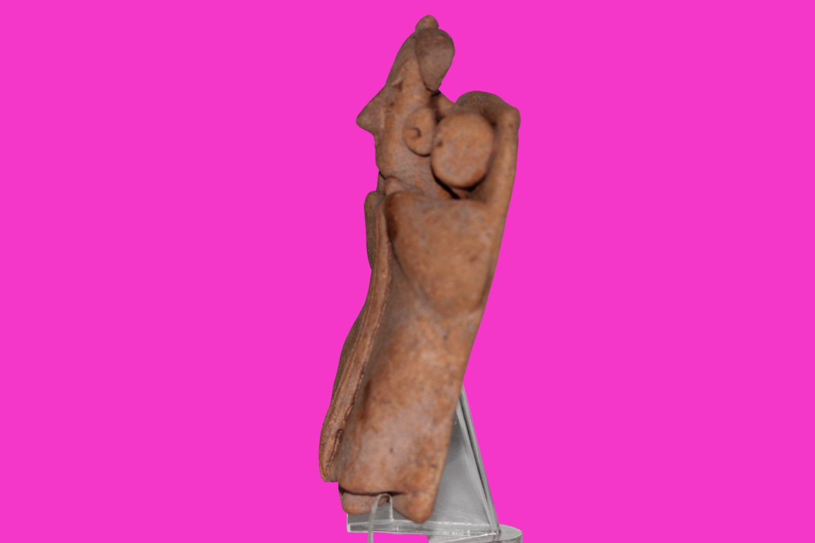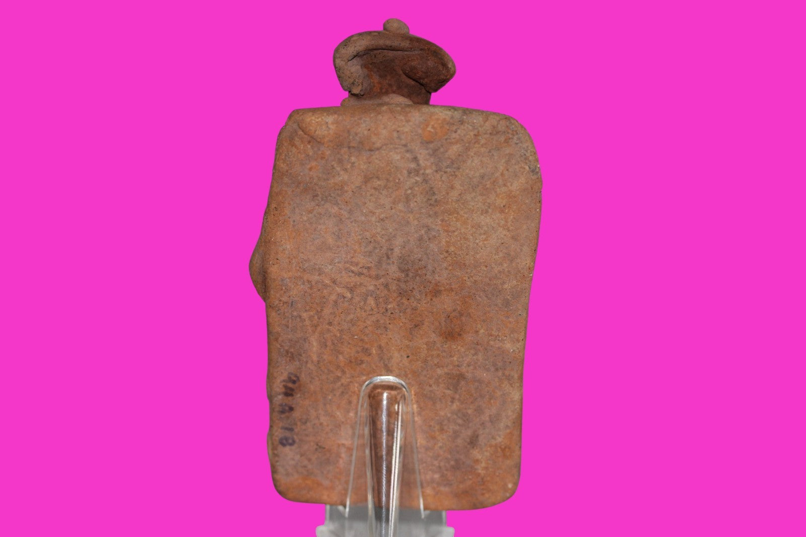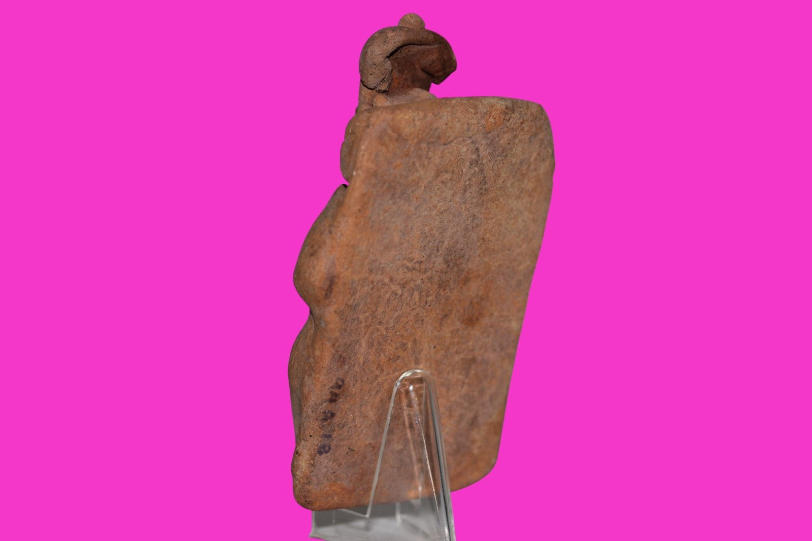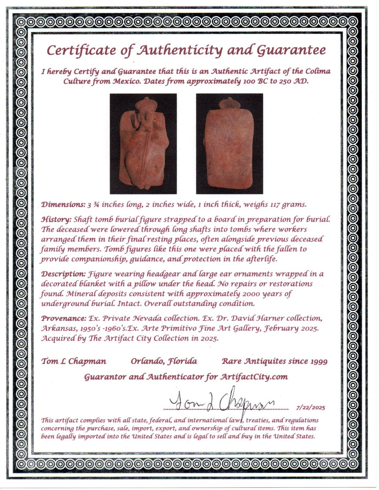 Dimensions: 3 ¾ inches long, 2 inches wide, 1 inch thick, weighs 117 grams. History: Shaft tomb burial figure strapped to a board in preparation for burial. The deceased were lowered through long shafts into tombs where workers arranged them in their final resting places, often alongside previous deceased family members. Tomb figures like this one were placed with the fallen to provide companionship, guidance, and protection in the afterlife. Description: Figure wearing headgear and large ear ornaments wrapped in a decorated blanket with a pillow under the head. No repairs or restorations found. Mineral deposits consistent with approximately 2000 years of underground burial. Intact. Overall outstanding condition. Provenance: Ex. Private Nevada collection. Ex. Dr. David Harner collection, Arkansas, 1950’s -1960’s.Ex. Arte Primitivo Fine Art Gallery, February 2025. Acquired by The Artifact City Collection in 2025.