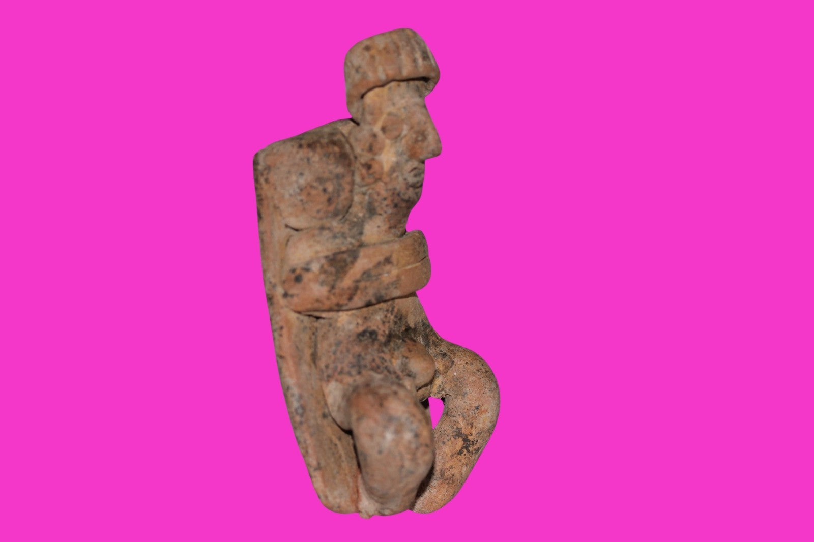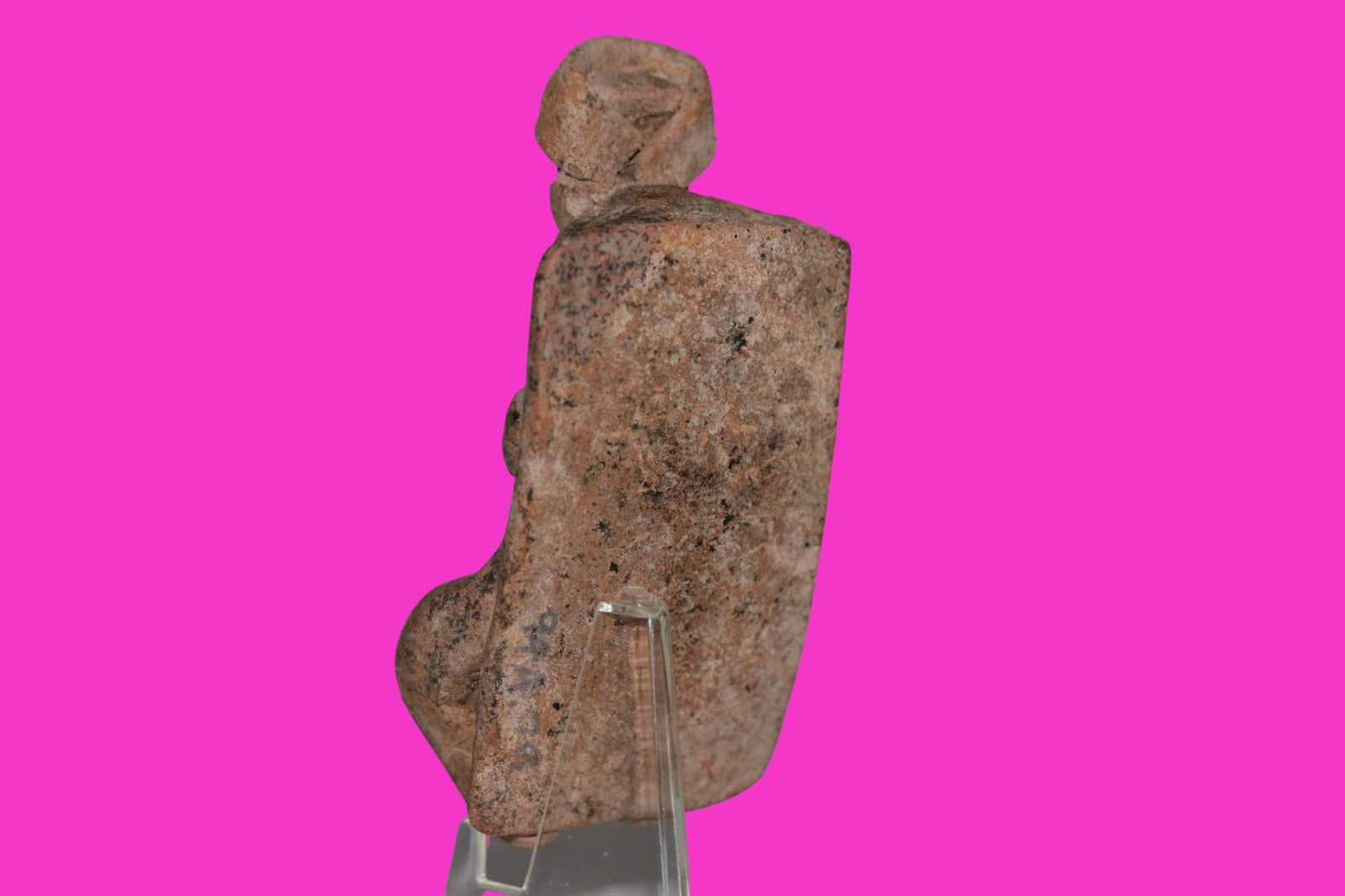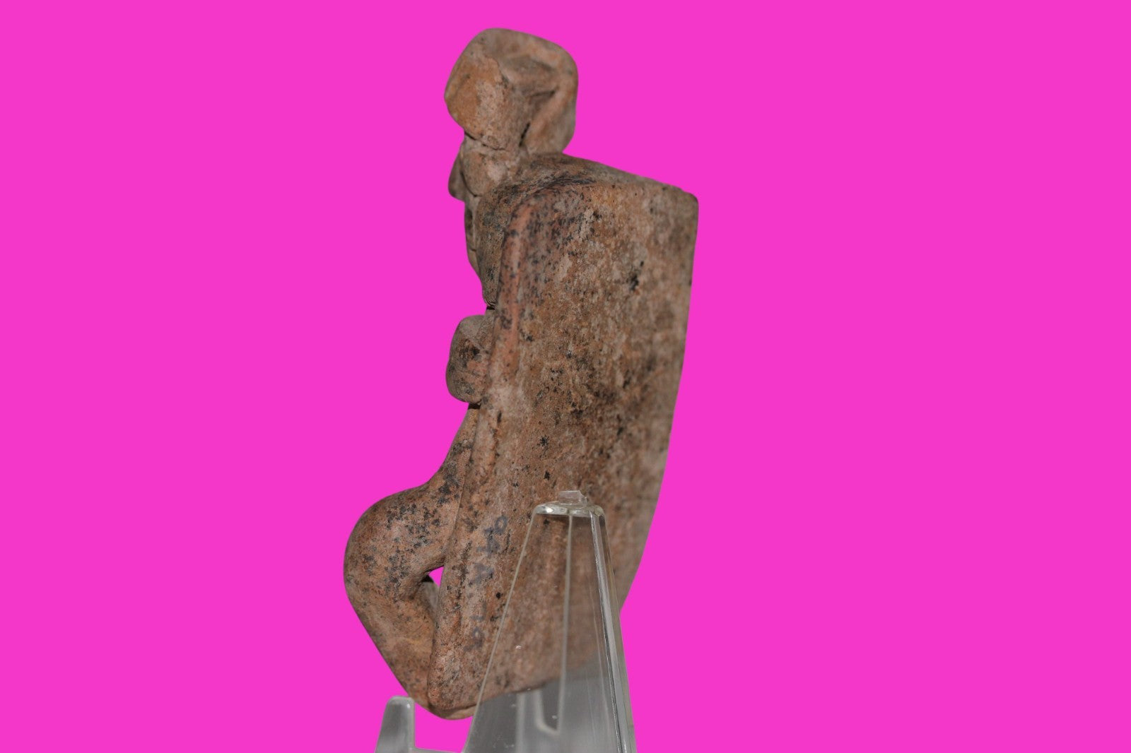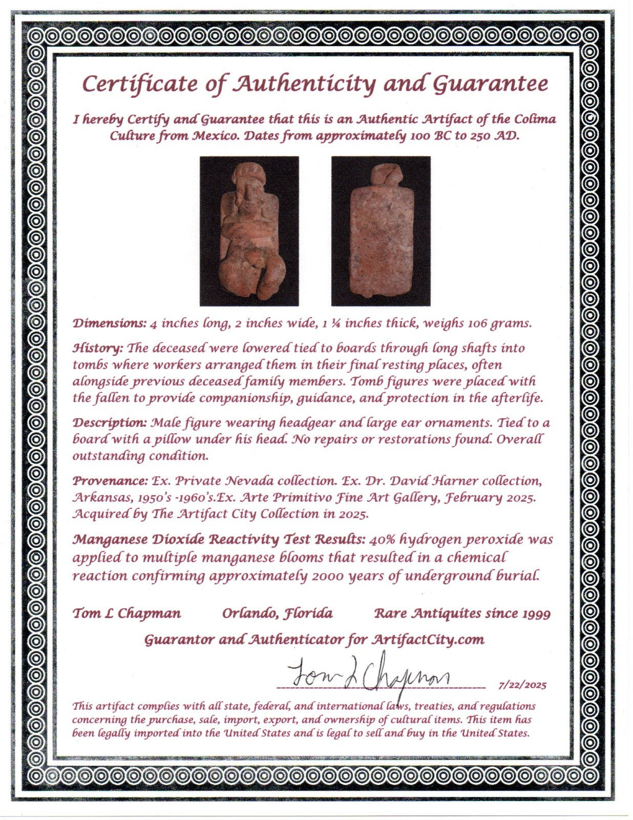Dimensions: 4 inches long, 2 inches wide, 1 ¼ inches thick, weighs 106 grams. History: The deceased were lowered tied to boards through long shafts into tombs where workers arranged them in their final resting places, often alongside previous deceased family members. Tomb figures were placed with the fallen to provide companionship, guidance, and protection in the afterlife. Description: Male figure wearing headgear and large ear ornaments. Tied to a board with a pillow under his head. No repairs or restorations found. Overall outstanding condition. Provenance: Ex. Private Nevada collection. Ex. Dr. David Harner collection, Arkansas, 1950’s -1960’s.Ex. Arte Primitivo Fine Art Gallery, February 2025. Acquired by The Artifact City Collection in 2025. Manganese Dioxide Reactivity Test Results: 40% hydrogen peroxide was applied to multiple manganese blooms that resulted in a chemical reaction confirming approximately 2000 years of underground burial.