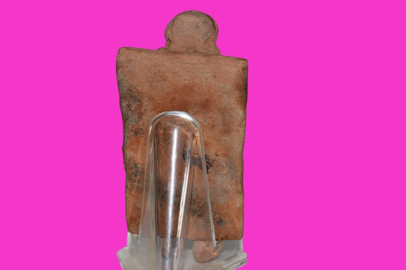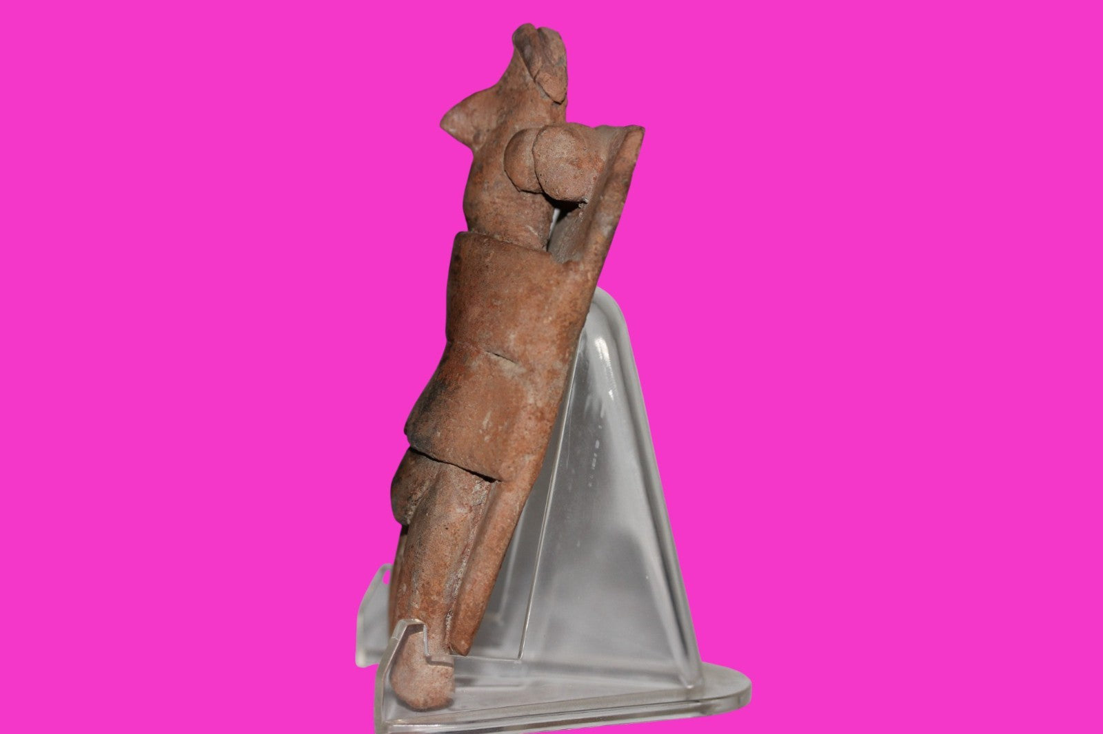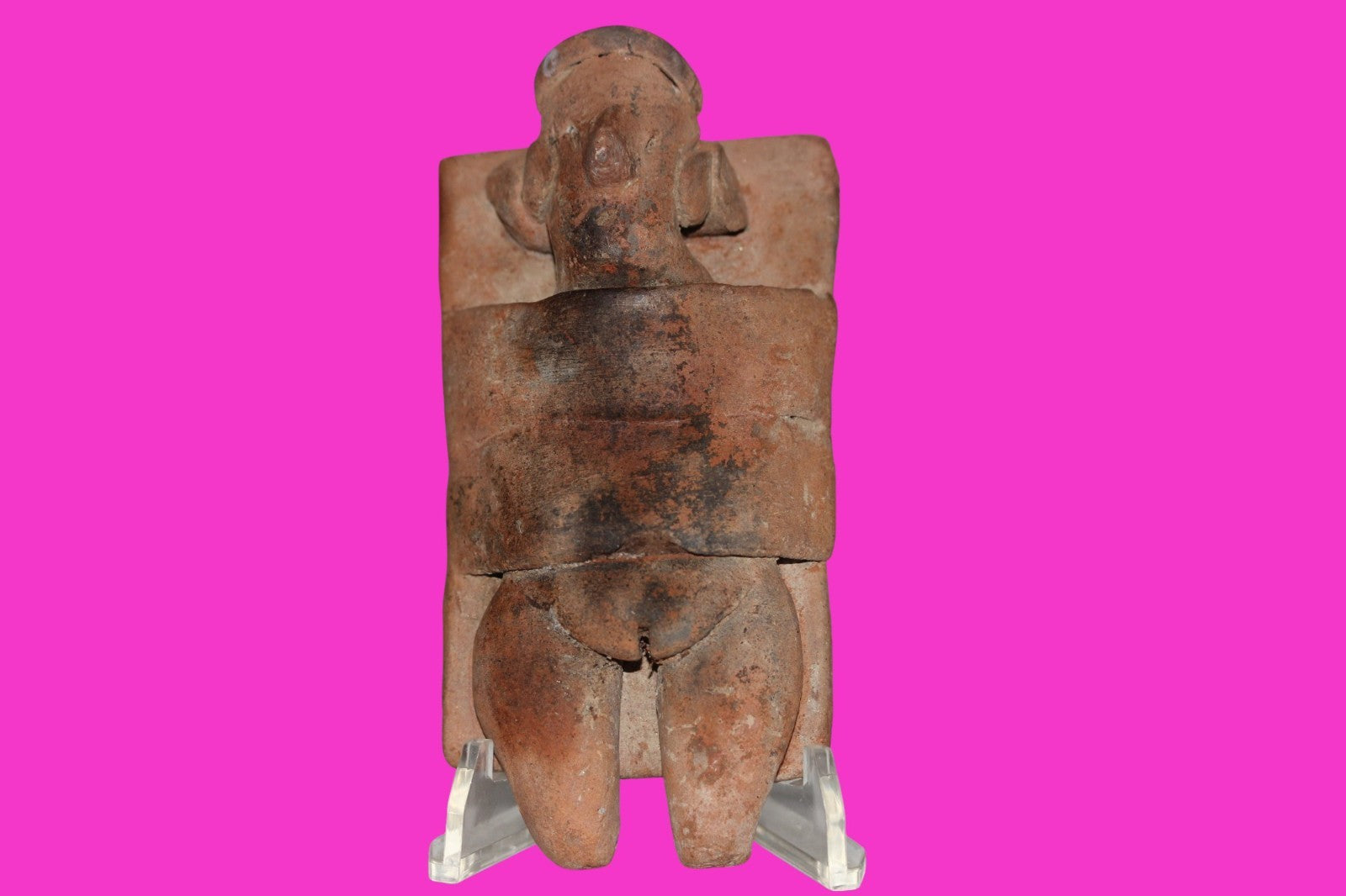 Dimensions: 4 ¼ inches long, 2 inches wide, 1 ¼ inches thick, weighs 122 grams. History: The deceased were lowered tied to boards through long shafts into tombs where workers arranged them in their final resting places, often alongside previous deceased family members. Tomb figures were placed with the fallen to provide companionship, guidance, and protection in the afterlife. Description: Female figure wearing headgear and large ear ornaments. Tied to a board with a pillow under her head. No repairs or restorations found. Extensive mineral deposits confirm approximately 2000 years of underground burial. Overall outstanding condition. Provenance: Ex. Private Nevada collection. Ex. Dr. David Harner collection, Arkansas, 1950’s -1960’s.Ex. Arte Primitivo Fine Art Gallery, February 2025. Acquired by The Artifact City Collection in 2025.