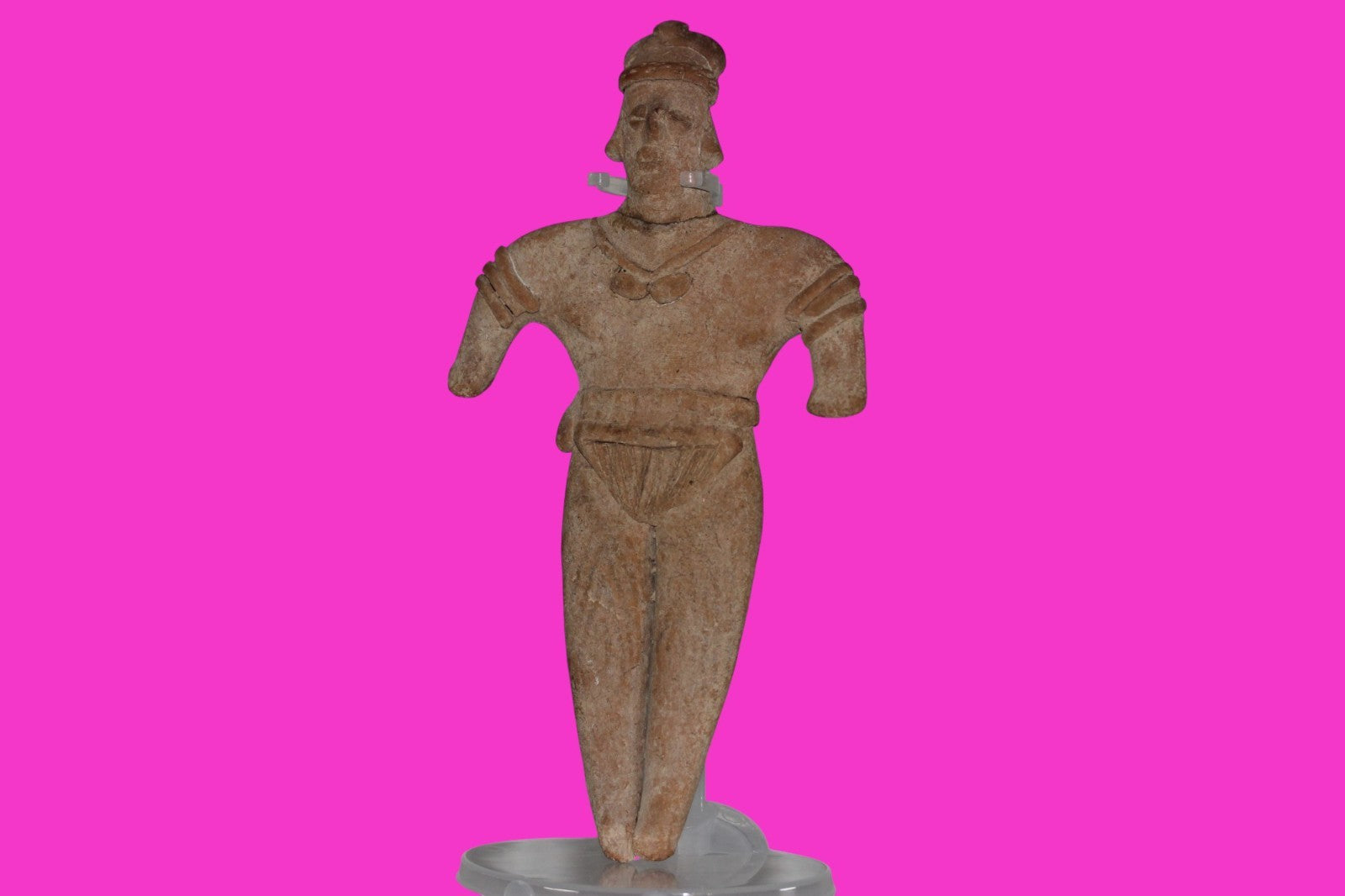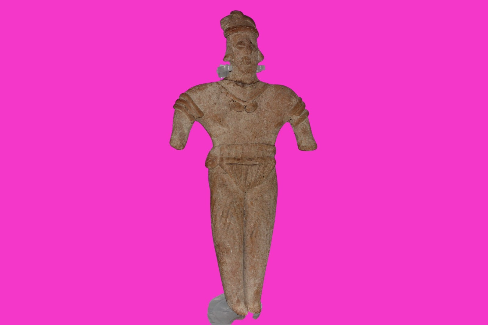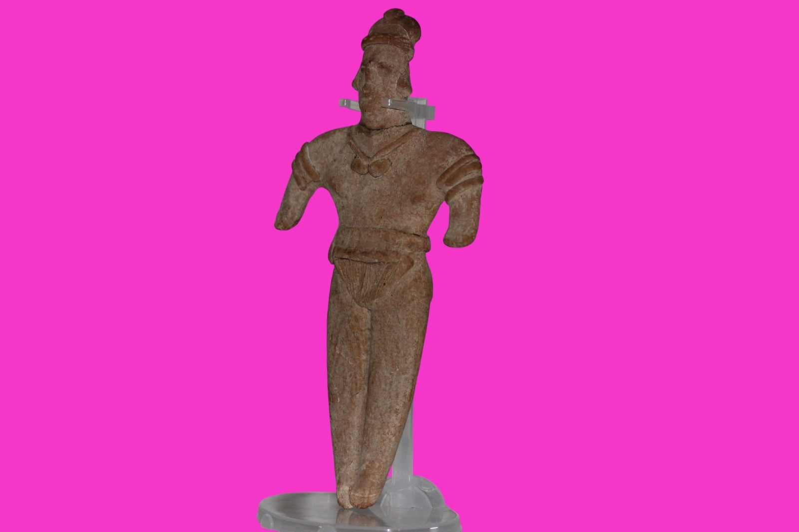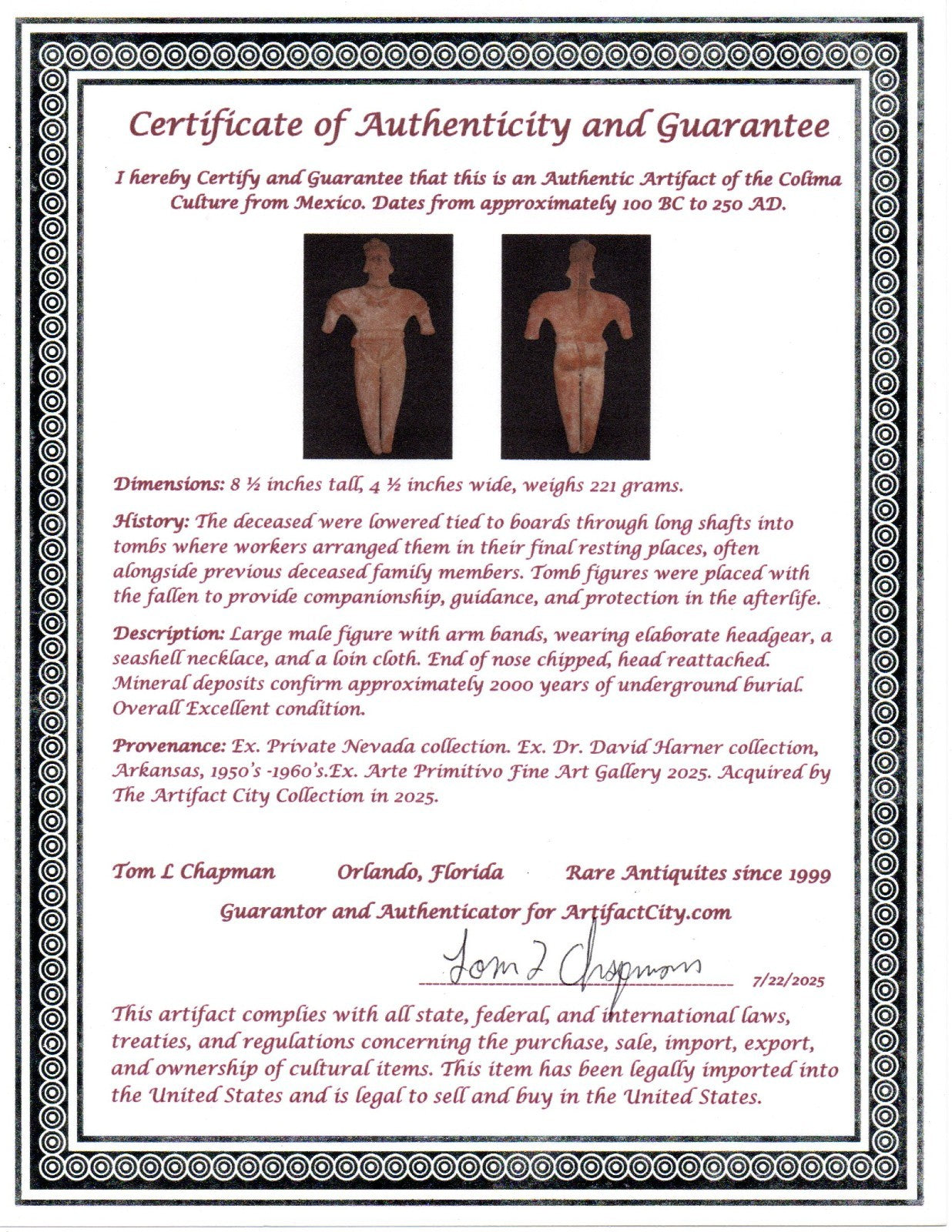 Dimensions: 8 ½ inches tall, 4 ½ inches wide, weighs 221 grams. History: The deceased were lowered tied to boards through long shafts into tombs where workers arranged them in their final resting places, often alongside previous deceased family members. Tomb figures were placed with the fallen to provide companionship, guidance, and protection in the afterlife. Description: Large male figure with arm bands, wearing elaborate headgear, a seashell necklace, and a loin cloth. End of nose chipped, head reattached. Mineral deposits confirm approximately 2000 years of underground burial. Overall Excellent condition. Provenance: Ex. Private Nevada collection. Ex. Dr. David Harner collection, Arkansas, 1950’s -1960’s.Ex. Arte Primitivo Fine Art Gallery 2025. Acquired by The Artifact City Collection in 2025.
