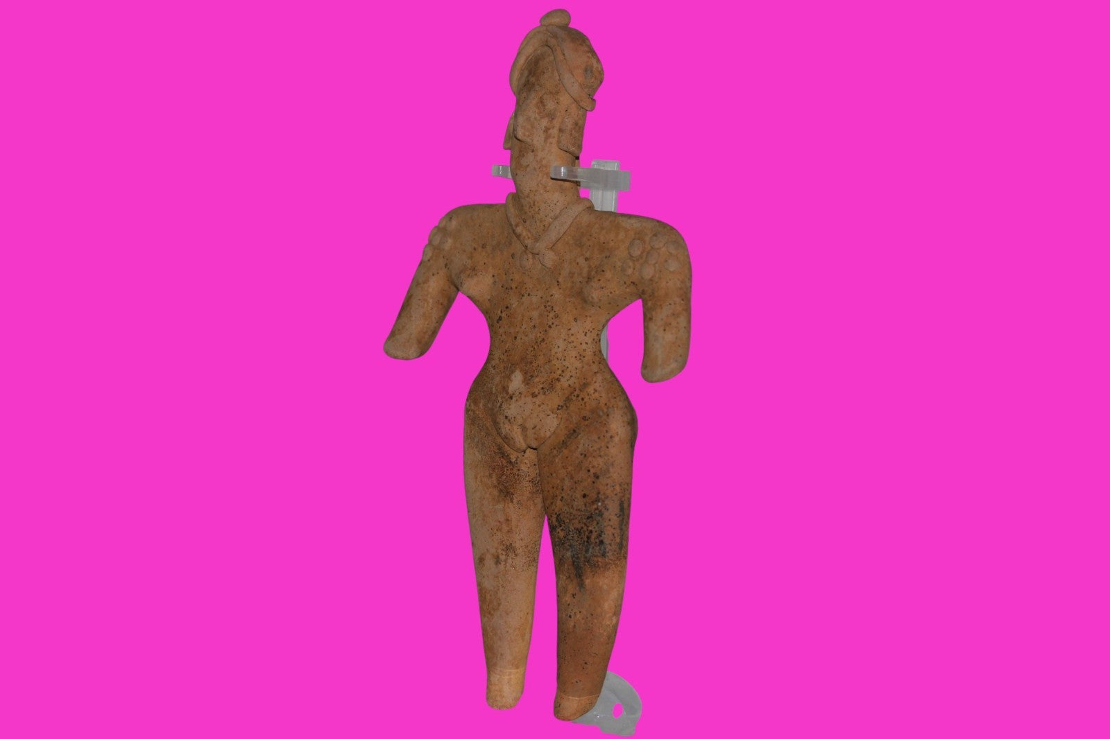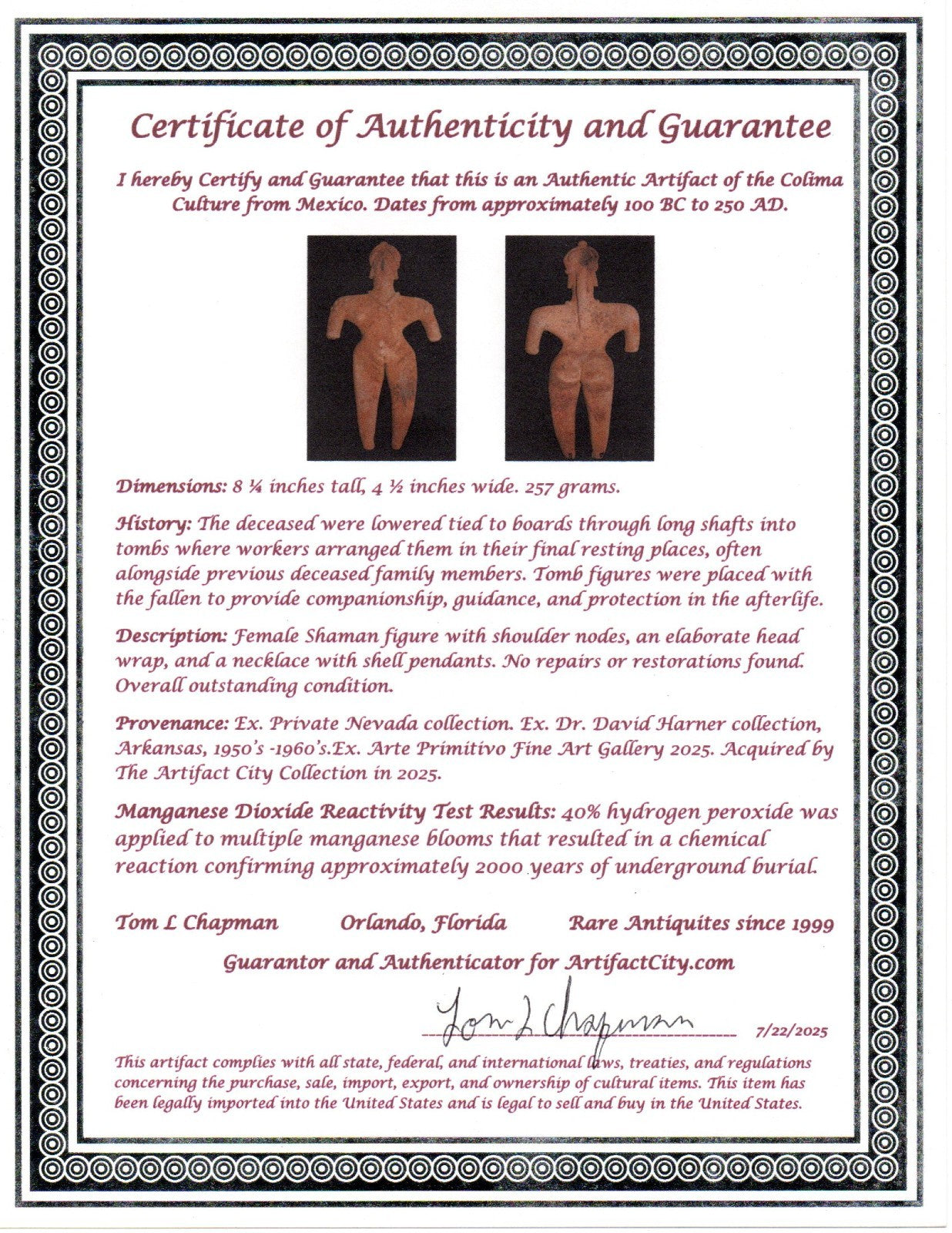 Dimensions: 8 ¼ inches tall, 4 ½ inches wide. 257 grams. History: The deceased were lowered tied to boards through long shafts into tombs where workers arranged them in their final resting places, often alongside previous deceased family members. Tomb figures were placed with the fallen to provide companionship, guidance, and protection in the afterlife. Description: Female Shaman figure with shoulder nodes, an elaborate head wrap, and a necklace with shell pendants. No repairs or restorations found. Overall outstanding condition. Provenance: Ex. Private Nevada collection. Ex. Dr. David Harner collection, Arkansas, 1950’s -1960’s.Ex. Arte Primitivo Fine Art Gallery 2025. Acquired by The Artifact City Collection in 2025. Manganese Dioxide Reactivity Test Results: 40% hydrogen peroxide was applied to multiple manganese blooms that resulted in a chemical reaction confirming approximately 2000 years of underground burial.