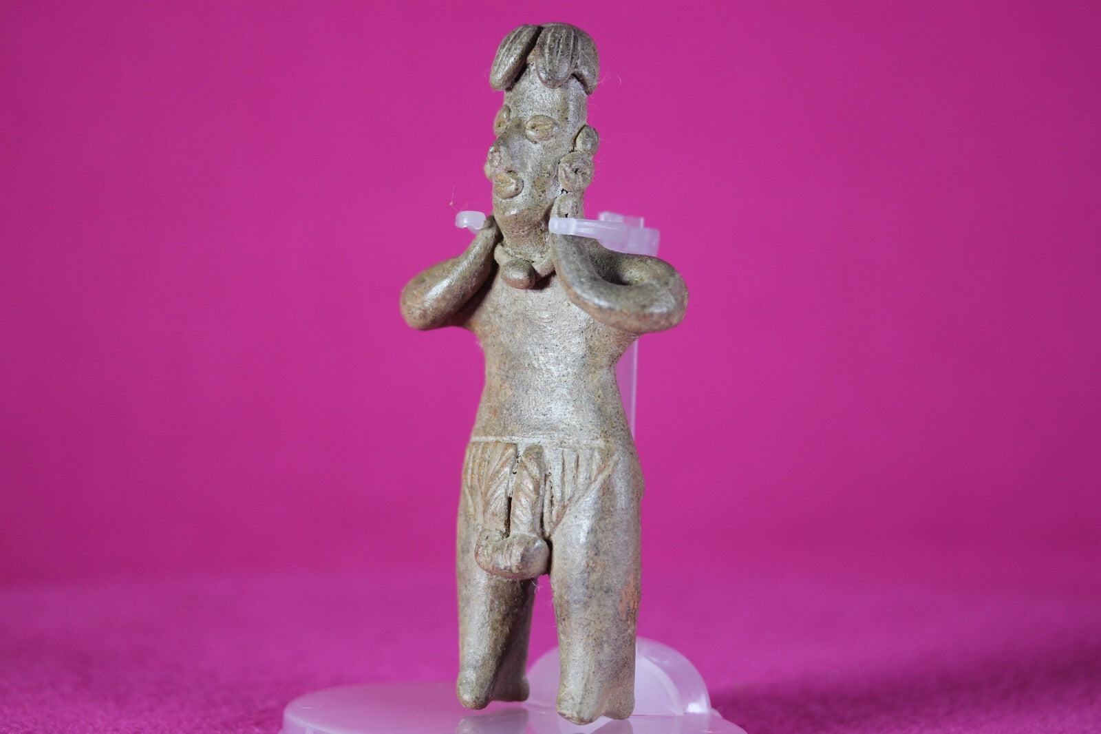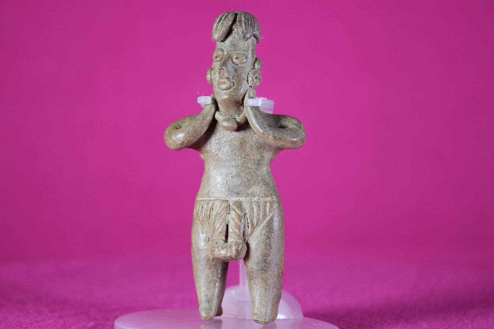 Chipped nose. The Colima culture buried their fallen with figurines like this stunning example so the dead would have companionship in the afterlife. The Colima utilized shaft tombs extensively. A shaft was dug a few feet and a tomb dug out at the bottom of the shaft. The deceased was gently lowered down the shaft into the tomb. The burial buddy was lowered with the deceased so they would not be lonely in the afterlife. Pretty cool eh?