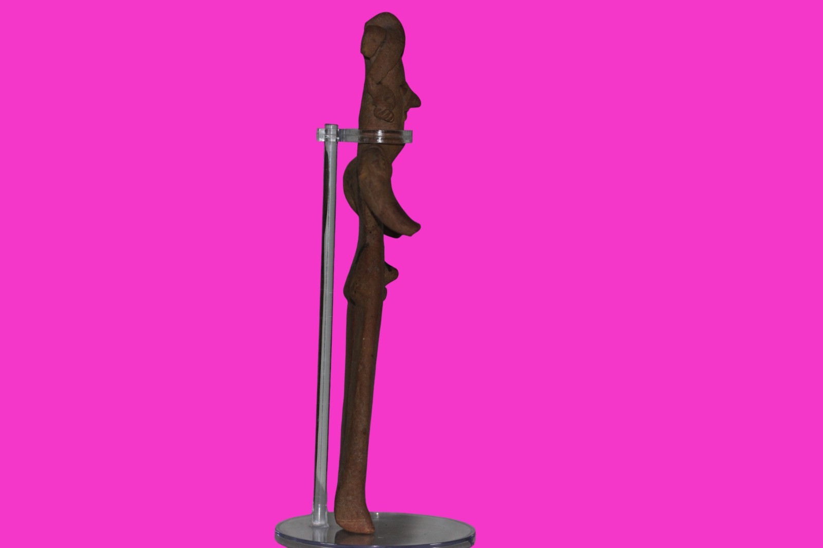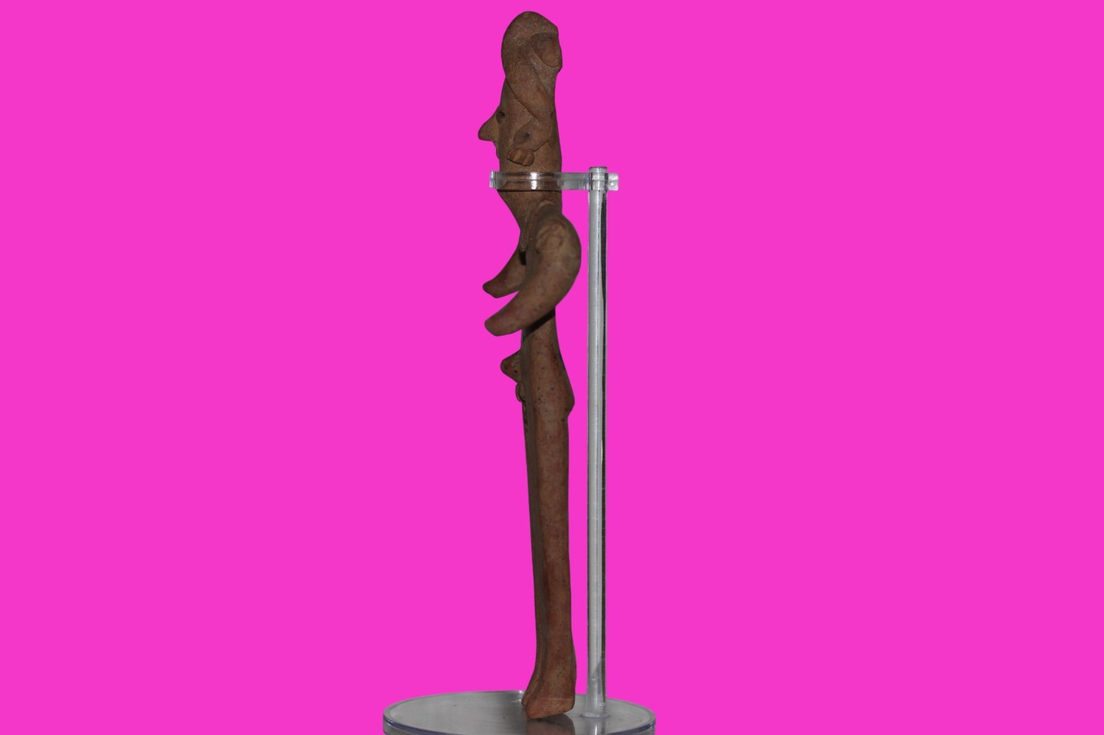 Dimensions: 9 inches tall, 5 ¼ inches wide. 238 grams.History: The deceased were lowered tied to boards through long shafts into tombs where workers arranged them in their final resting places, often alongside previous deceased family members. Tomb figures were placed with the fallen to provide companionship, guidance, and protection in the afterlife.Description: Very tall male figure with decorated shoulders, wearing a headwrap, large ear ornaments, and a fancy necklace. Traces of a painted black belt remain on his back. No repairs or restorations found. Overall outstanding condition.Provenance: Ex. Private Nevada collection. Ex. Dr. David Harner collection, Arkansas, 1950’s -1960’s.Ex. Arte Primitivo Fine Art Gallery, February 2025. Acquired by The Artifact City Collection in 2025.Manganese Dioxide Reactivity Test Results: 40% hydrogen peroxide was applied to multiple manganese blooms that resulted in a chemical reaction confirming approximately 2000 years of underground burial.