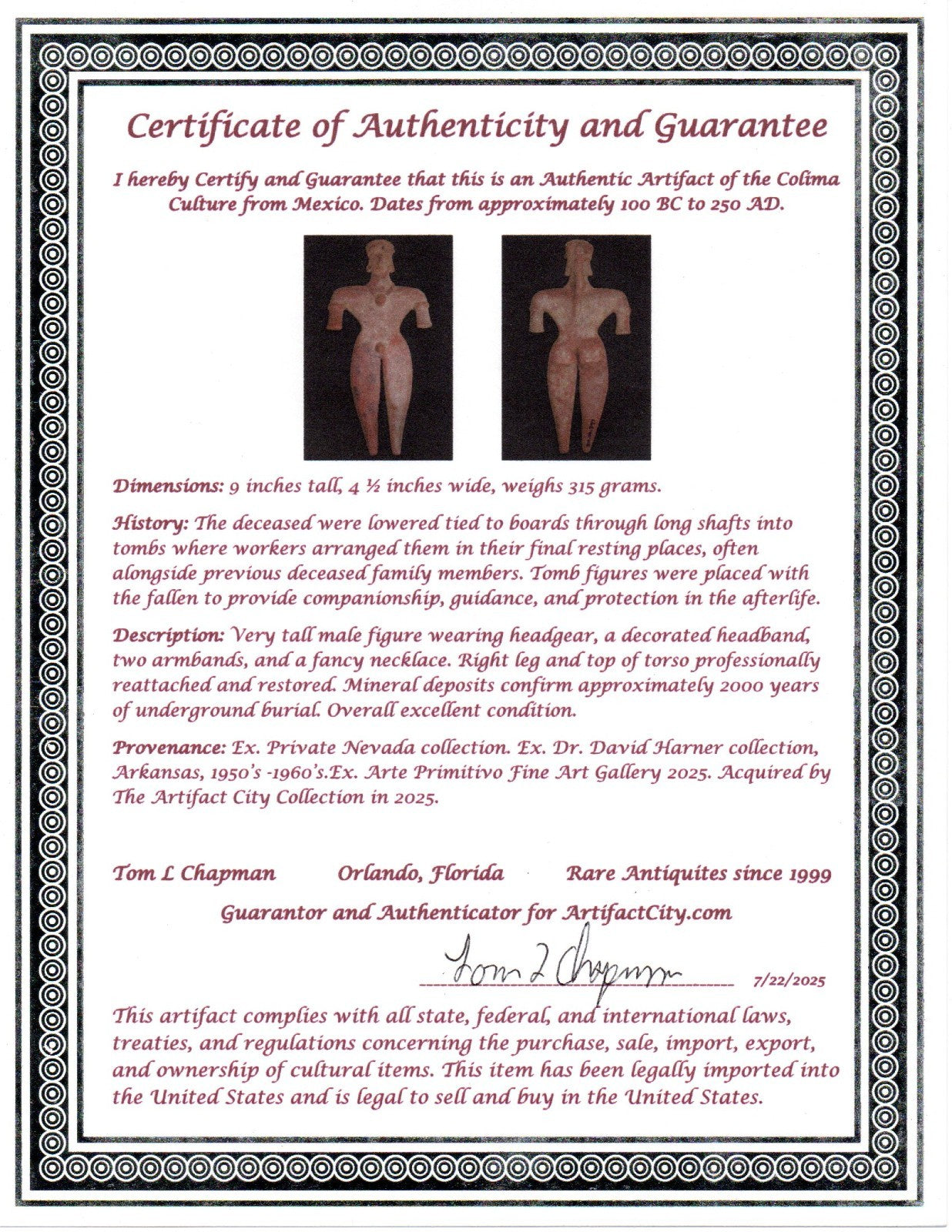 Dimensions: 9 inches tall, 4 ½ inches wide, weighs 315 grams. History: The deceased were lowered tied to boards through long shafts into tombs where workers arranged them in their final resting places, often alongside previous deceased family members. Tomb figures were placed with the fallen to provide companionship, guidance, and protection in the afterlife. Description: Very tall male figure wearing headgear, a decorated headband, two armbands, and a fancy necklace. Right leg and top of torso professionally reattached and restored. Mineral deposits confirm approximately 2000 years of underground burial. Overall excellent condition. Provenance: Ex. Private Nevada collection. Ex. Dr. David Harner collection, Arkansas, 1950’s -1960’s.Ex. Arte Primitivo Fine Art Gallery 2025. Acquired by The Artifact City Collection in 2025.