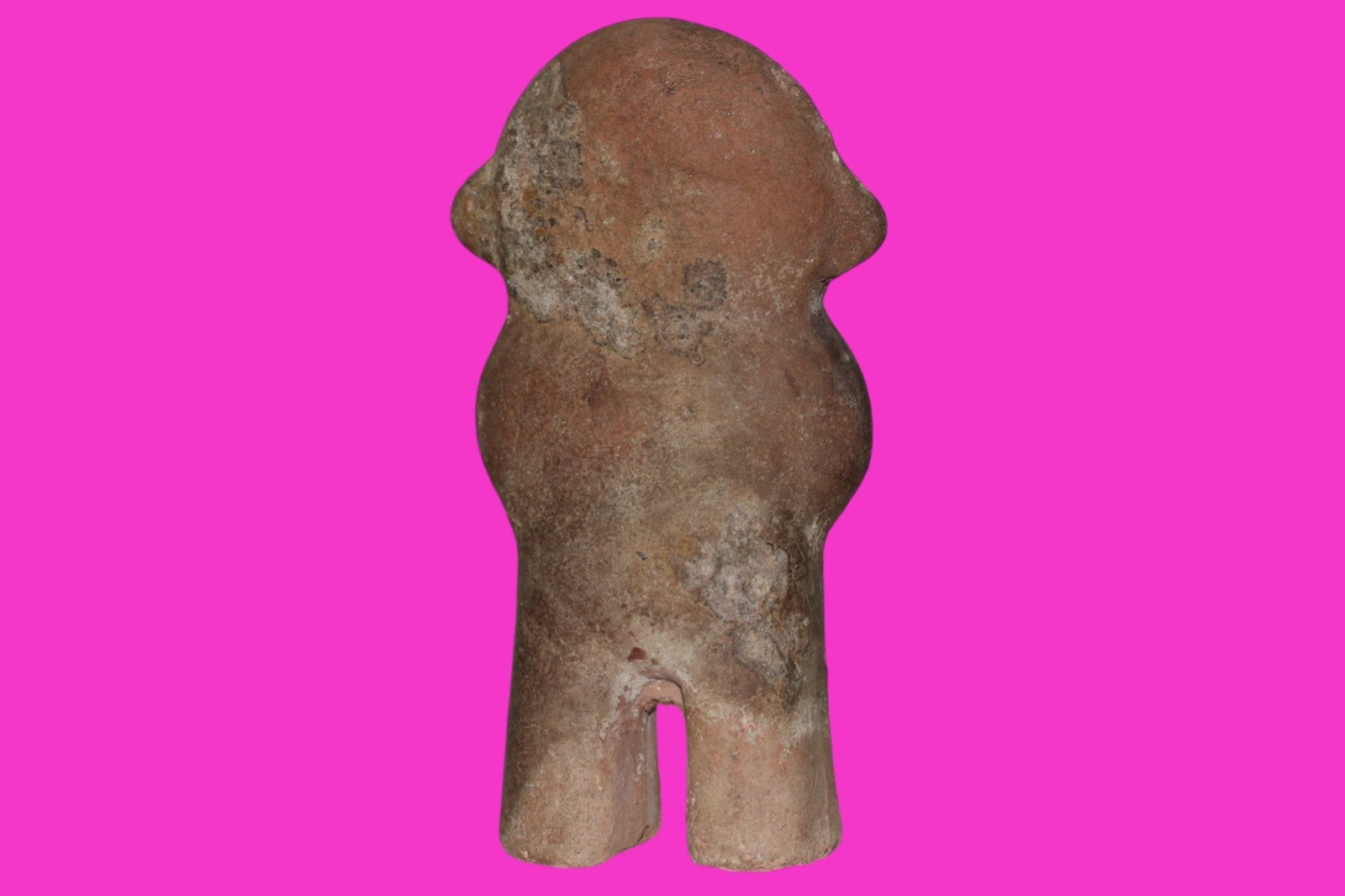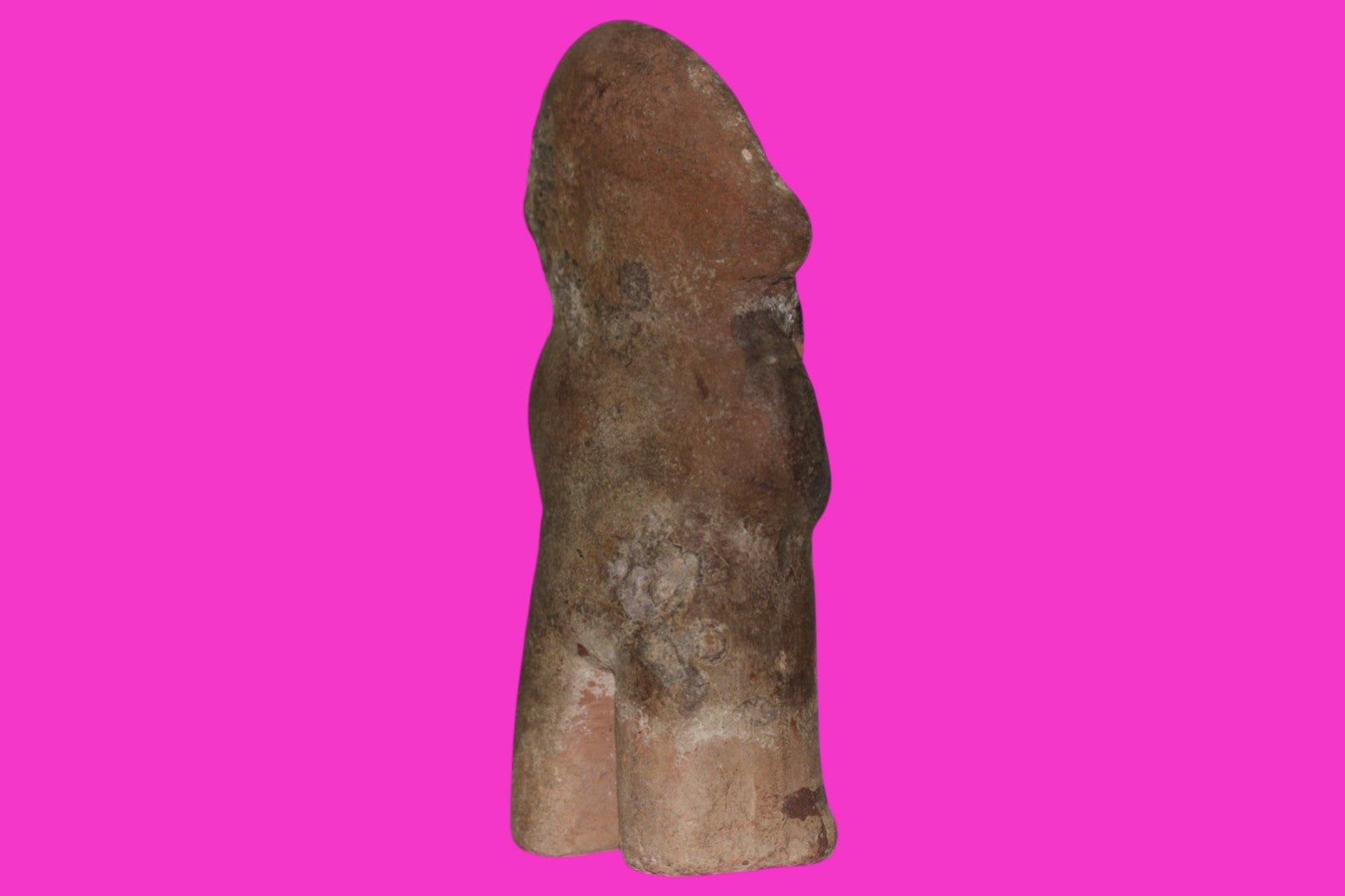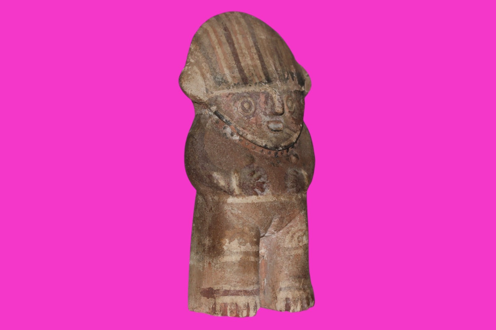 Dimensions: 8 ¾ inches tall, 4 inches wide, weighs 651 grams.Description: Female Cuchimilco figure with arms folded and hands over his abdomen. No repairs or restorations found. Traces of red, black, and white pigments. Small chips, abrasions, and erosion from underground burial, otherwise intact. Overall very good condition.Provenance: Ex. Kevin Philips, collected in the 1990’s, gifted to H. Hatcher III in 2000, Acquired by John McIntosh, MSE, MBA of Ancient Artifacts & Treasures, Winter Park, Florida in 2023. Consigned to The PreColumbian Collection in 2025.