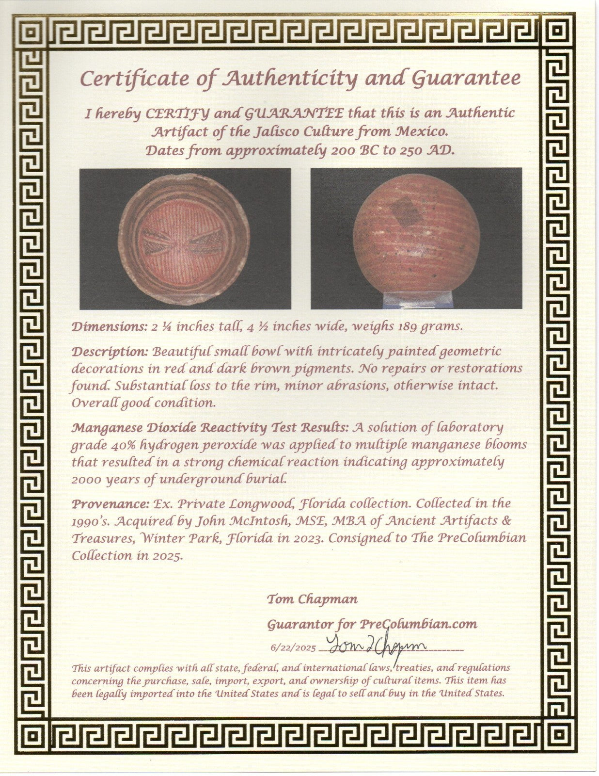 Dimensions: 2 ¼ inches tall, 4 ½ inches wide, weighs 189 grams.Description: Beautiful small bowl with intricately painted geometric decorations in red and dark brown pigments. No repairs or restorations found. Substantial loss to the rim, minor abrasions, otherwise intact. Overall good condition.Manganese Dioxide Reactivity Test Results: A solution of laboratory grade 40% hydrogen peroxide was applied to multiple manganese blooms that resulted in a strong chemical reaction indicating approximately 2000 years of underground burial.Provenance: Ex. Private Longwood, Florida collection. Collected in the 1990’s. Acquired by John McIntosh, MSE, MBA of Ancient Artifacts & Treasures, Winter Park, Florida in 2023. Consigned to The PreColumbian Collection in 2025.