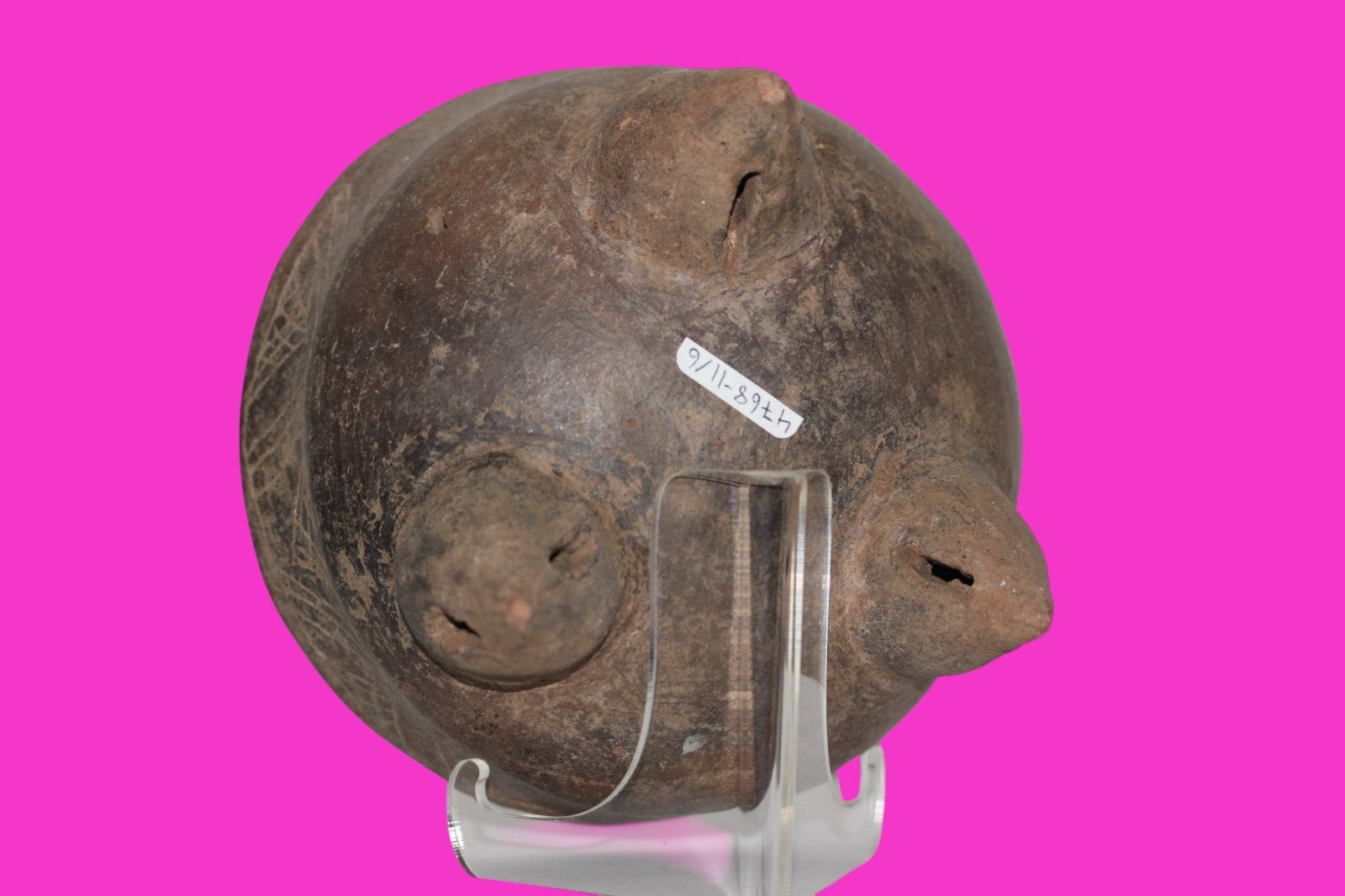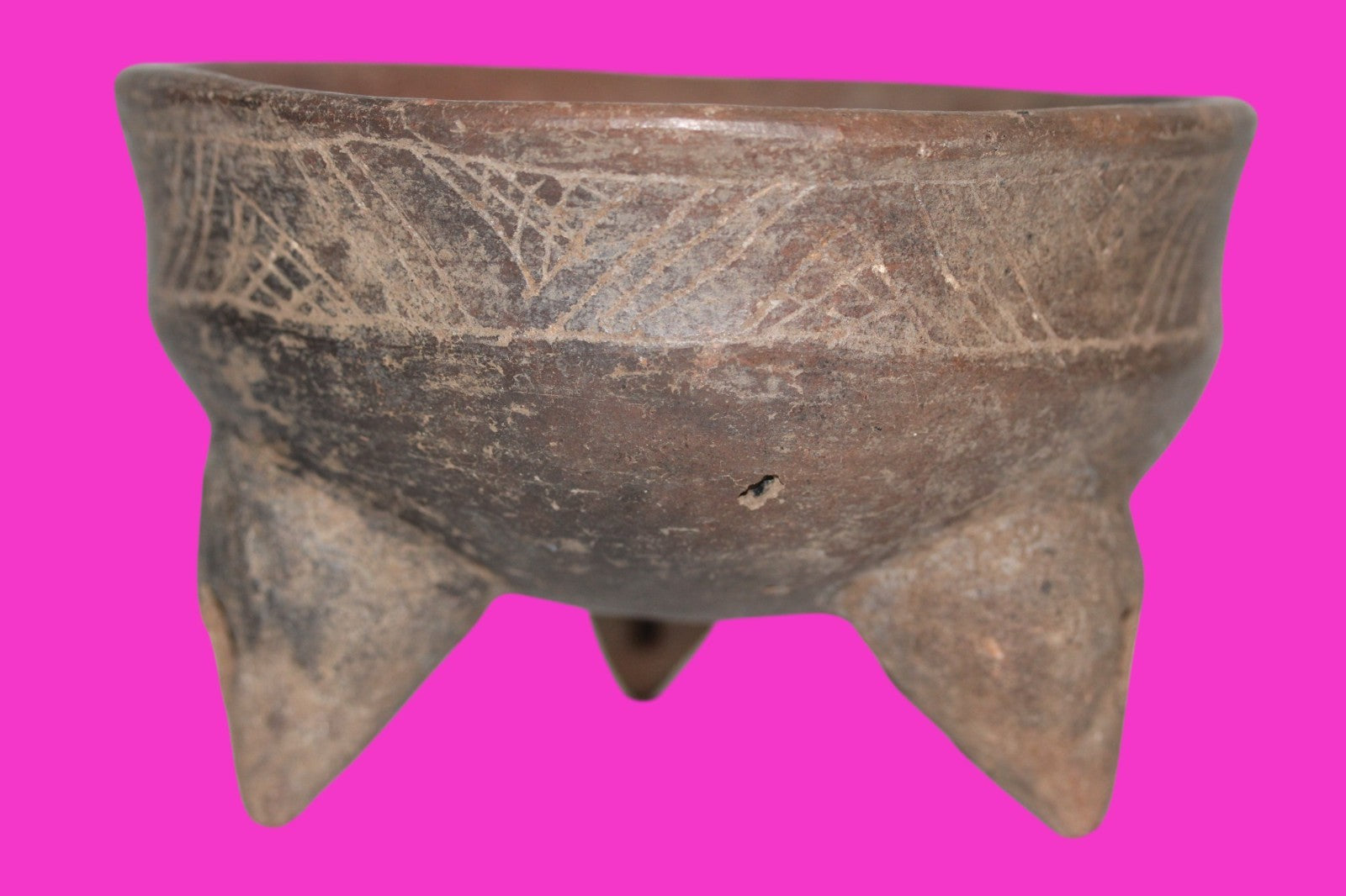 Dimensions: 3 ¼ inches tall, 5 ½ inches wide, weighs 421 grams.Description: Working rattle tripod bowl decorated with geometric incisions. Mineral deposits indicative of several centuries of underground burial. Stable age crack on one side. Otherwise intact. Overall excellent condition.Provenance: Ex. Estate of William G. Butler, NYC, acquired in the 1970’s. Ex. Arte Primitivo Fine Art Gallery, Downtown Manhattan, New York City, Ex. John McIntosh, MSE, MBA of Ancient Artifacts & Treasures, Winter Park, Florida. Consigned to The Artifact City Collection 2025.