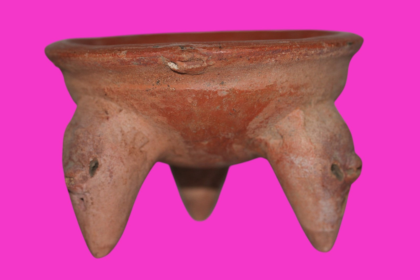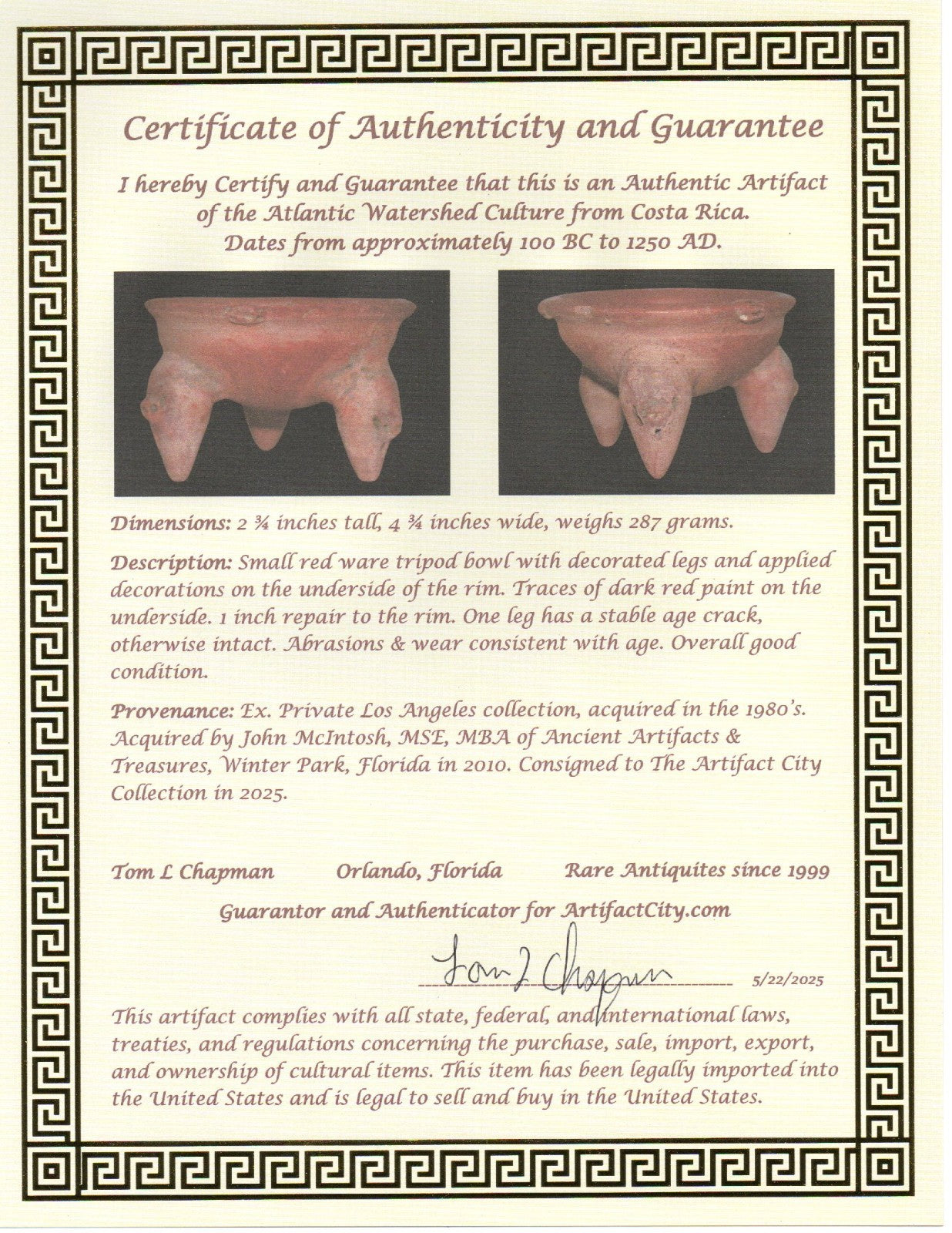 Dimensions: 2 ¾ inches tall, 4 ¾ inches wide, weighs 287 grams. Description: Small red ware tripod bowl with decorated legs and applied decorations on the underside of the rim. Traces of dark red paint on the underside. 1 inch repair to the rim. One leg has a stable age crack, otherwise intact. Abrasions & wear consistent with age. Overall good condition. Provenance: Ex. Private Los Angeles collection, acquired in the 1980’s. Acquired by John McIntosh, MSE, MBA of Ancient Artifacts & Treasures, Winter Park, Florida in 2010. Consigned to The Artifact City Collection in 2025.